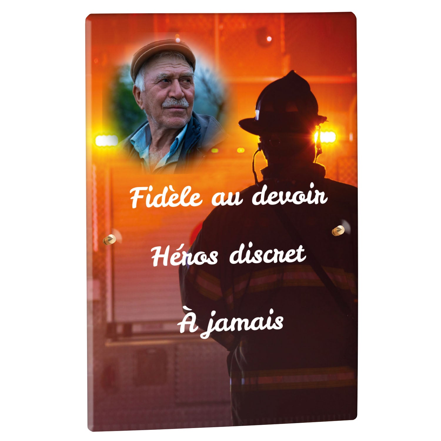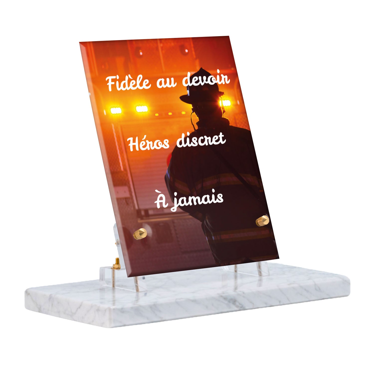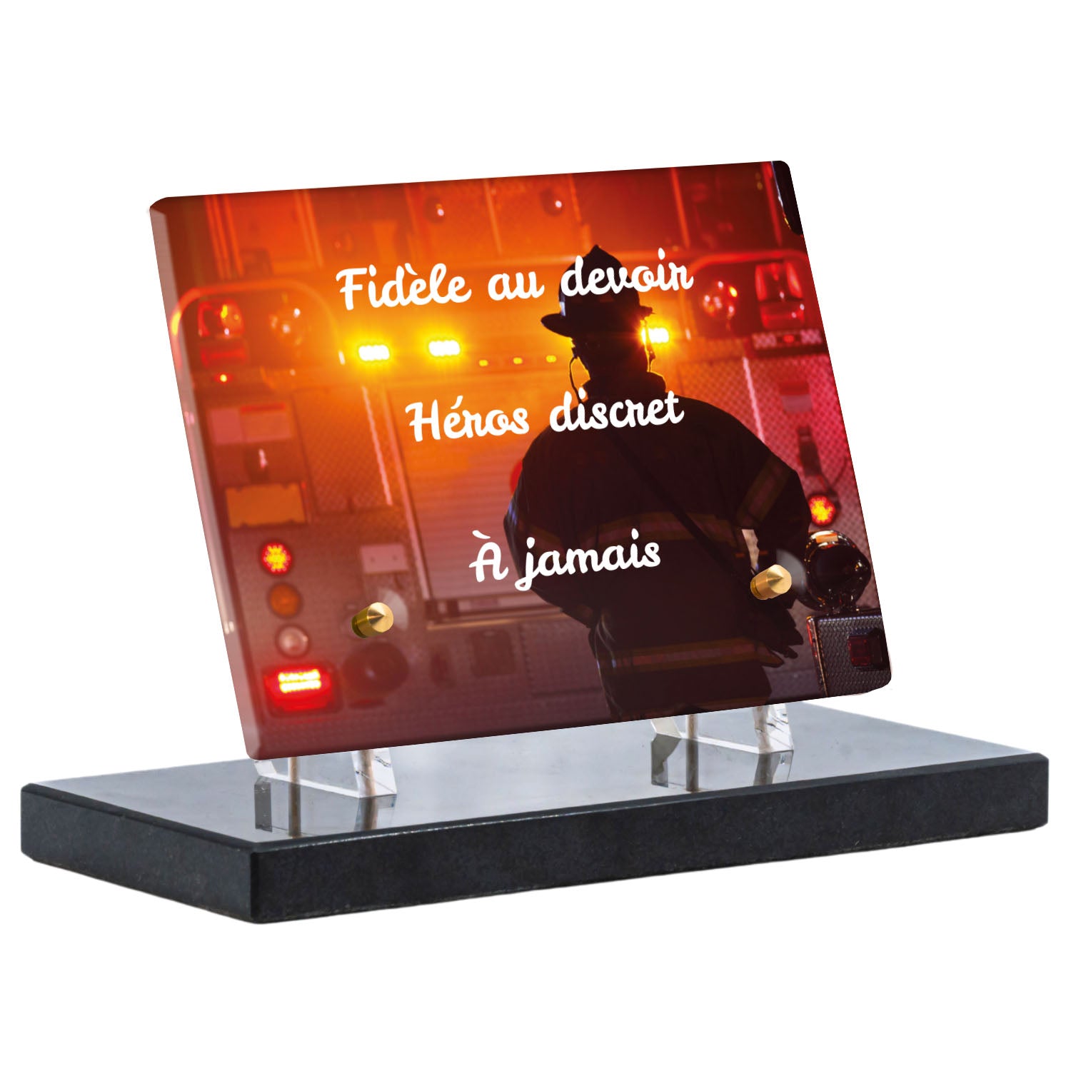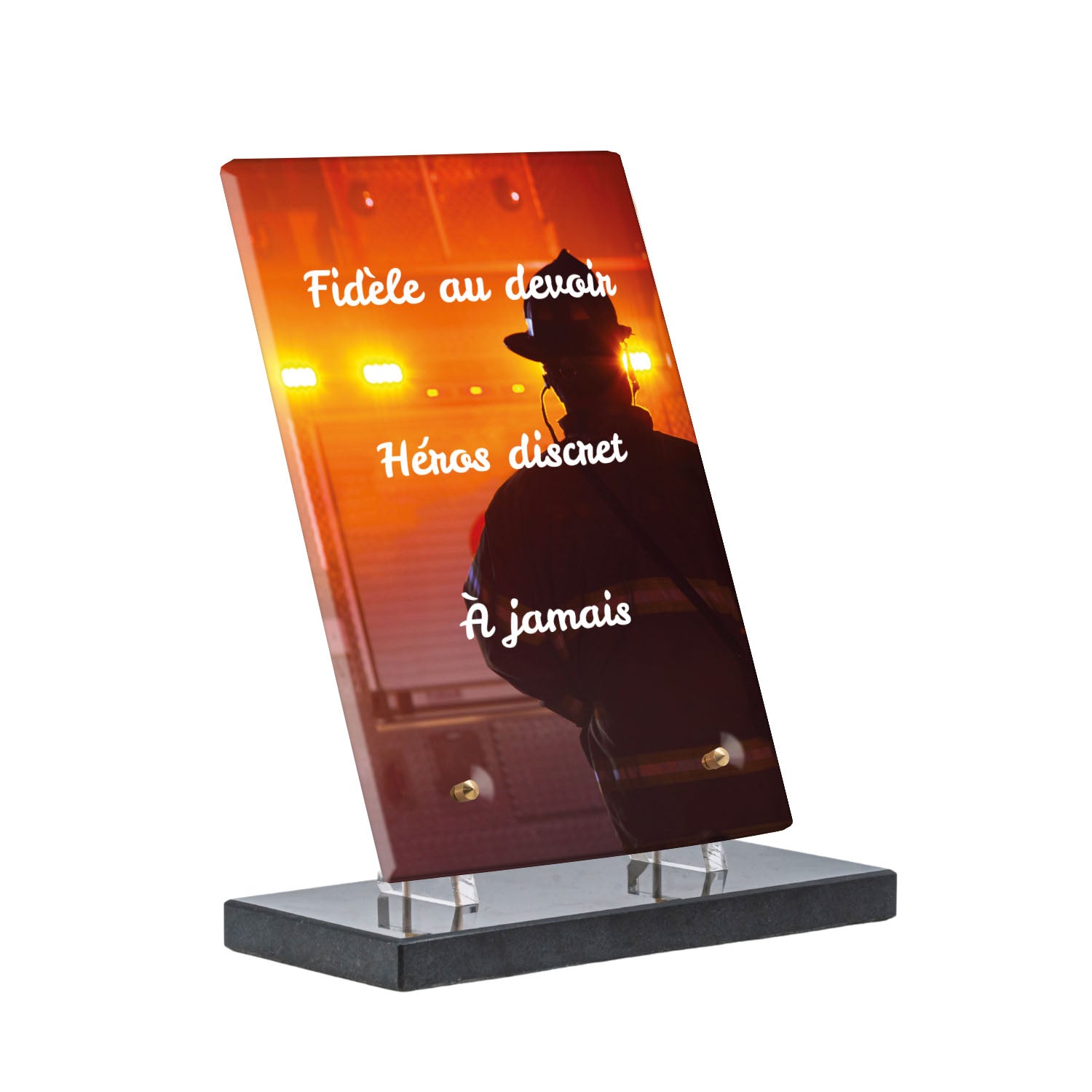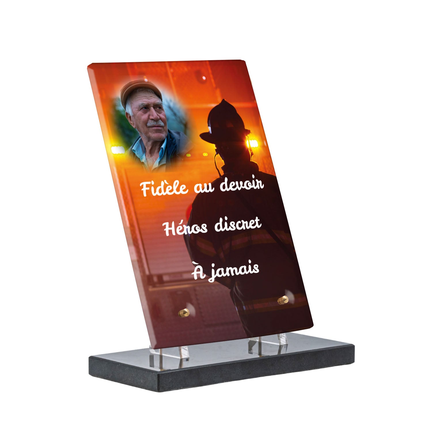 Cette plaque funéraire personnalisée rend hommage aux pompiers avec un design sobre et élégant. Réalisée en plexiglas, elle présente un visuel gravé représentant un casque de pompier et une lance d'incendie, symboles forts du courage et du dévouement. Ce modèle combine à la fois la modernité et le respect, faisant de cette plaque mortuaire un choix parfait pour une commémoration durable.