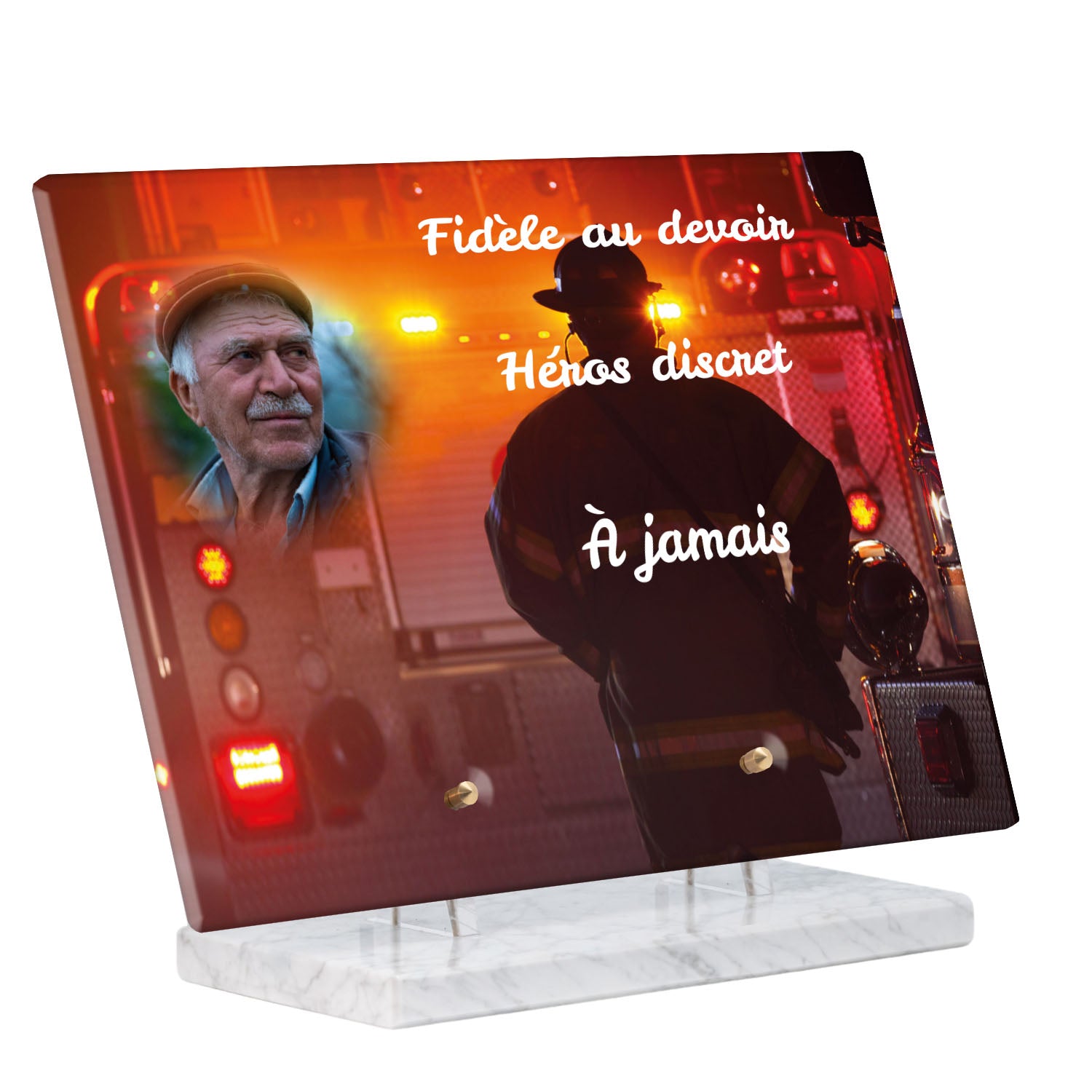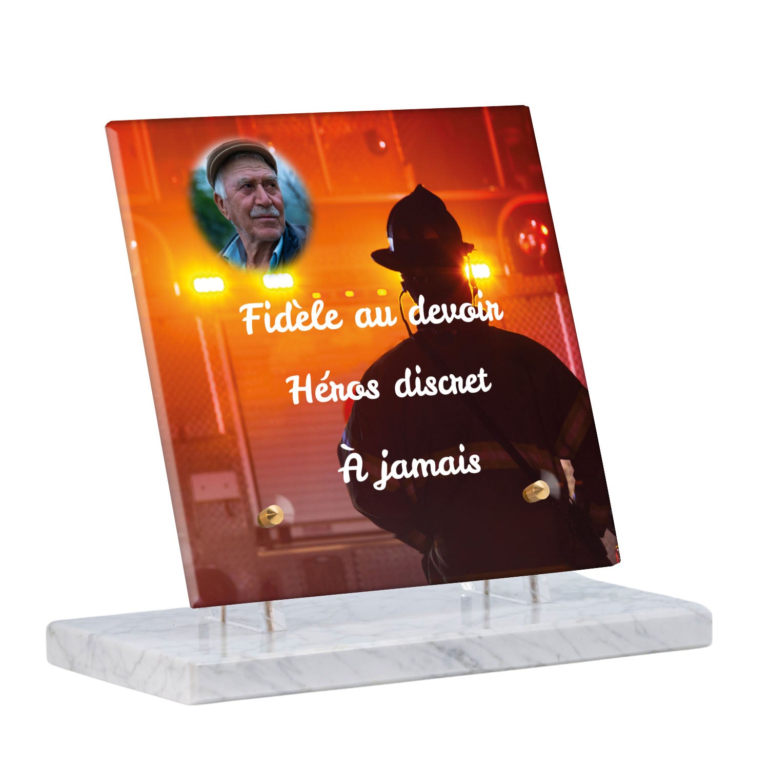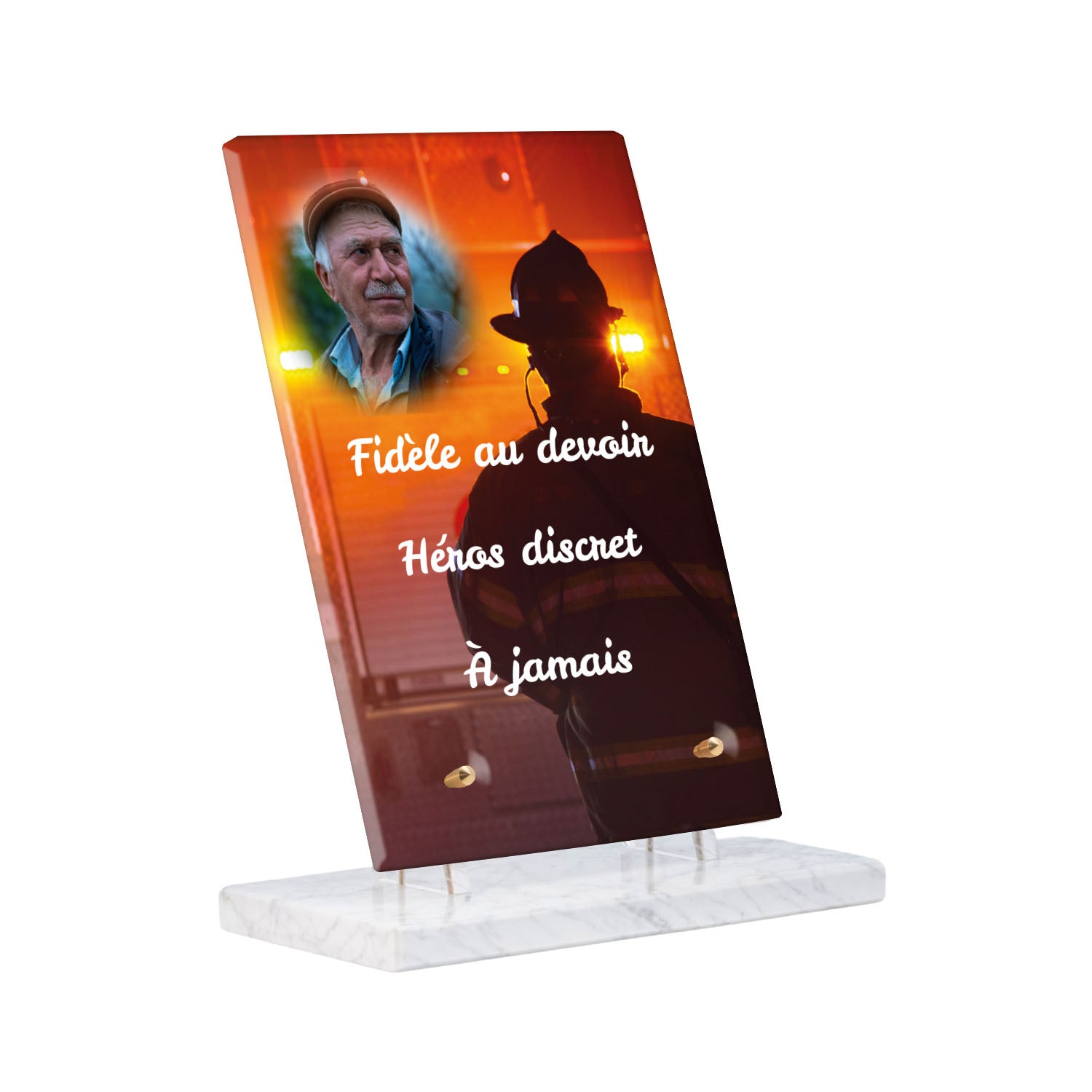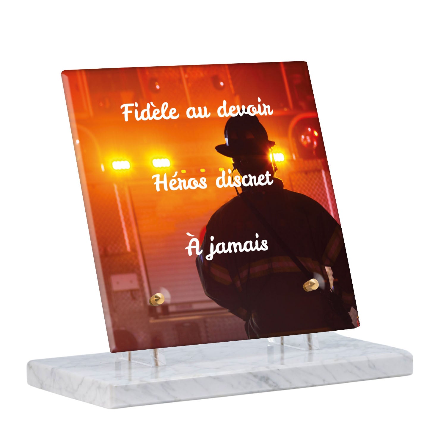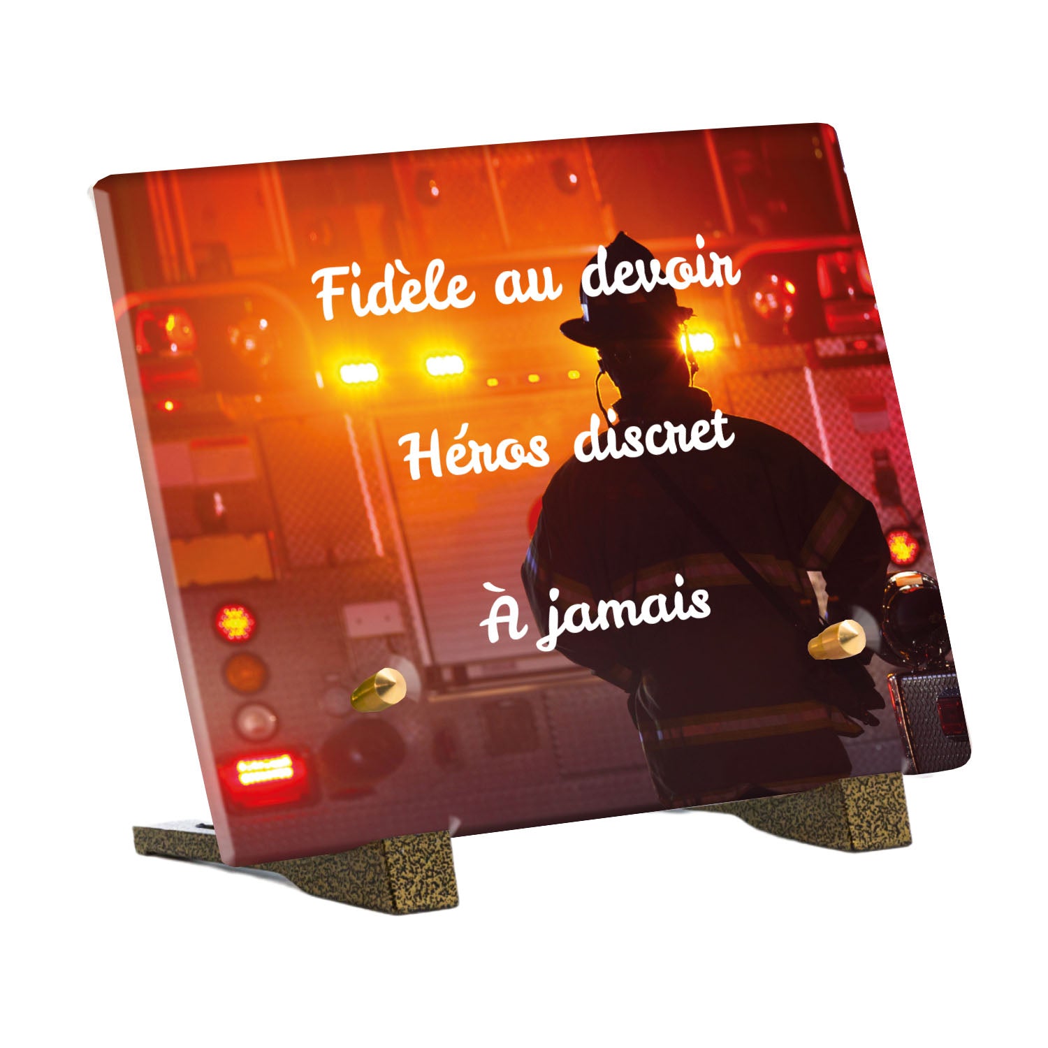 Cette plaque funéraire personnalisée rend hommage aux pompiers avec un design sobre et élégant. Réalisée en plexiglas, elle présente un visuel gravé représentant un casque de pompier et une lance d'incendie, symboles forts du courage et du dévouement. Ce modèle combine à la fois la modernité et le respect, faisant de cette plaque mortuaire un choix parfait pour une commémoration durable.