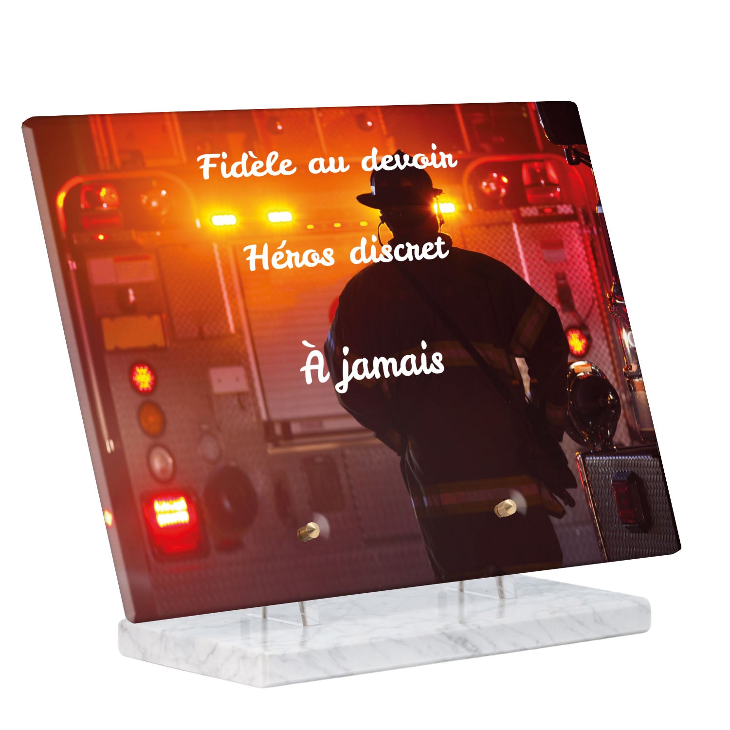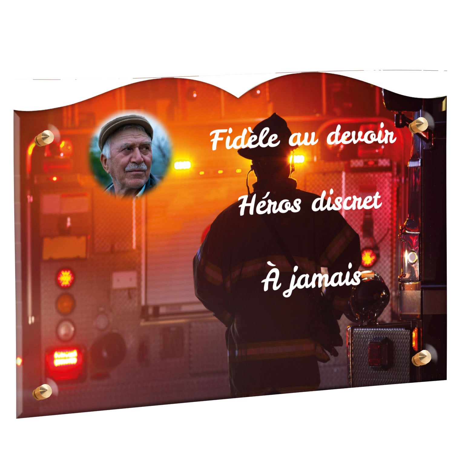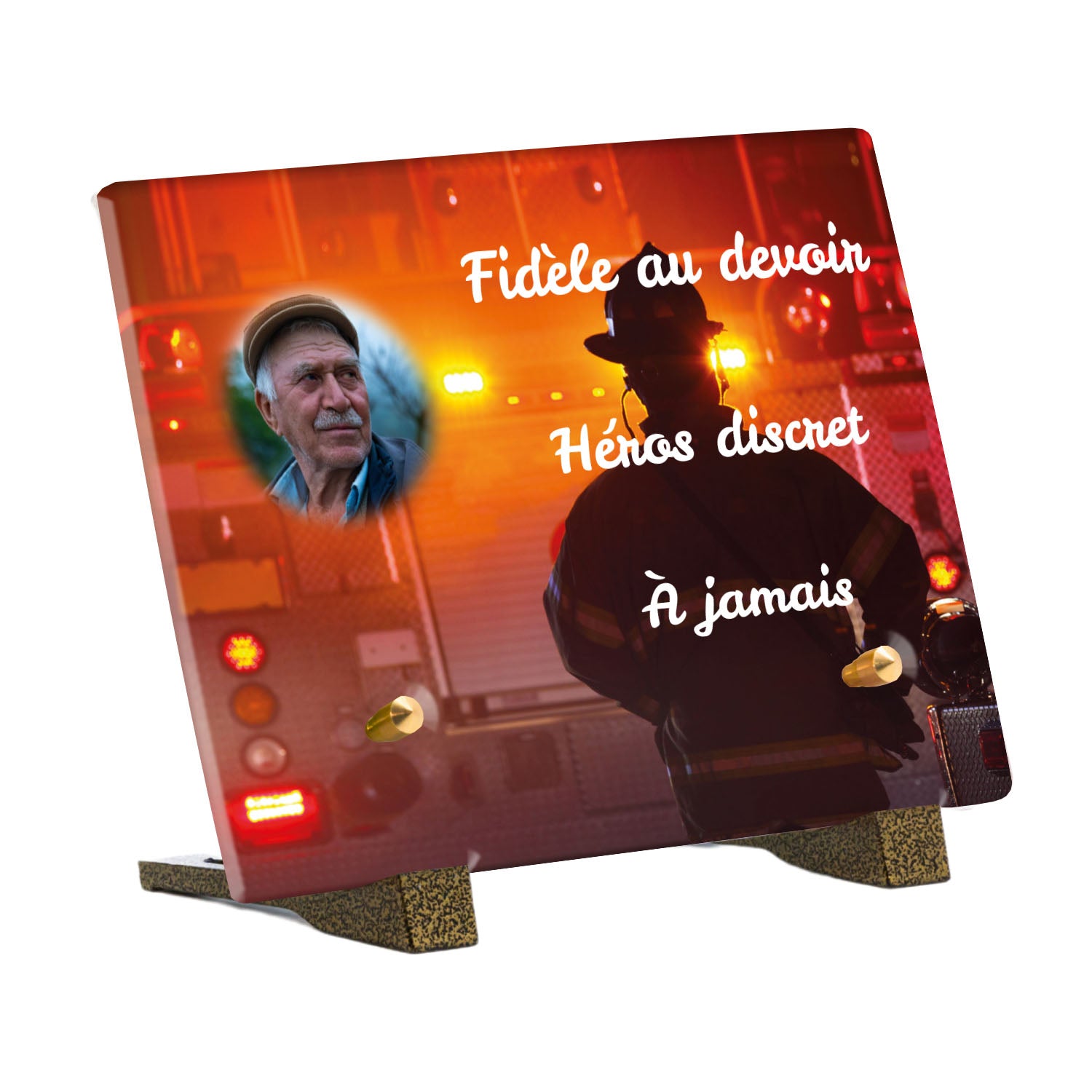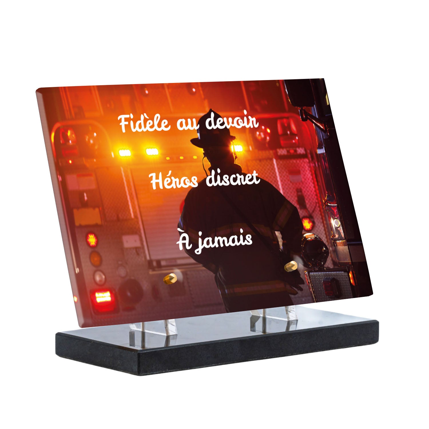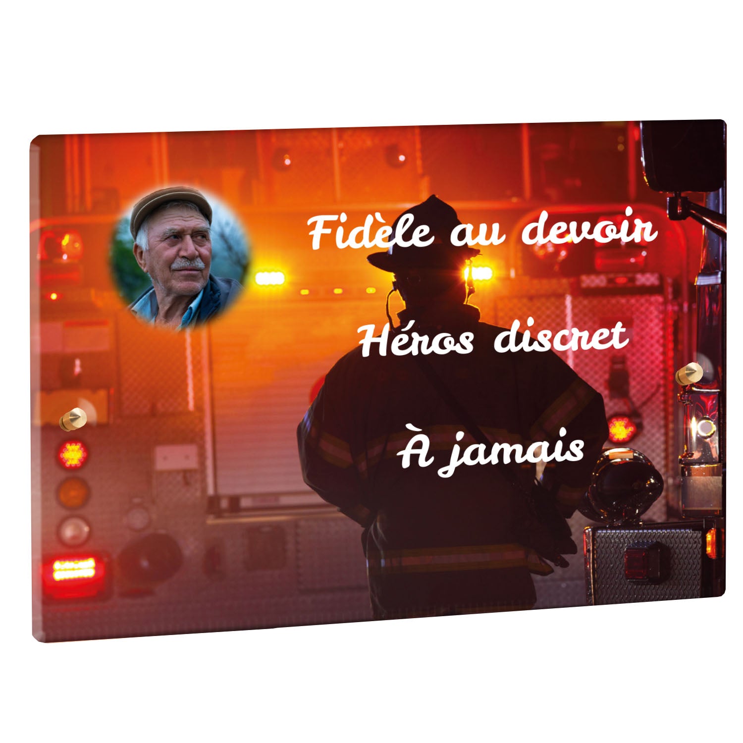 Cette plaque funéraire personnalisée rend hommage aux pompiers avec un design sobre et élégant. Réalisée en plexiglas, elle présente un visuel gravé représentant un casque de pompier et une lance d'incendie, symboles forts du courage et du dévouement. Ce modèle combine à la fois la modernité et le respect, faisant de cette plaque mortuaire un choix parfait pour une commémoration durable.