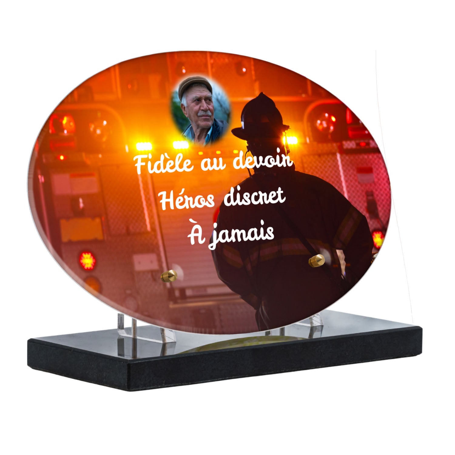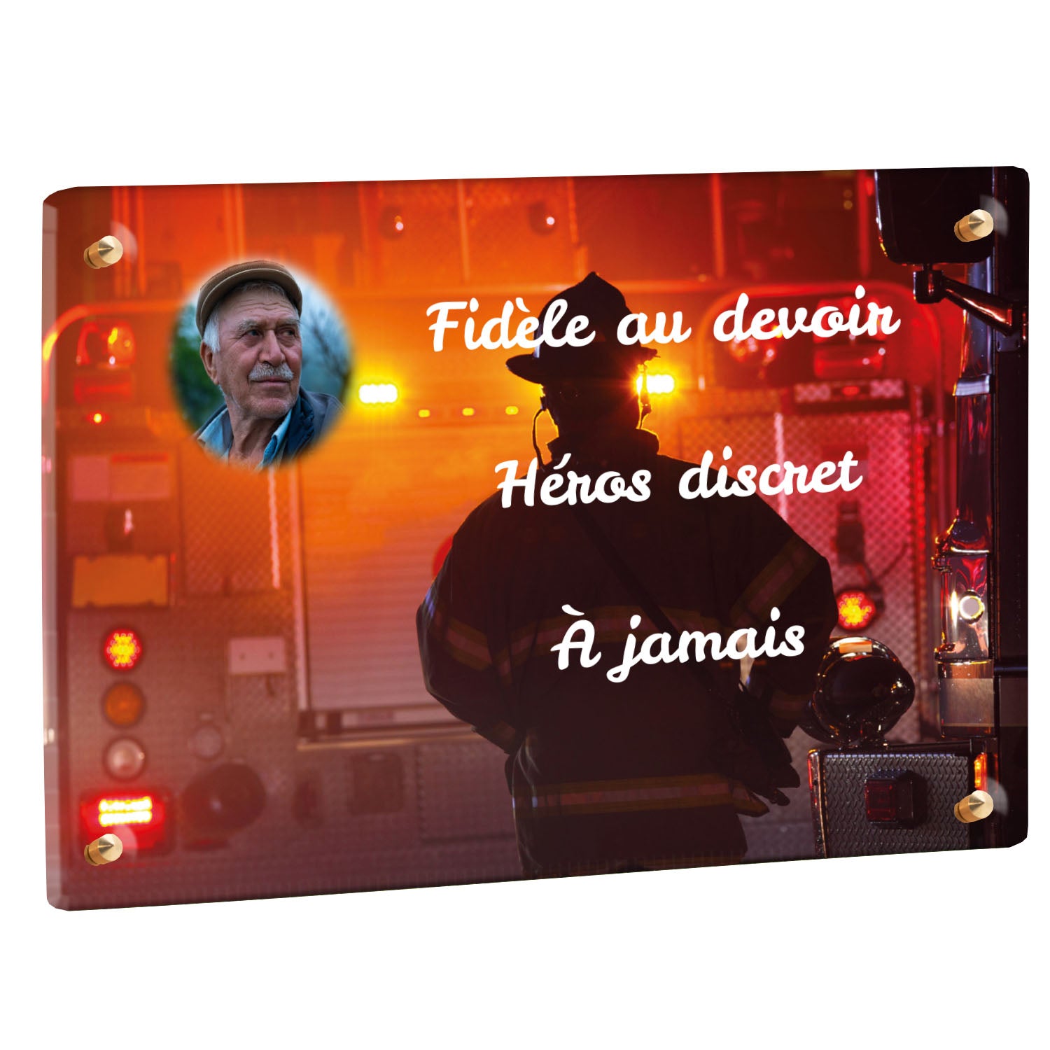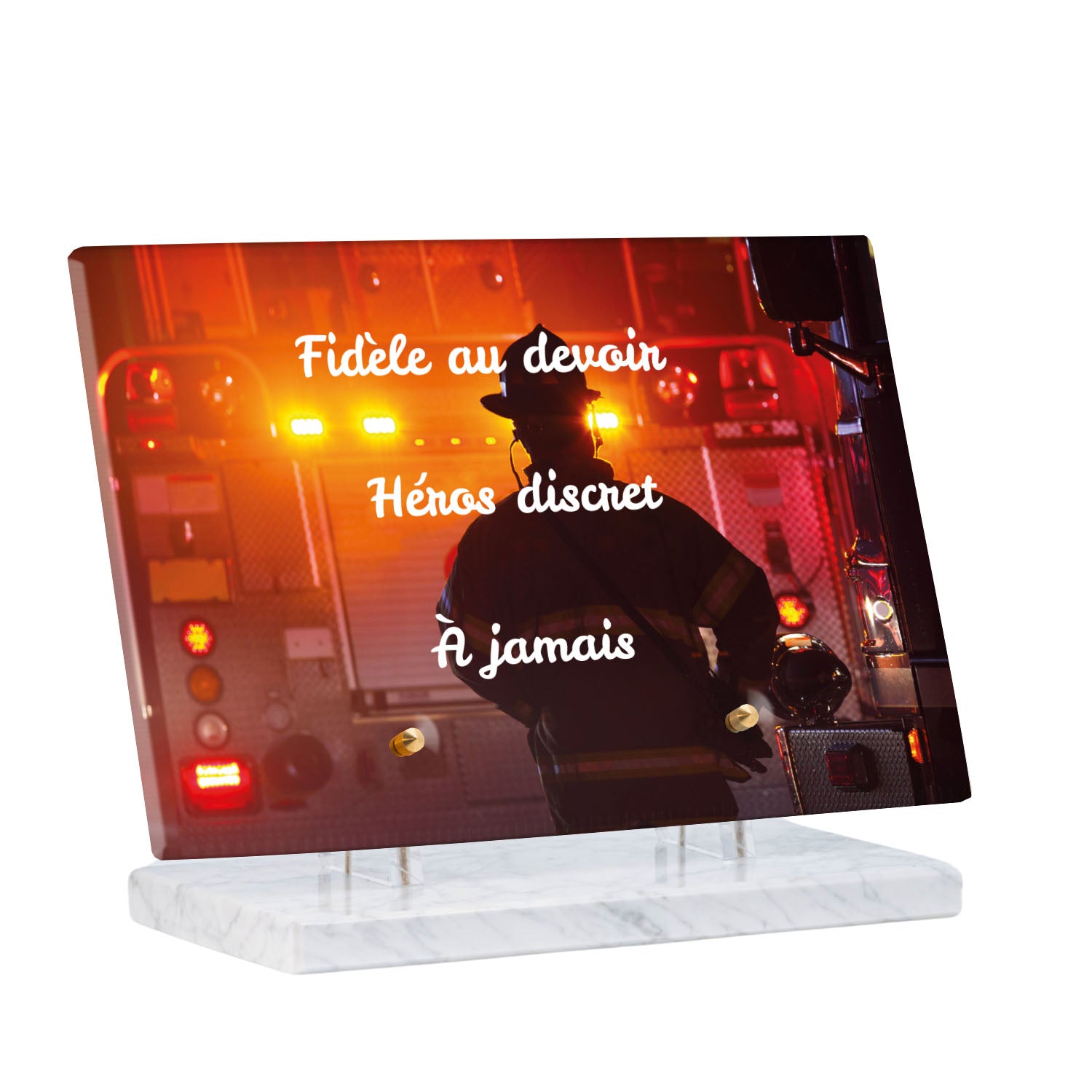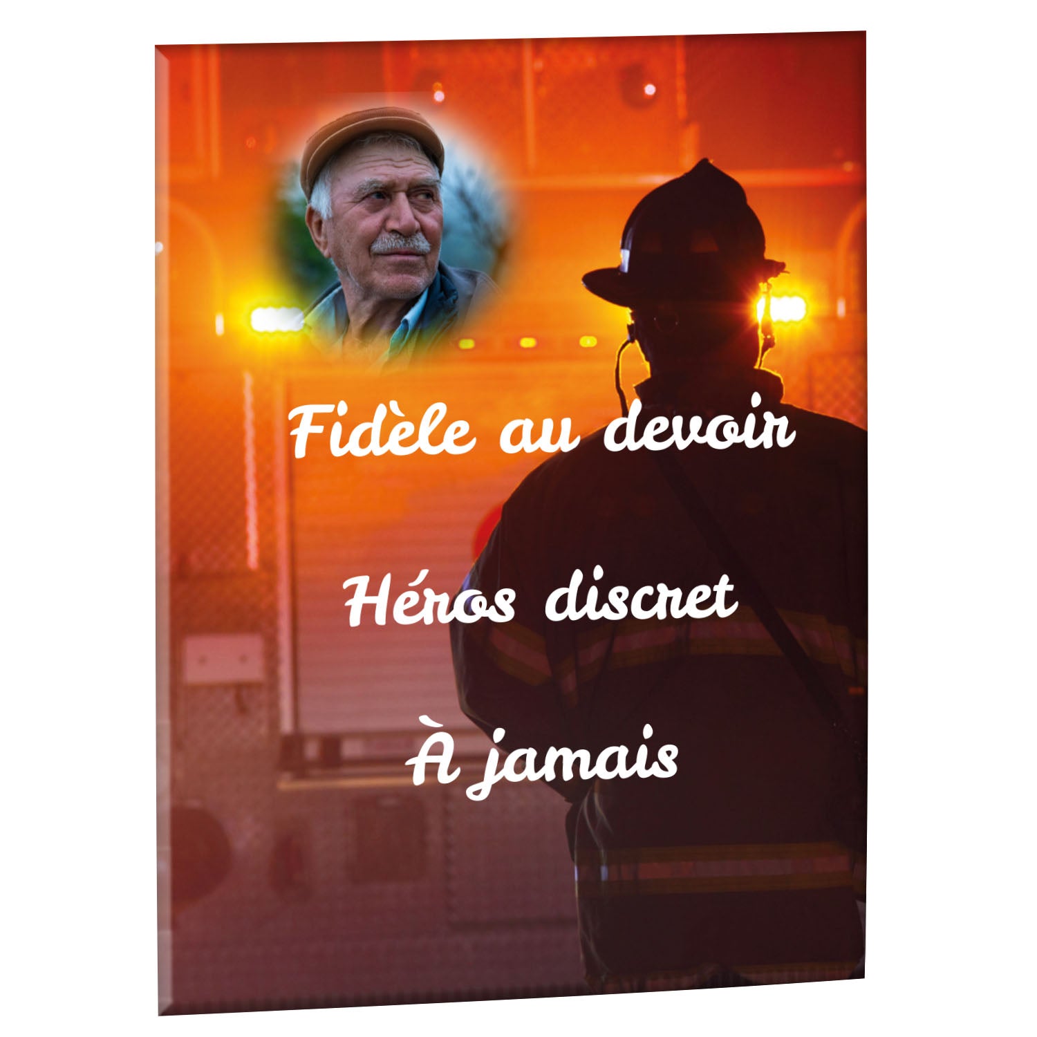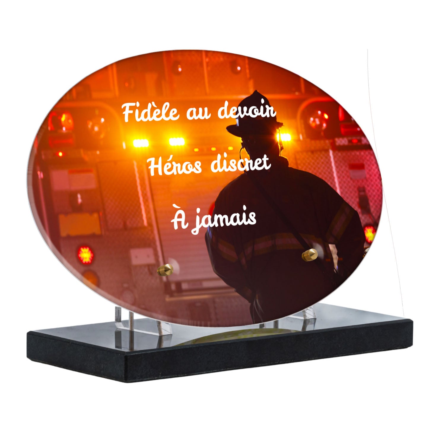 Cette plaque funéraire personnalisée rend hommage aux pompiers avec un design sobre et élégant. Réalisée en plexiglas, elle présente un visuel gravé représentant un casque de pompier et une lance d'incendie, symboles forts du courage et du dévouement. Ce modèle combine à la fois la modernité et le respect, faisant de cette plaque mortuaire un choix parfait pour une commémoration durable.