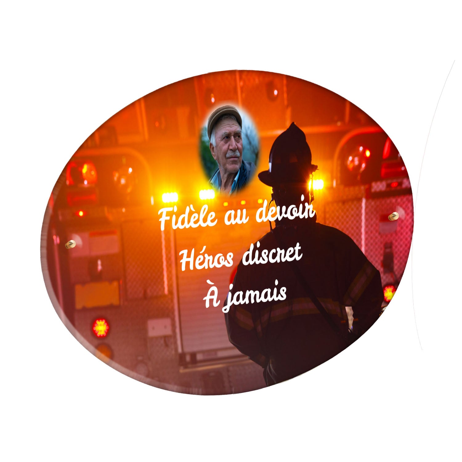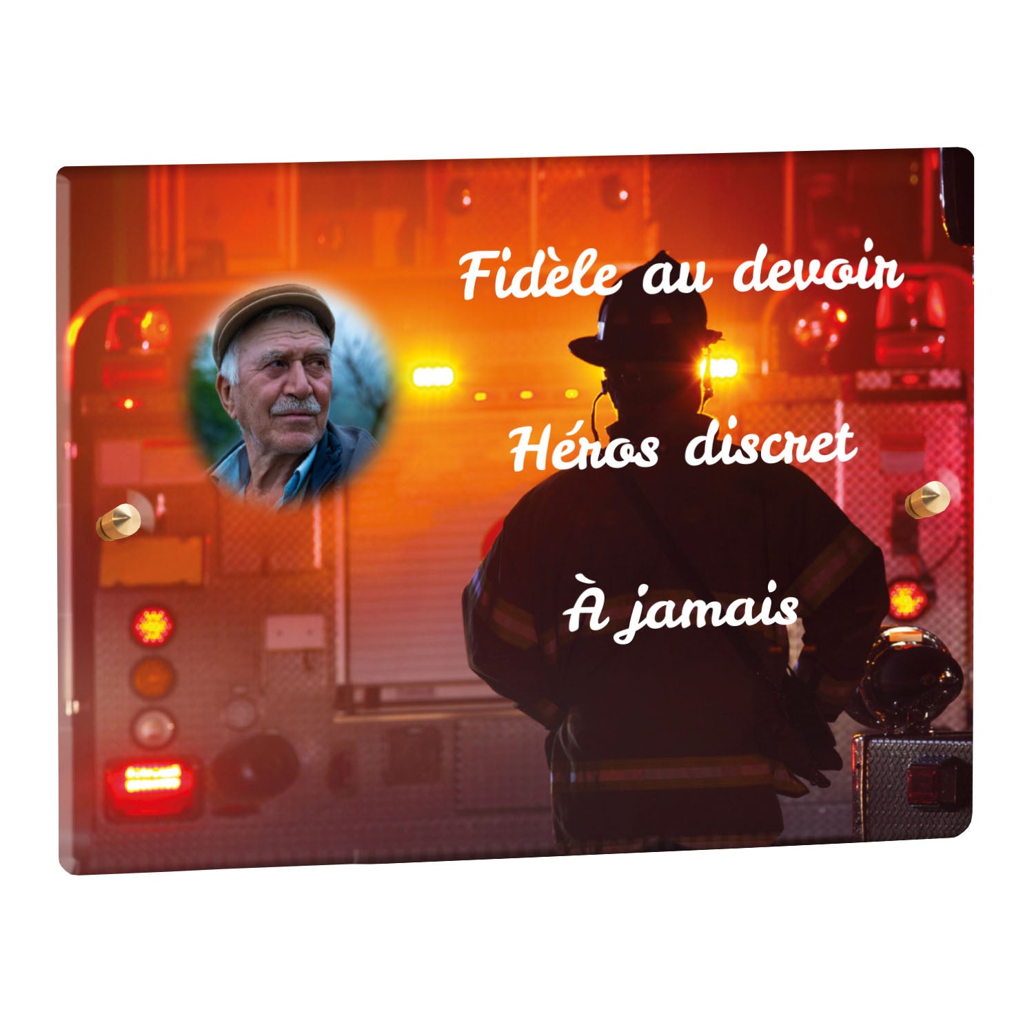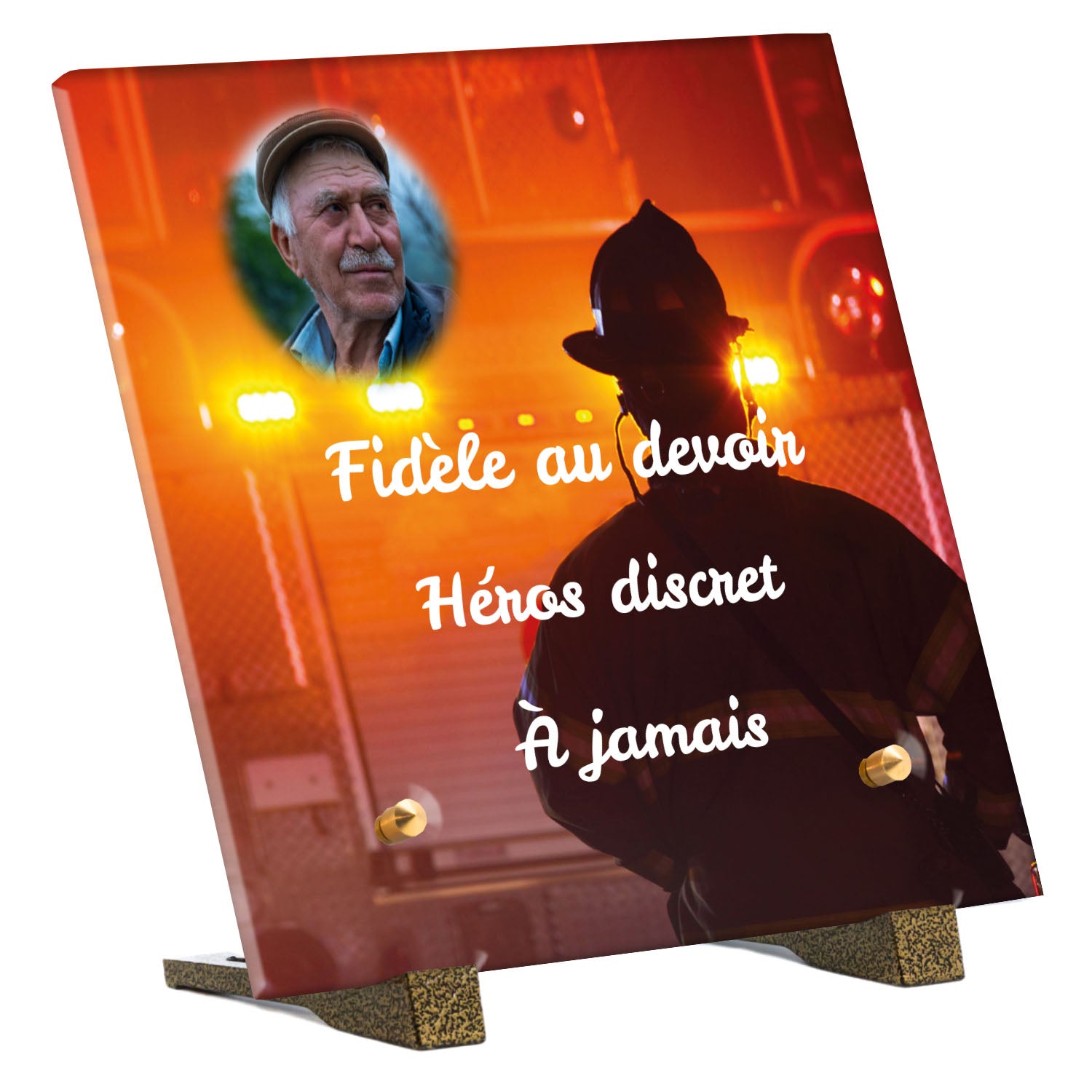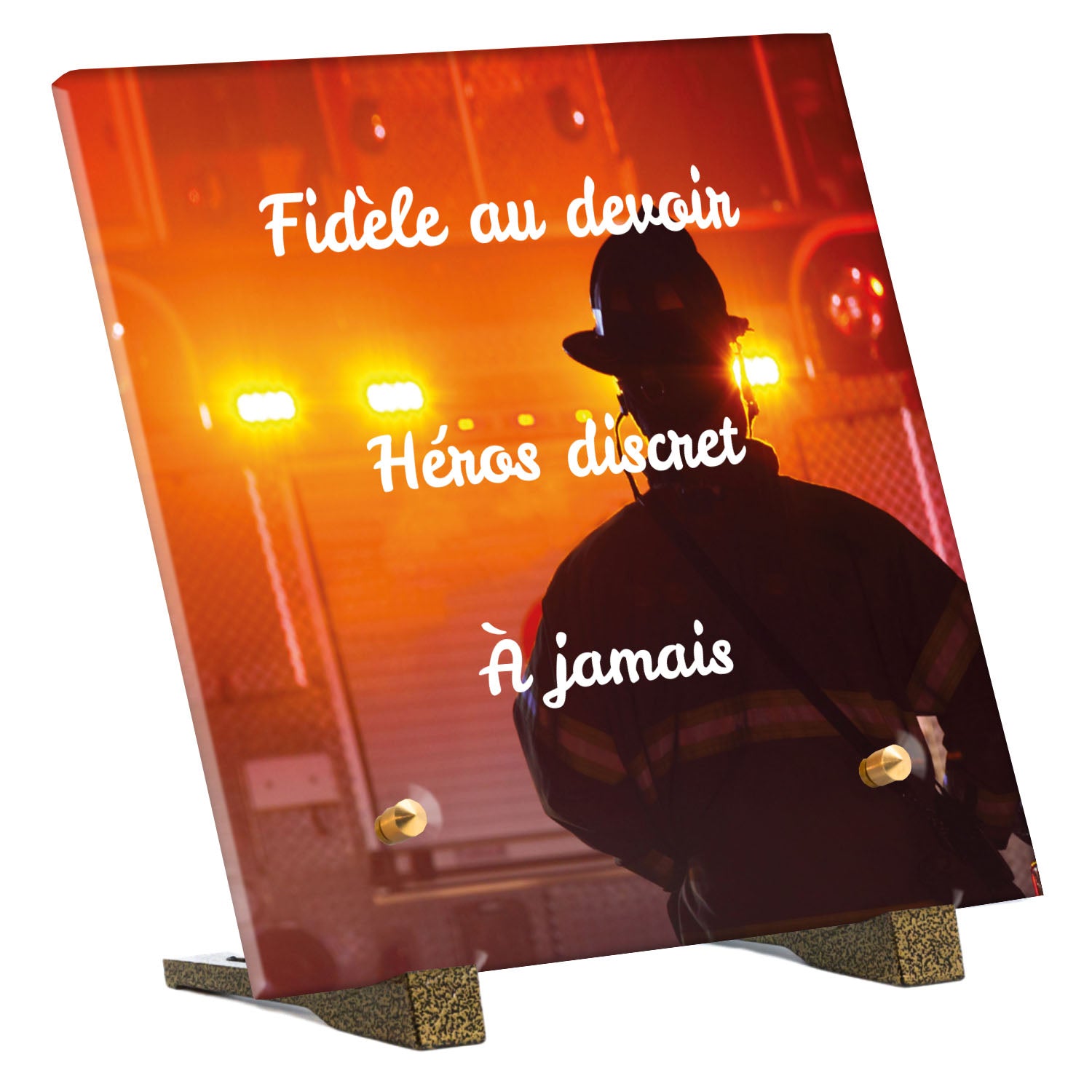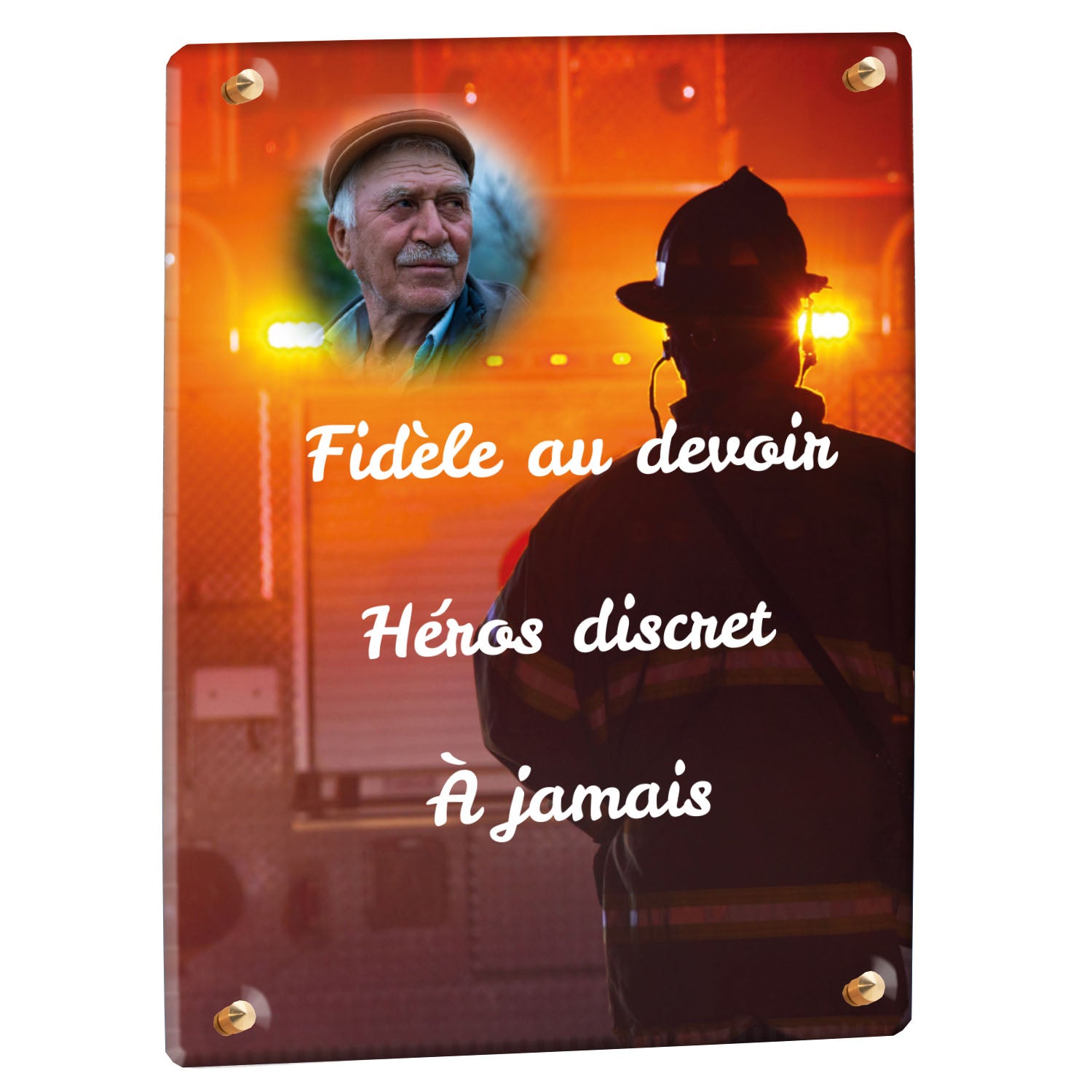 Cette plaque funéraire personnalisée rend hommage aux pompiers avec un design sobre et élégant. Réalisée en plexiglas, elle présente un visuel gravé représentant un casque de pompier et une lance d'incendie, symboles forts du courage et du dévouement. Ce modèle combine à la fois la modernité et le respect, faisant de cette plaque mortuaire un choix parfait pour une commémoration durable.