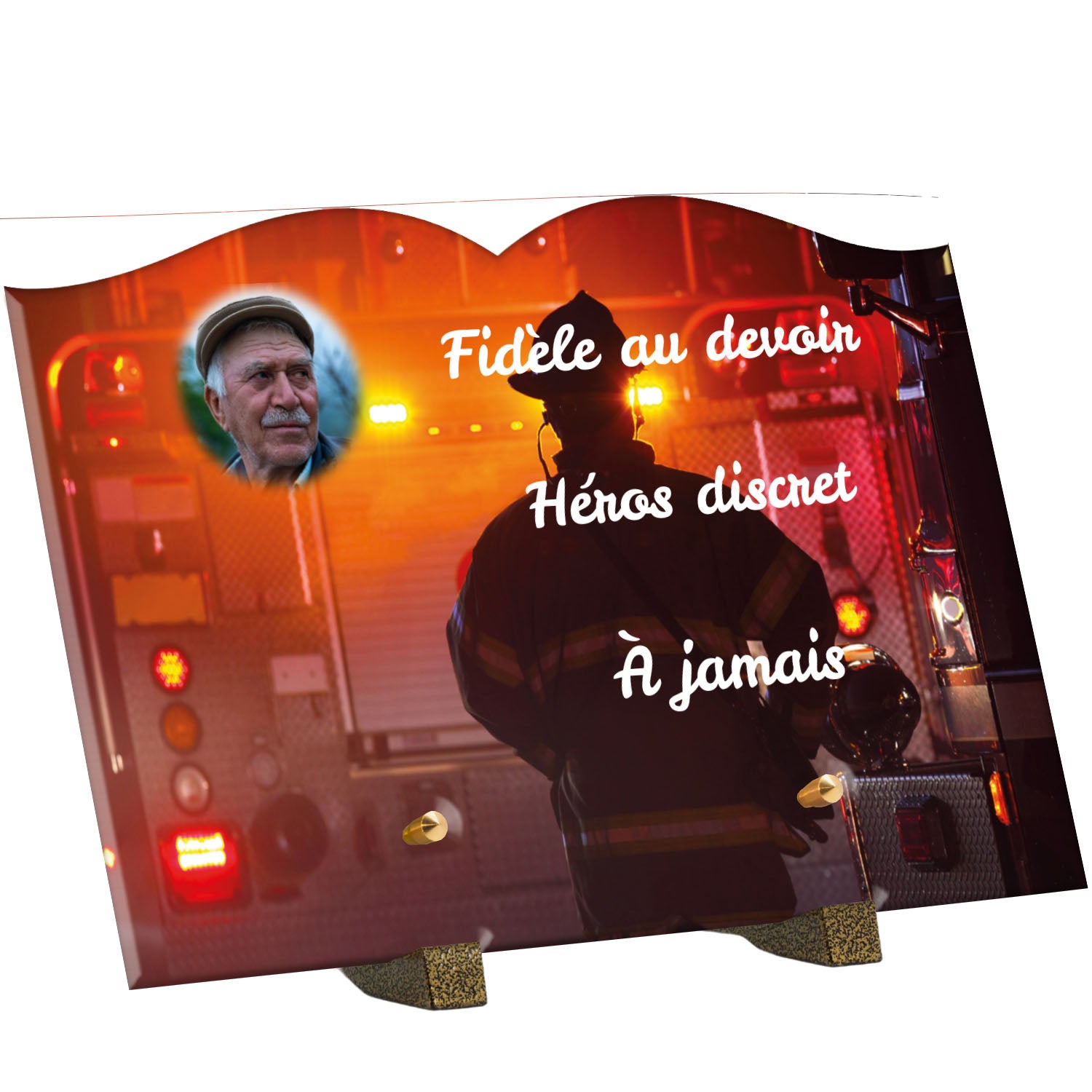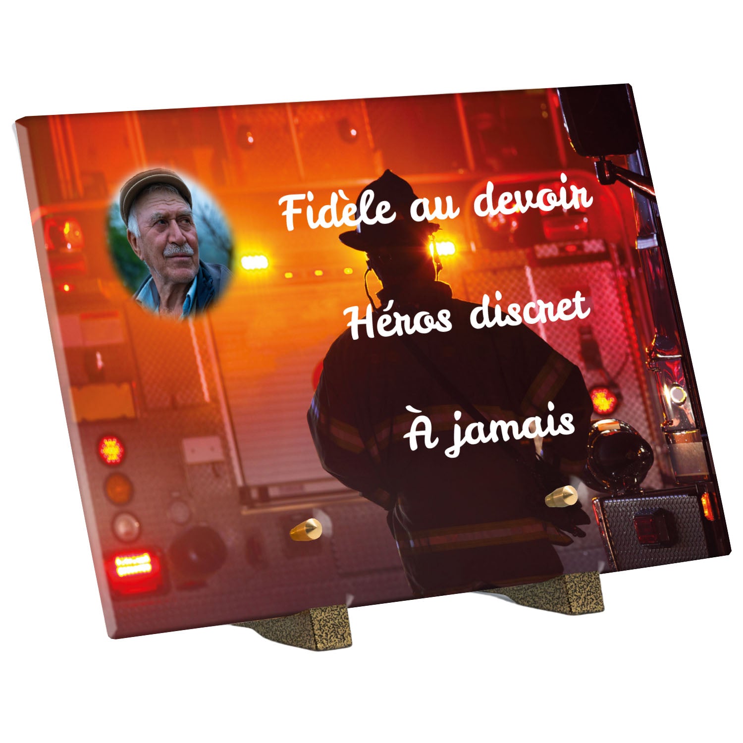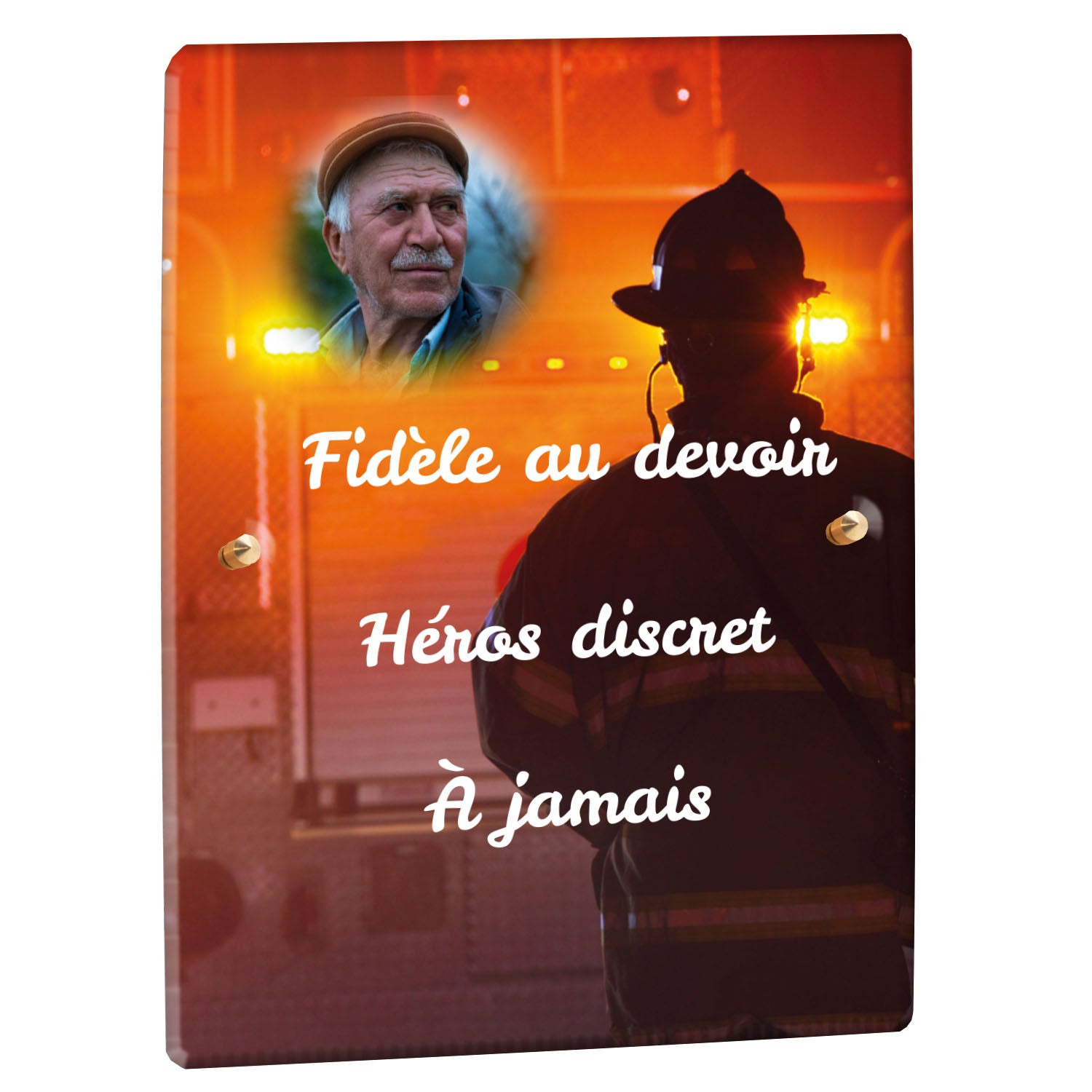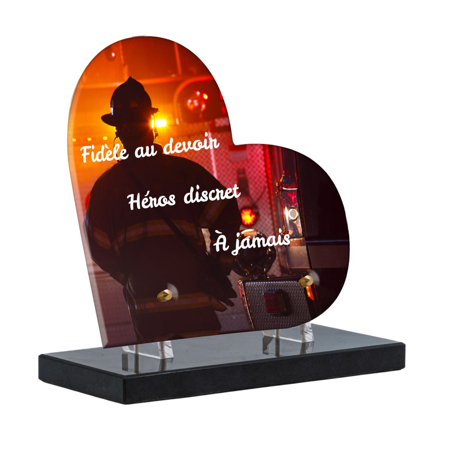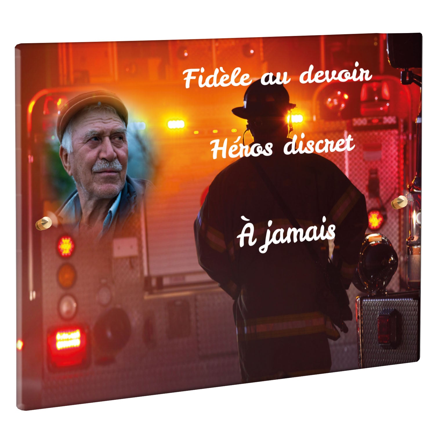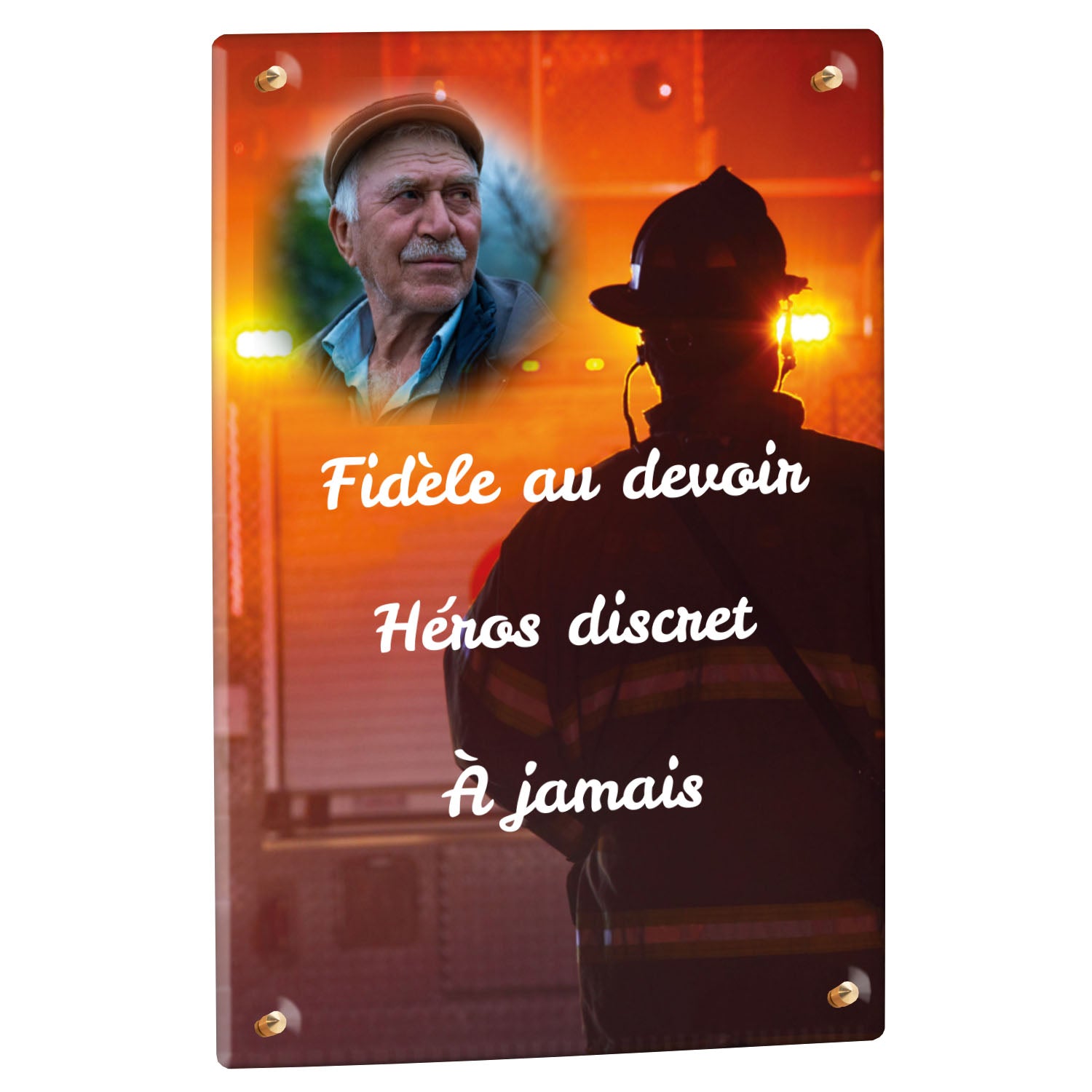 Cette plaque funéraire personnalisée rend hommage aux pompiers avec un design sobre et élégant. Réalisée en plexiglas, elle présente un visuel gravé représentant un casque de pompier et une lance d'incendie, symboles forts du courage et du dévouement. Ce modèle combine à la fois la modernité et le respect, faisant de cette plaque mortuaire un choix parfait pour une commémoration durable.