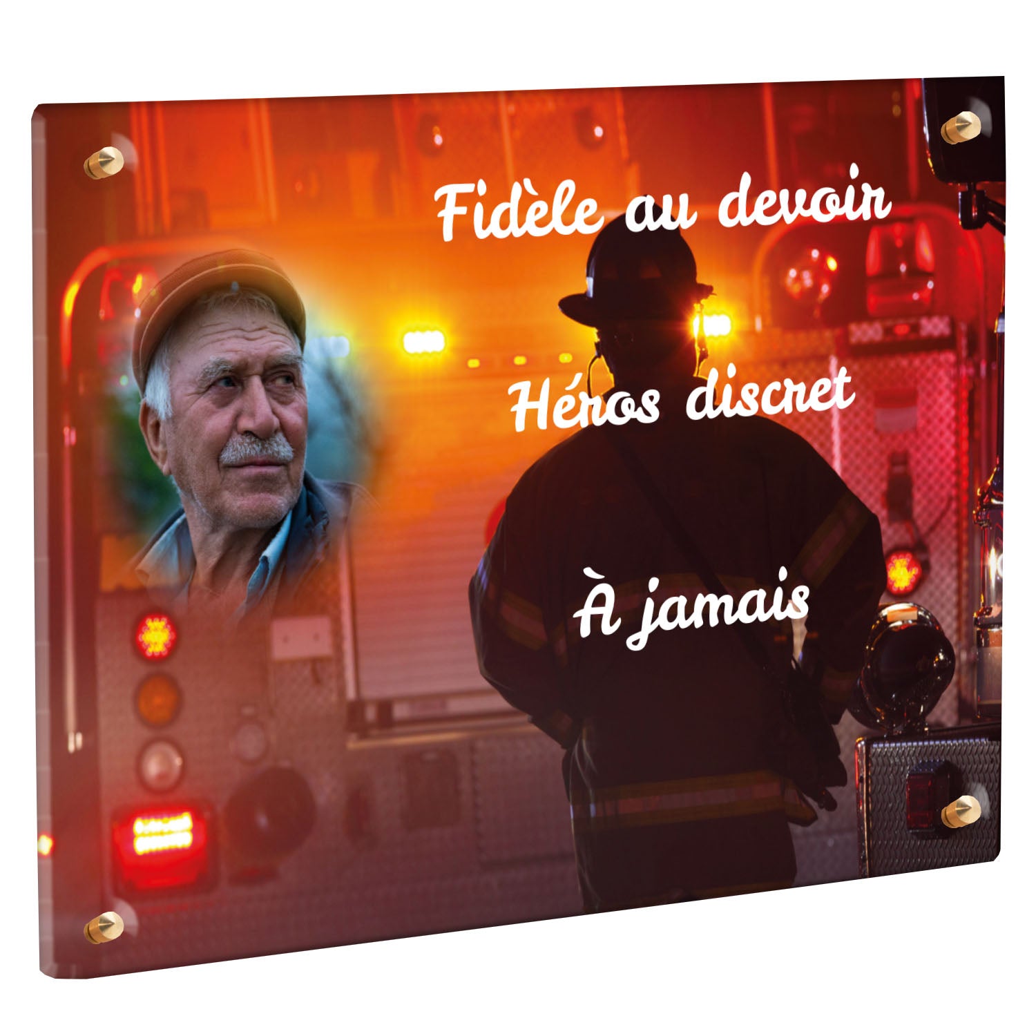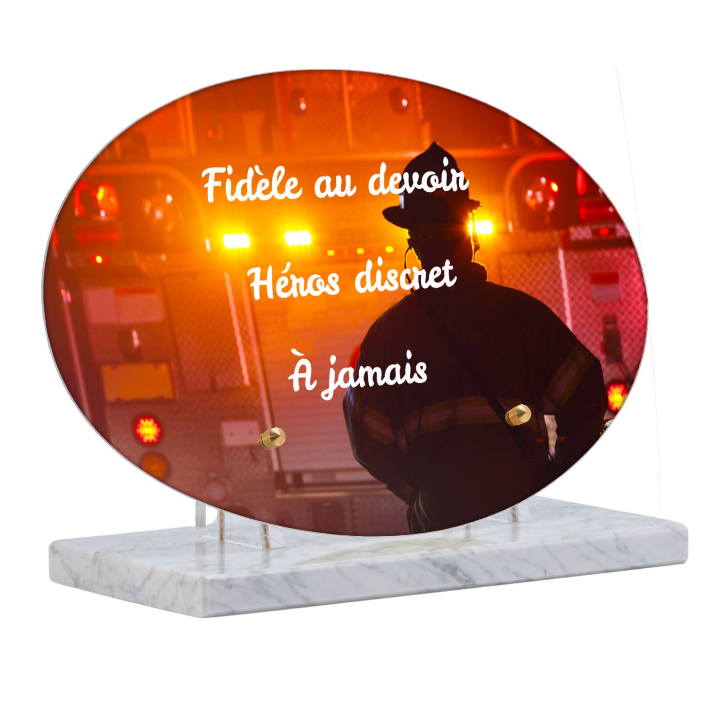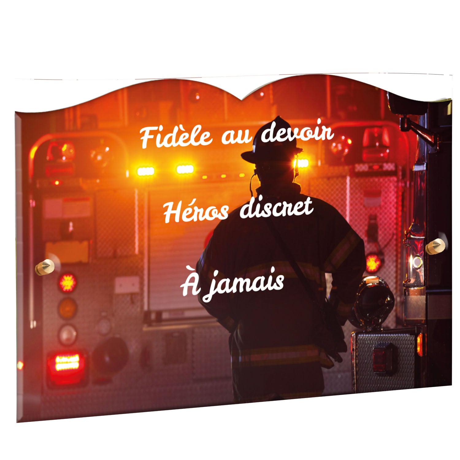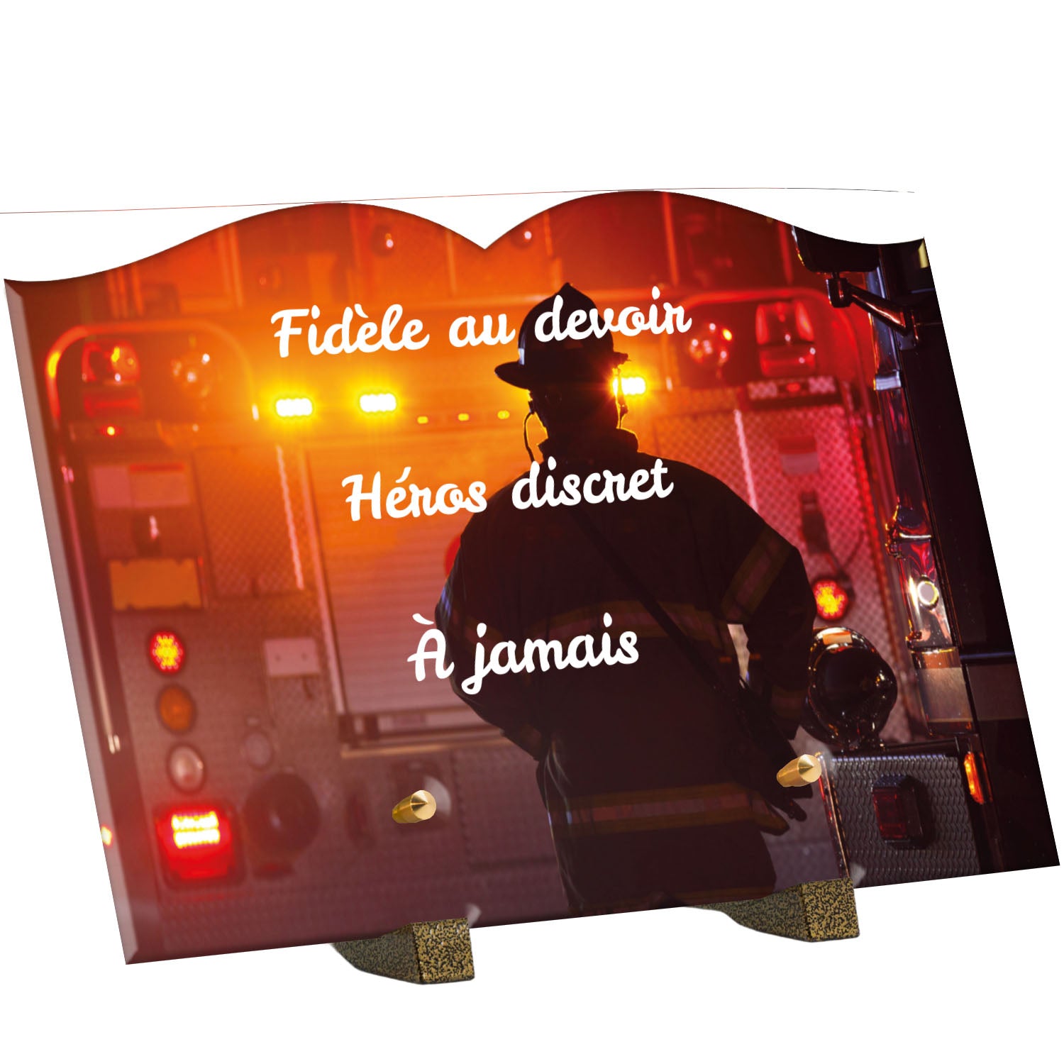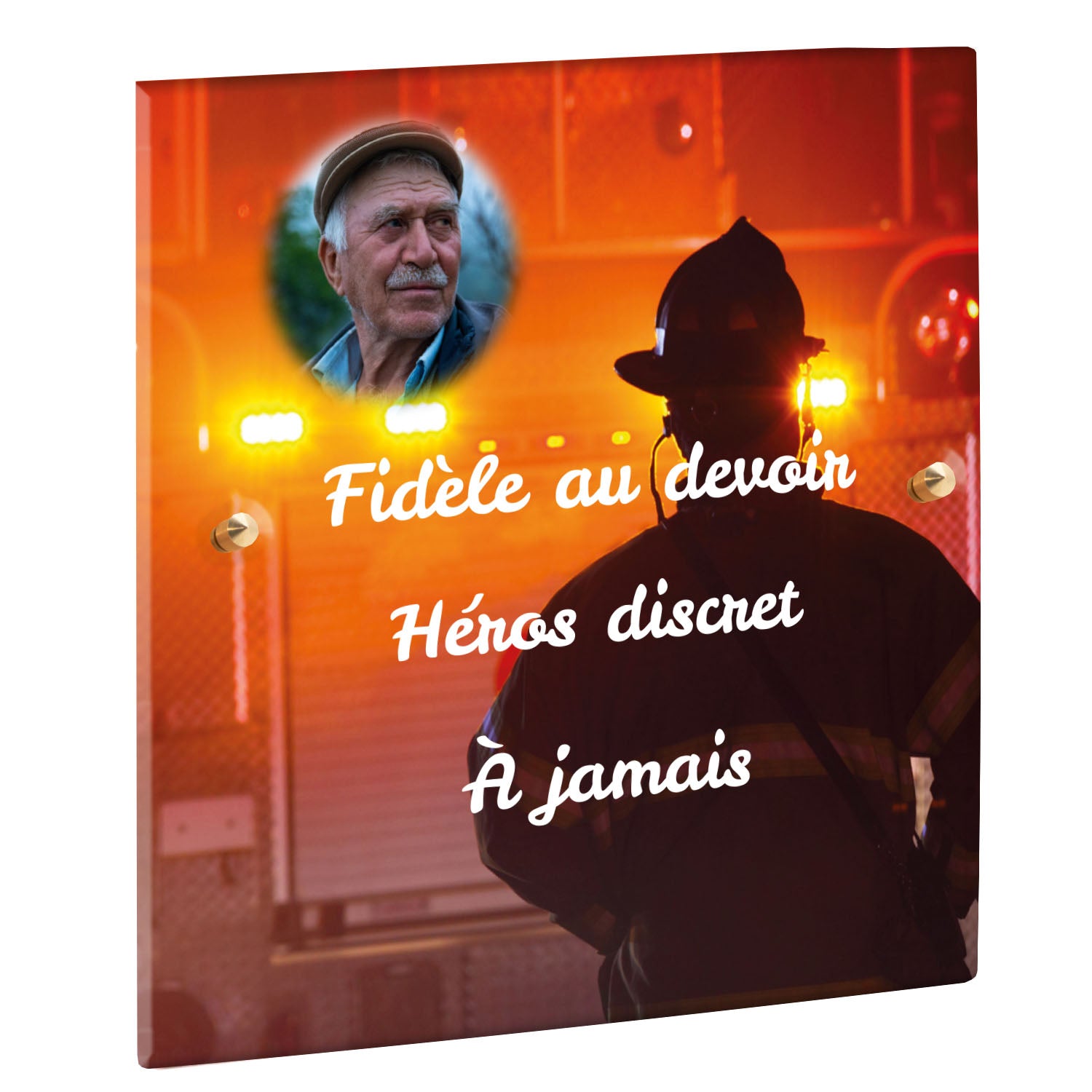 Cette plaque funéraire personnalisée rend hommage aux pompiers avec un design sobre et élégant. Réalisée en plexiglas, elle présente un visuel gravé représentant un casque de pompier et une lance d'incendie, symboles forts du courage et du dévouement. Ce modèle combine à la fois la modernité et le respect, faisant de cette plaque mortuaire un choix parfait pour une commémoration durable.