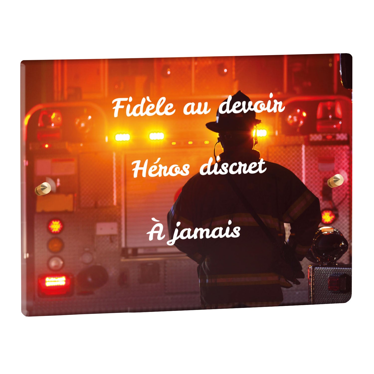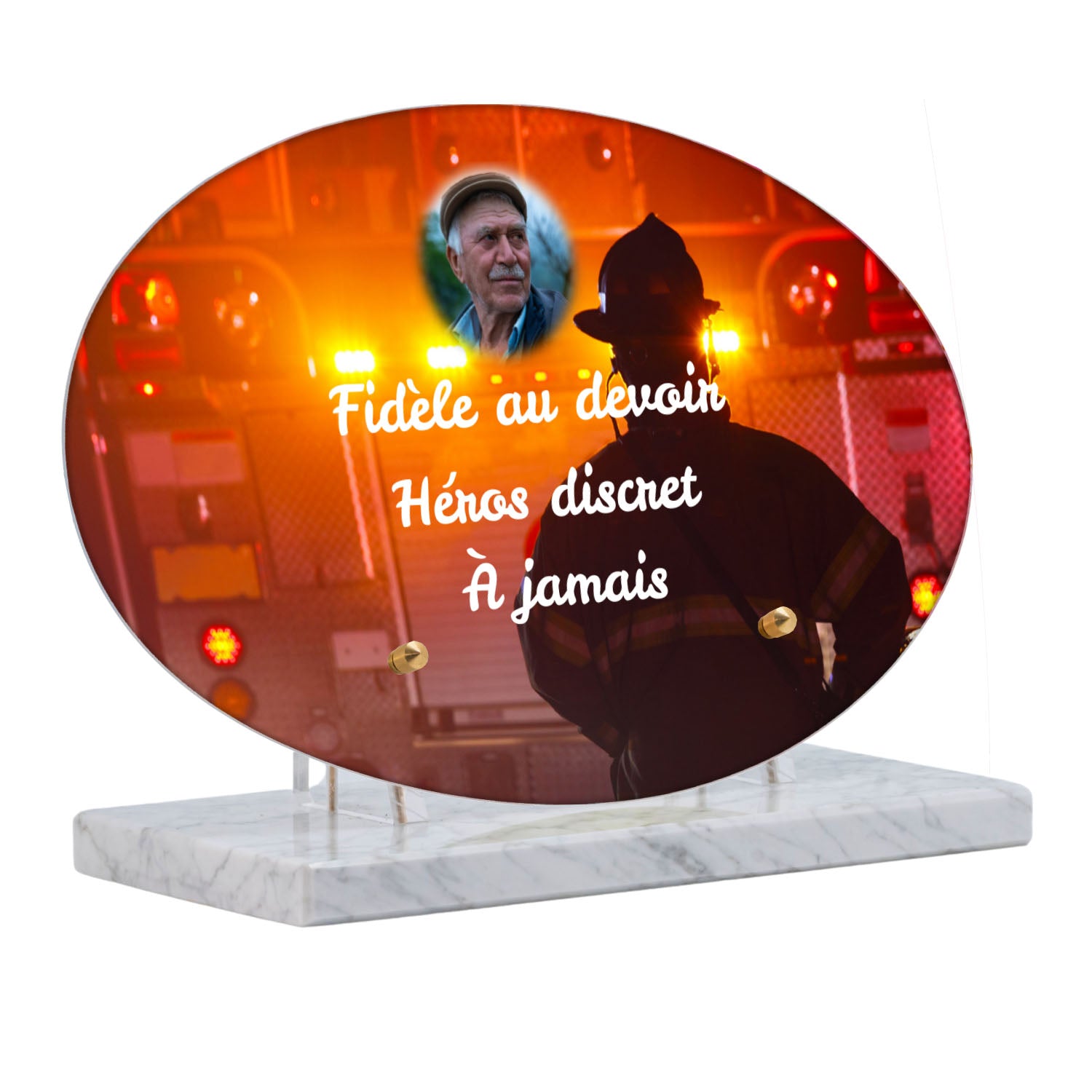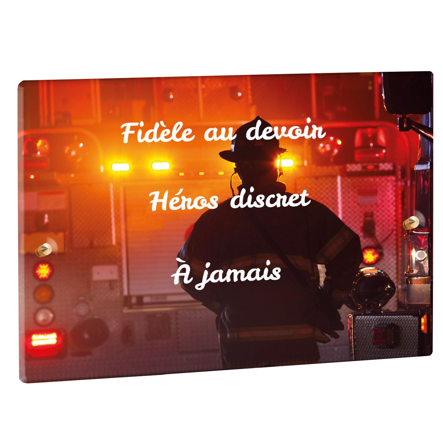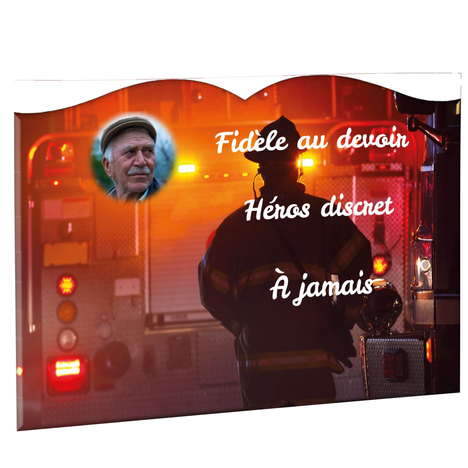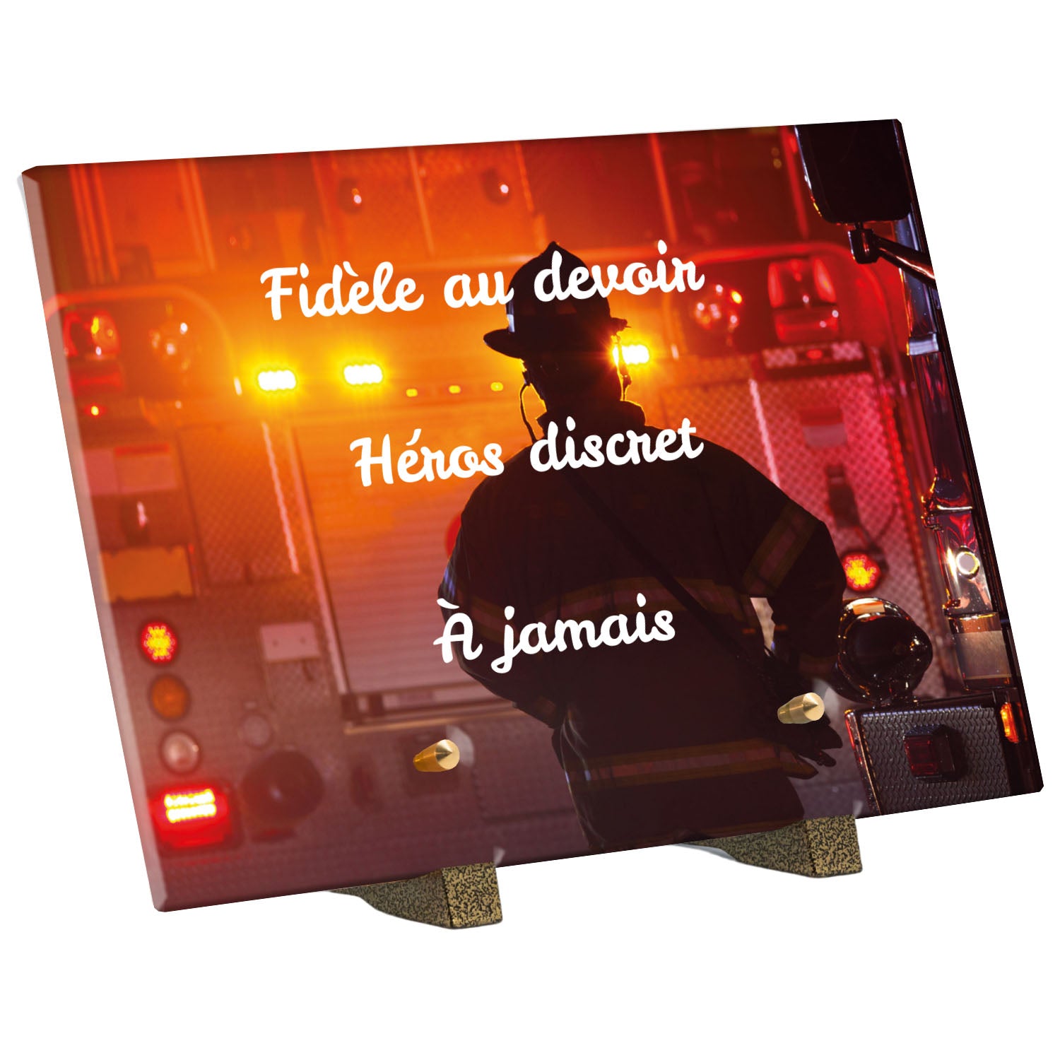 Cette plaque funéraire personnalisée rend hommage aux pompiers avec un design sobre et élégant. Réalisée en plexiglas, elle présente un visuel gravé représentant un casque de pompier et une lance d'incendie, symboles forts du courage et du dévouement. Ce modèle combine à la fois la modernité et le respect, faisant de cette plaque mortuaire un choix parfait pour une commémoration durable.