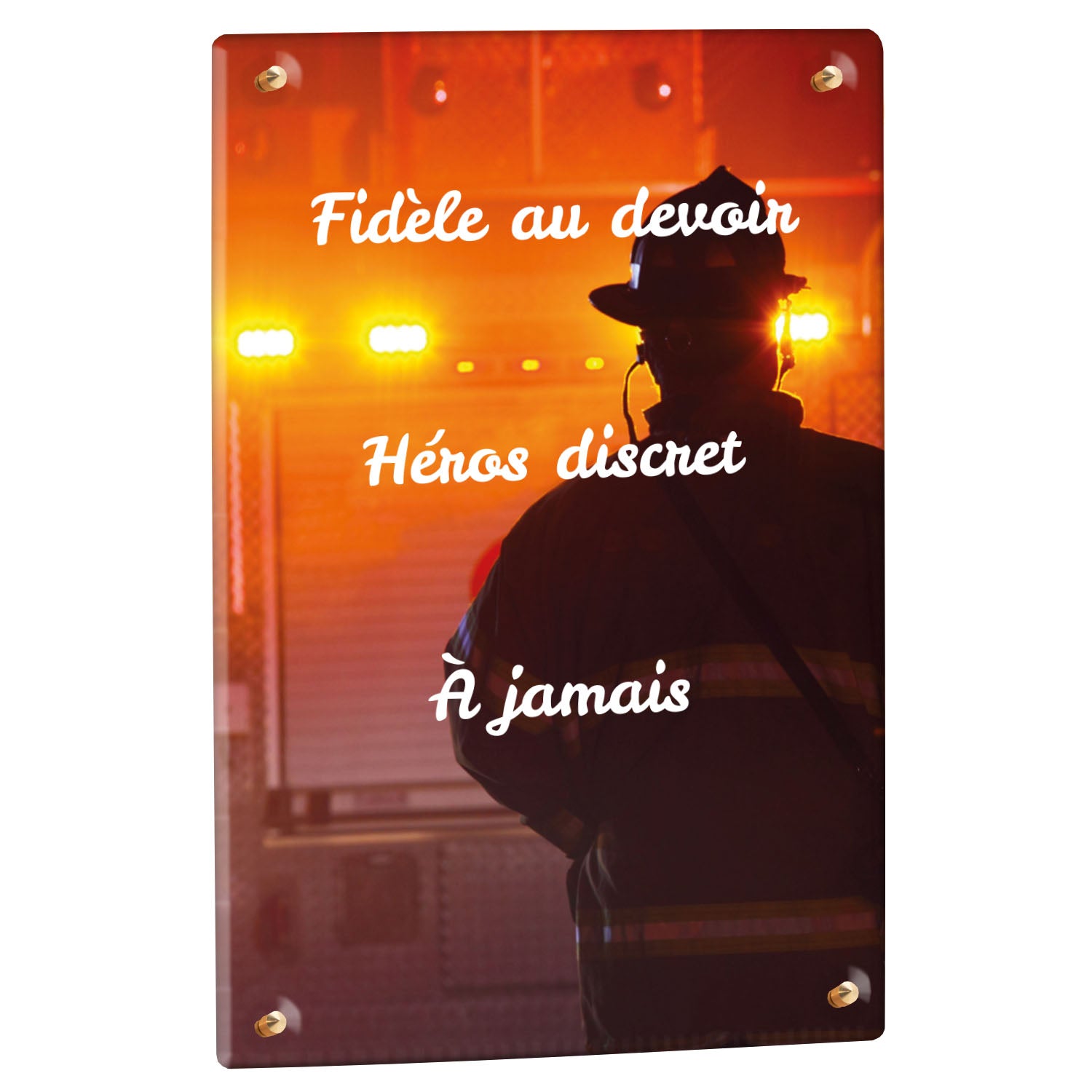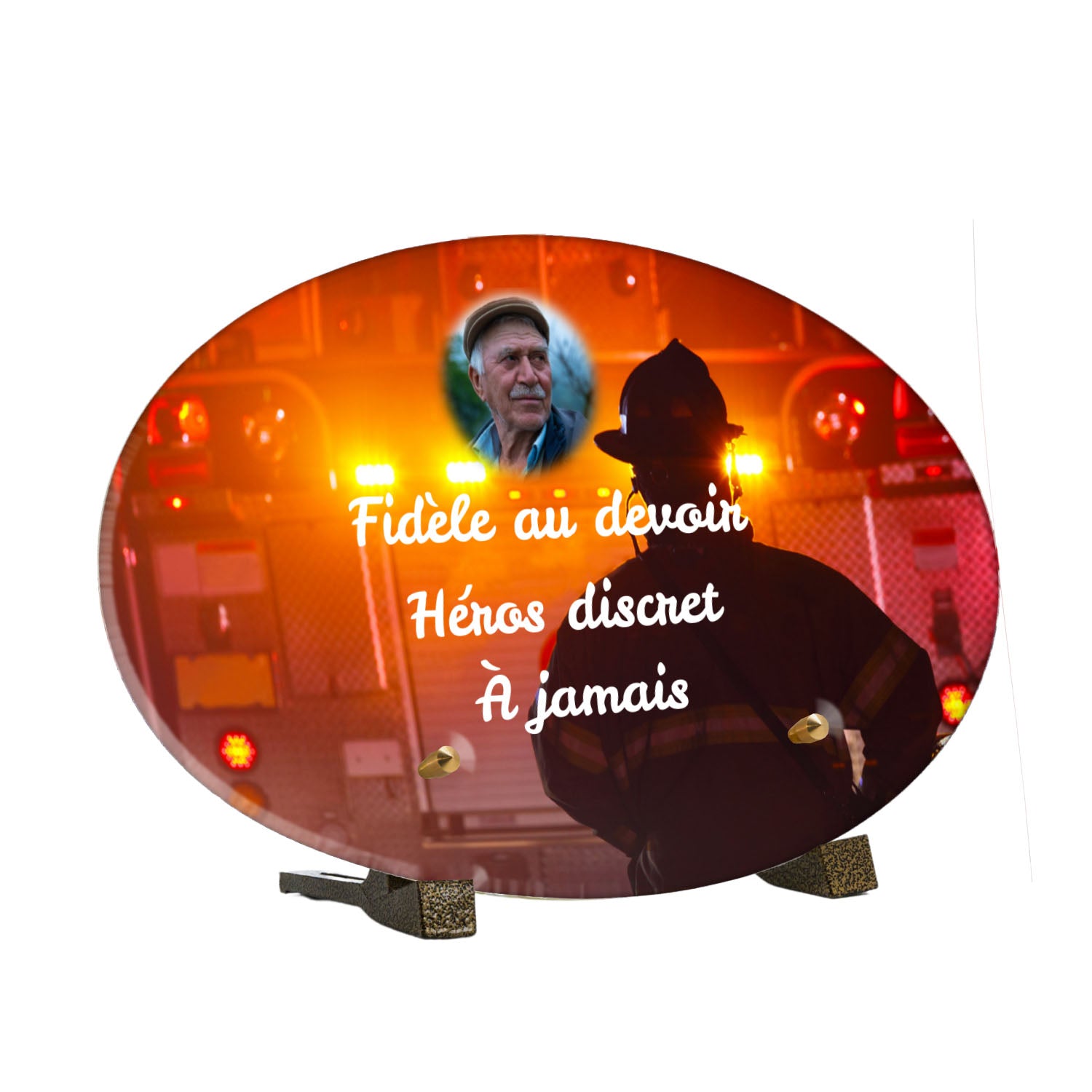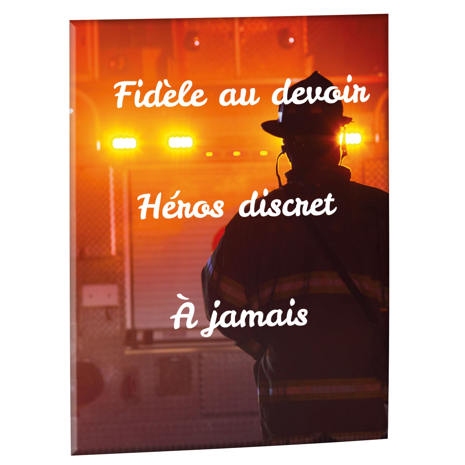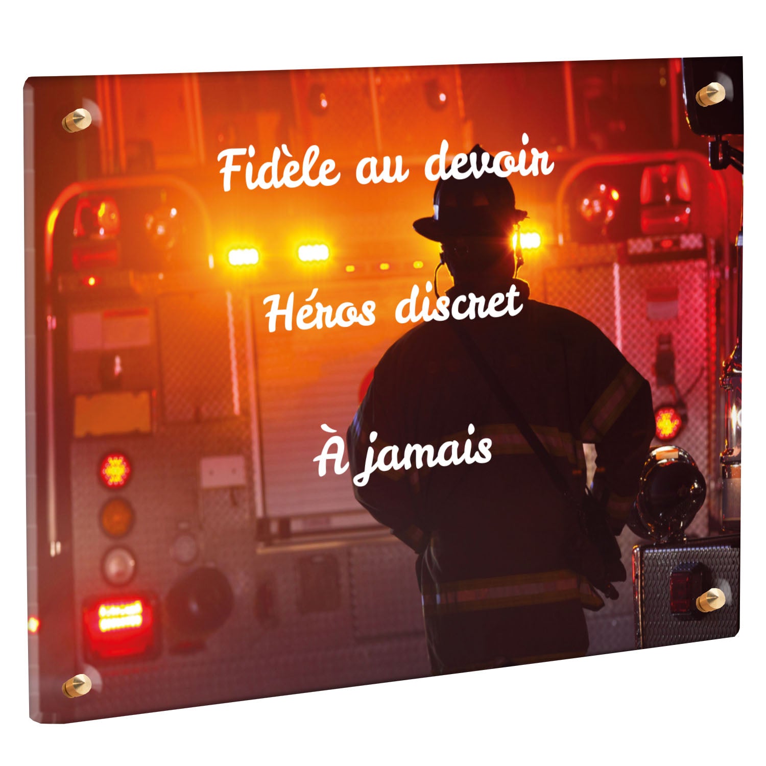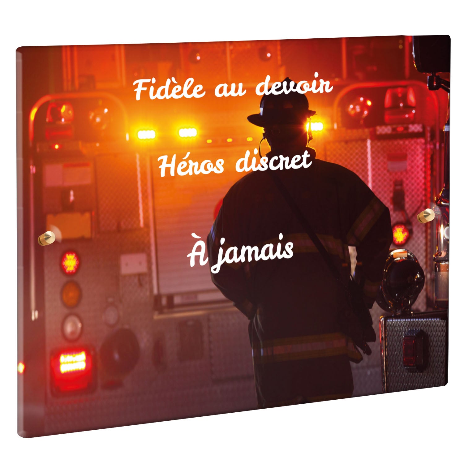 Cette plaque funéraire personnalisée rend hommage aux pompiers avec un design sobre et élégant. Réalisée en plexiglas, elle présente un visuel gravé représentant un casque de pompier et une lance d'incendie, symboles forts du courage et du dévouement. Ce modèle combine à la fois la modernité et le respect, faisant de cette plaque mortuaire un choix parfait pour une commémoration durable.