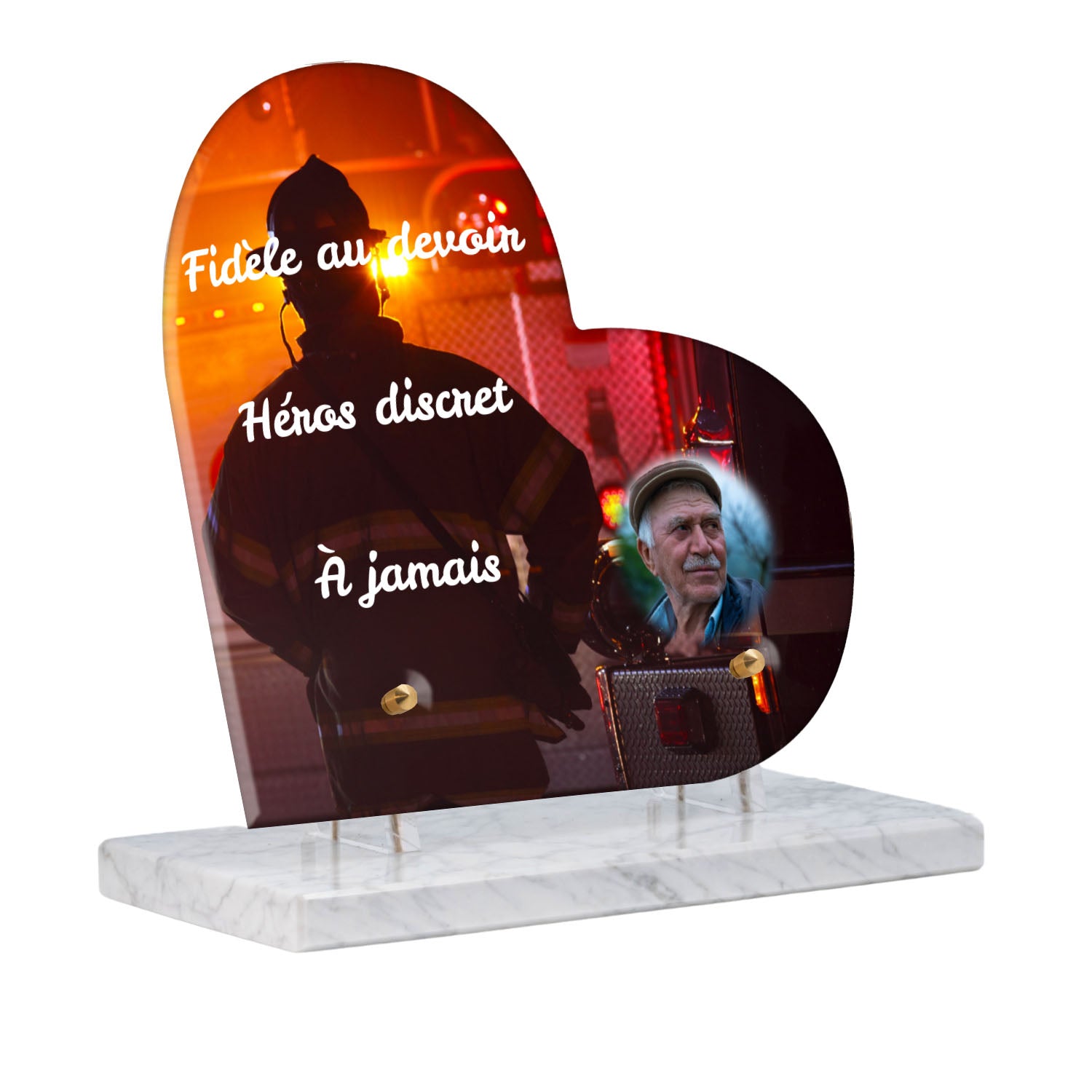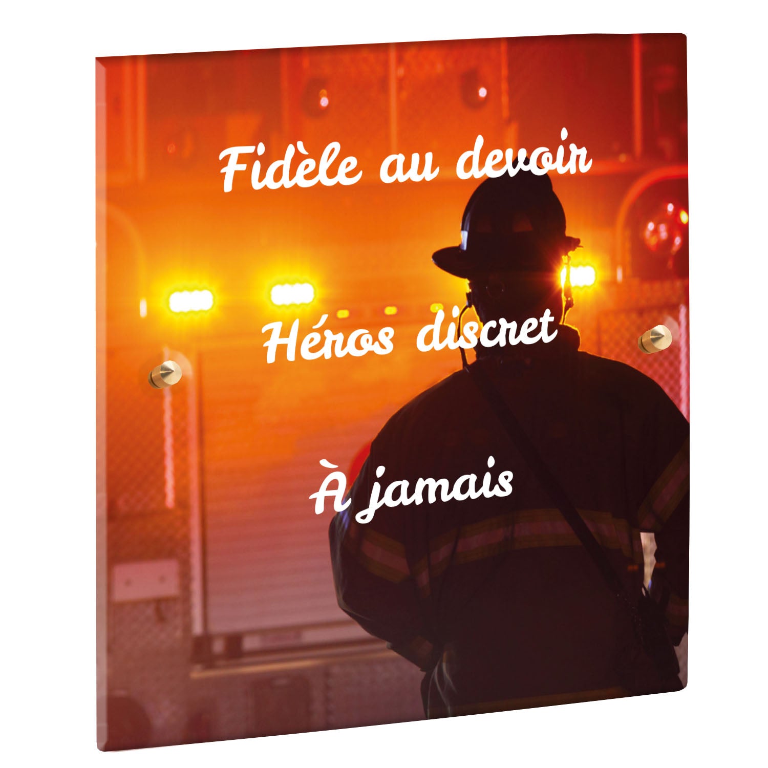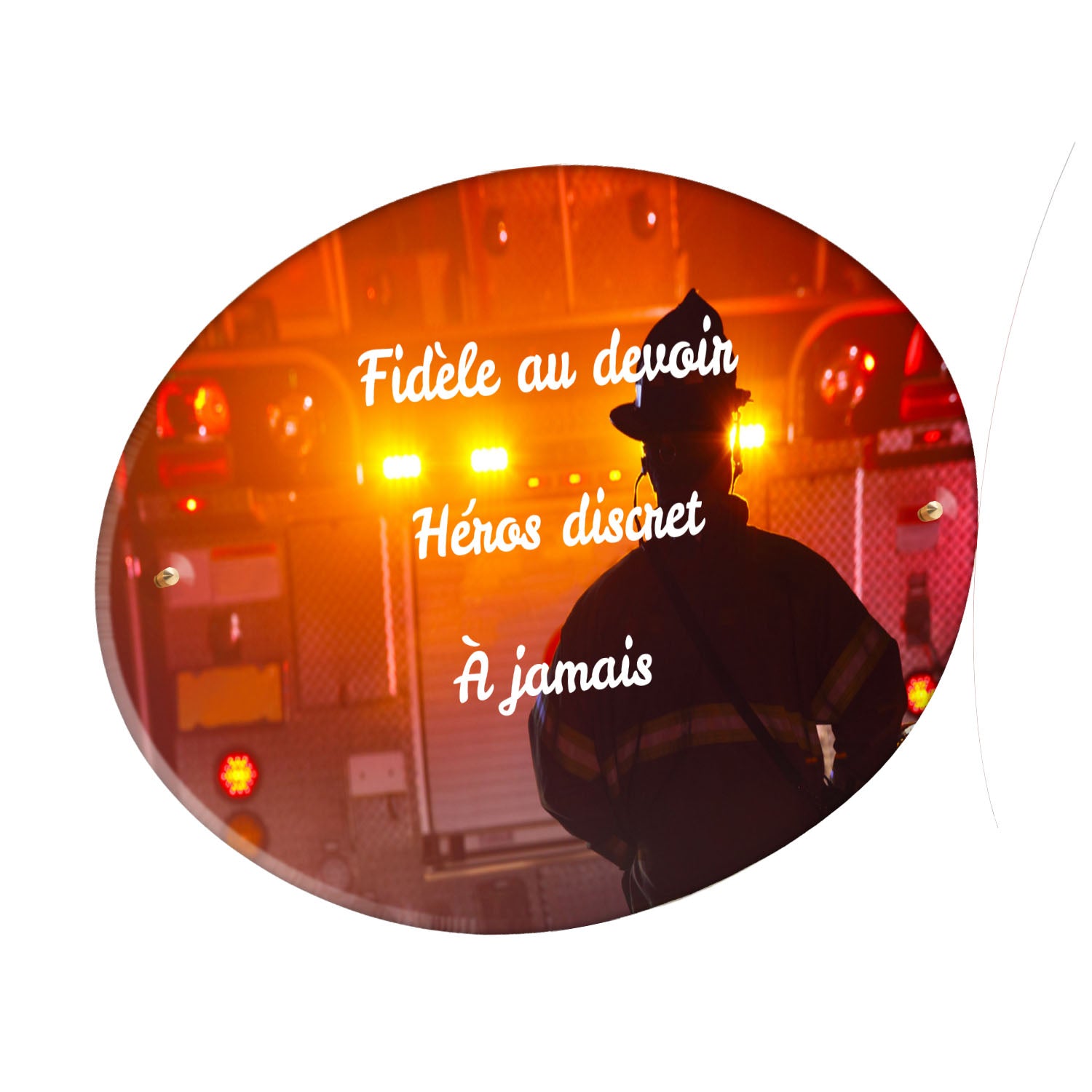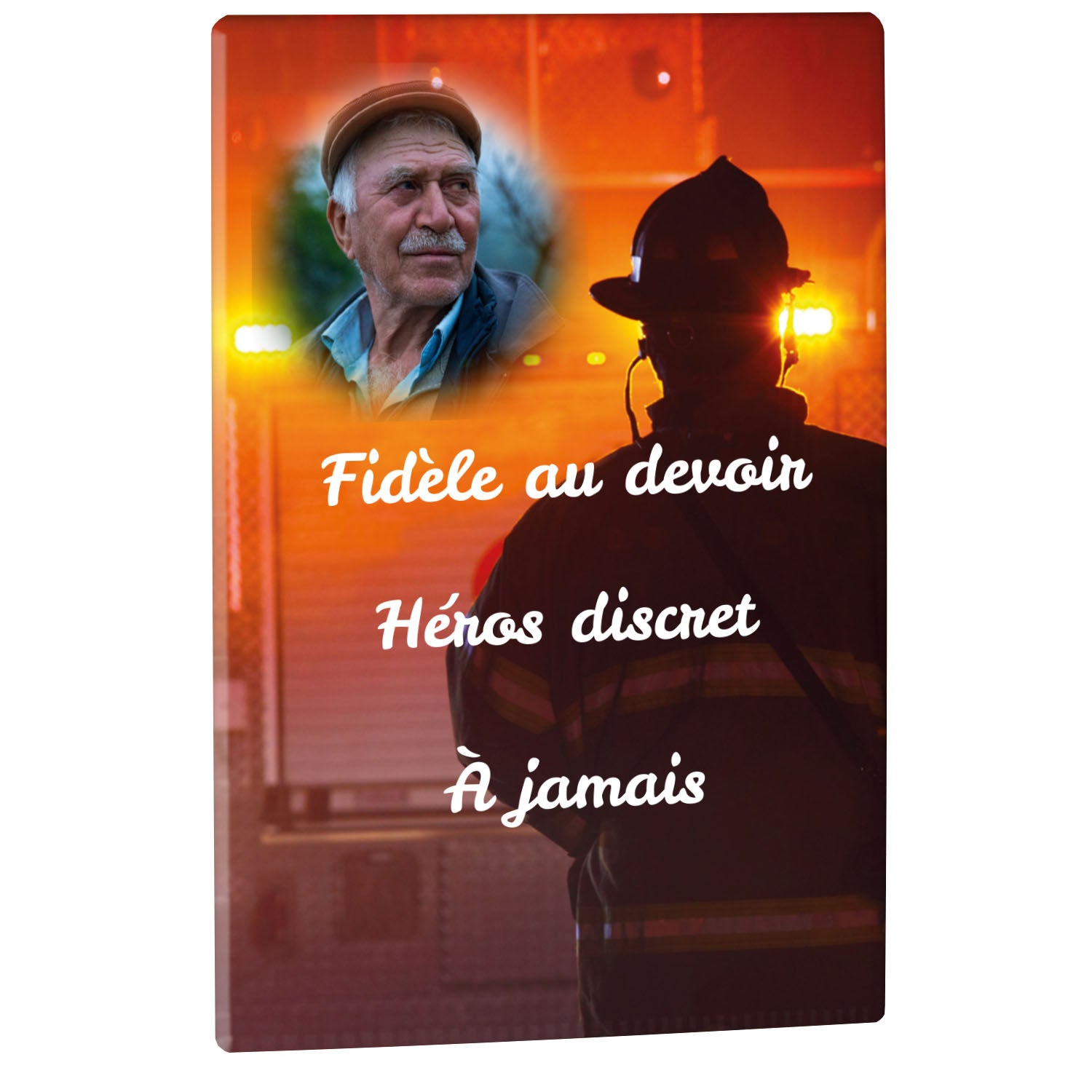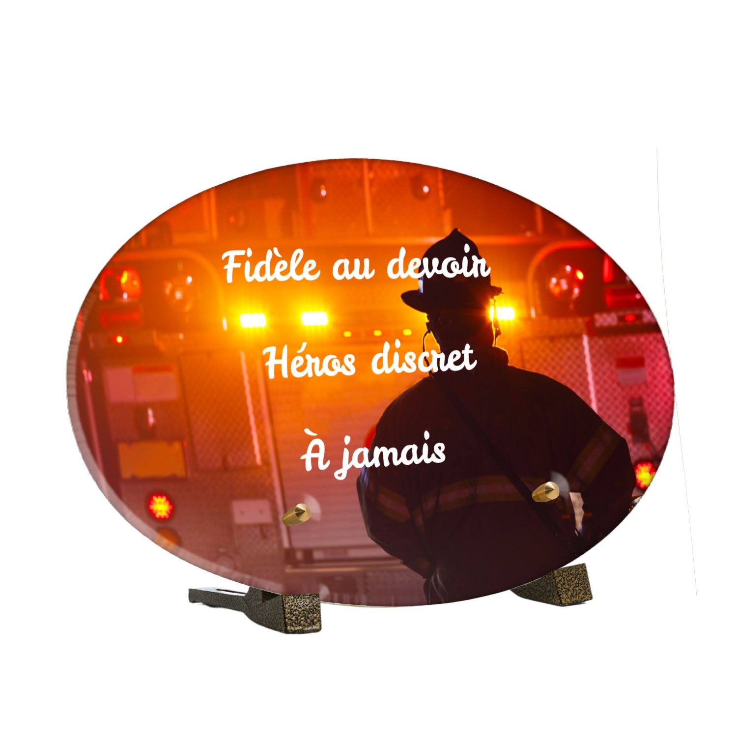 Cette plaque funéraire personnalisée rend hommage aux pompiers avec un design sobre et élégant. Réalisée en plexiglas, elle présente un visuel gravé représentant un casque de pompier et une lance d'incendie, symboles forts du courage et du dévouement. Ce modèle combine à la fois la modernité et le respect, faisant de cette plaque mortuaire un choix parfait pour une commémoration durable.