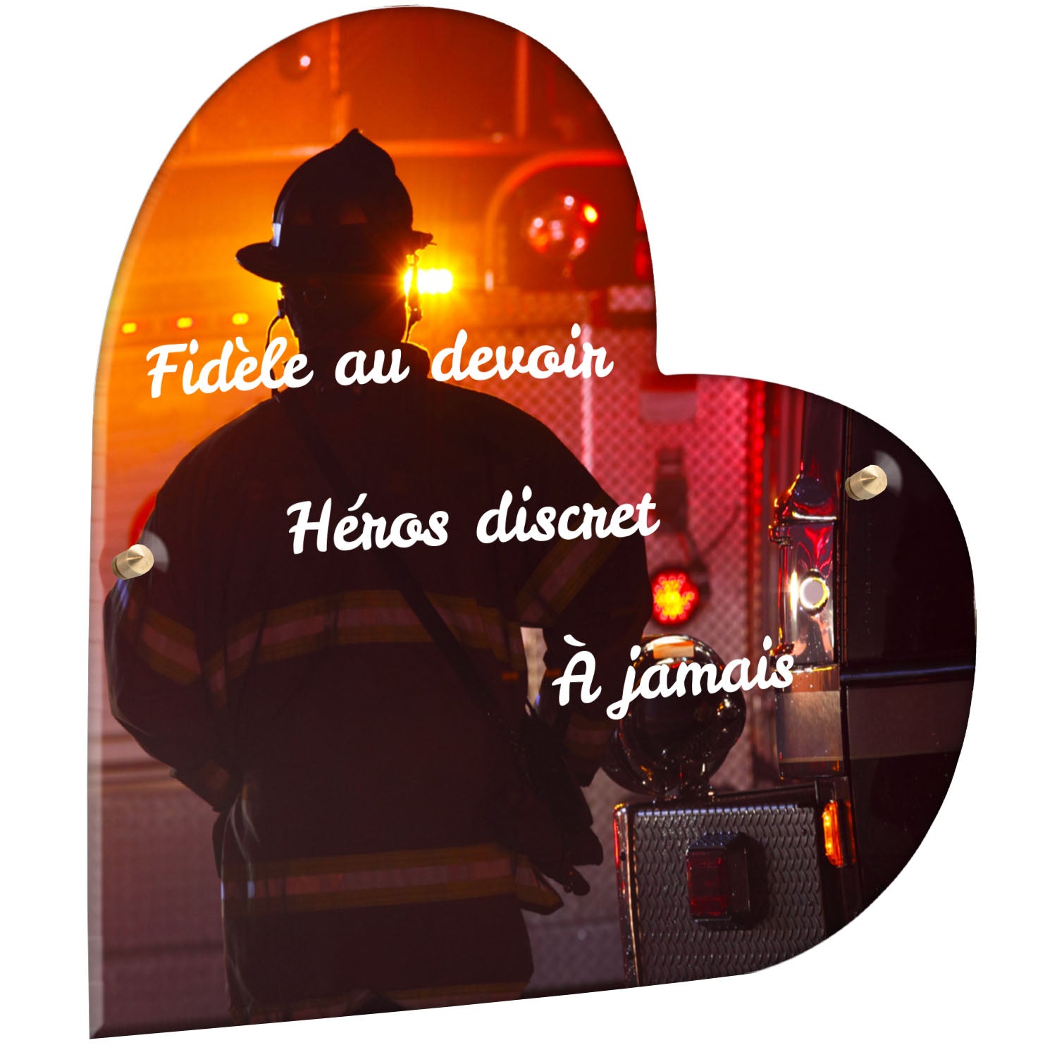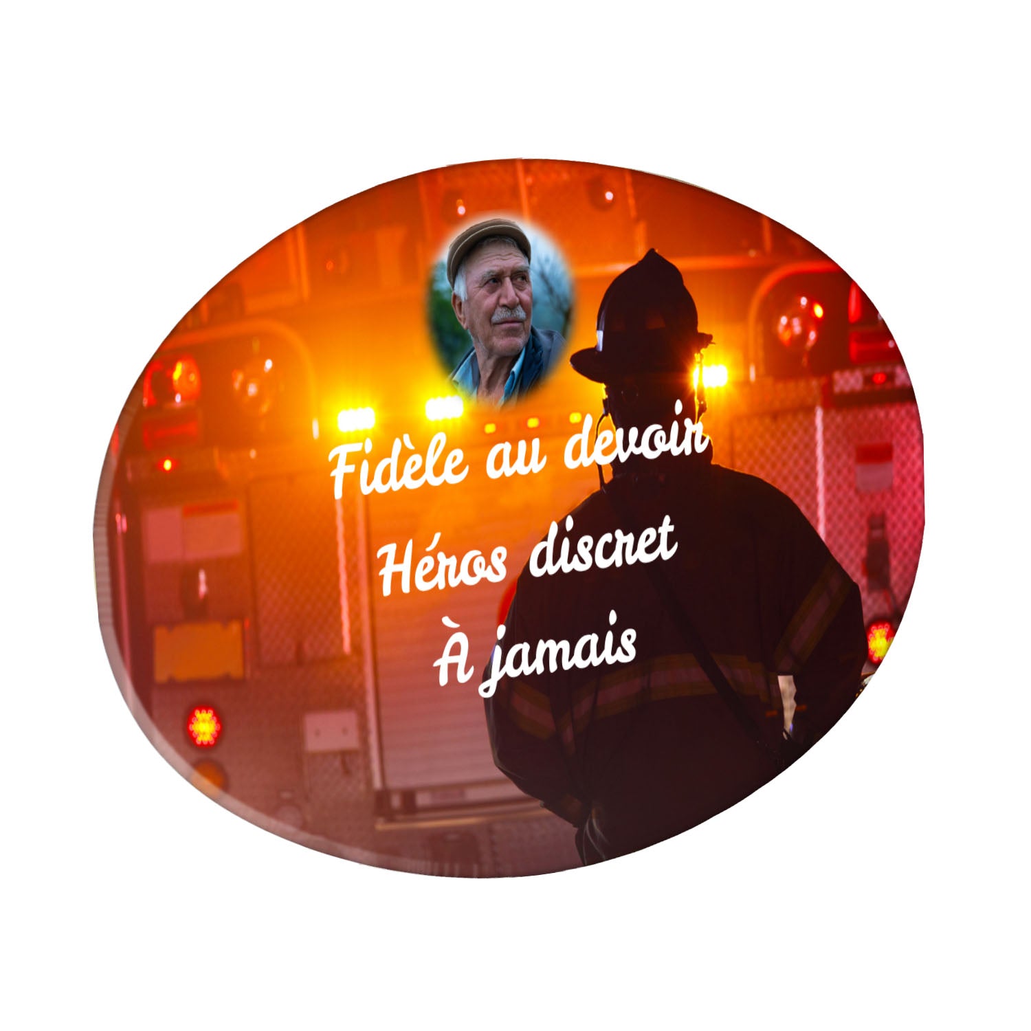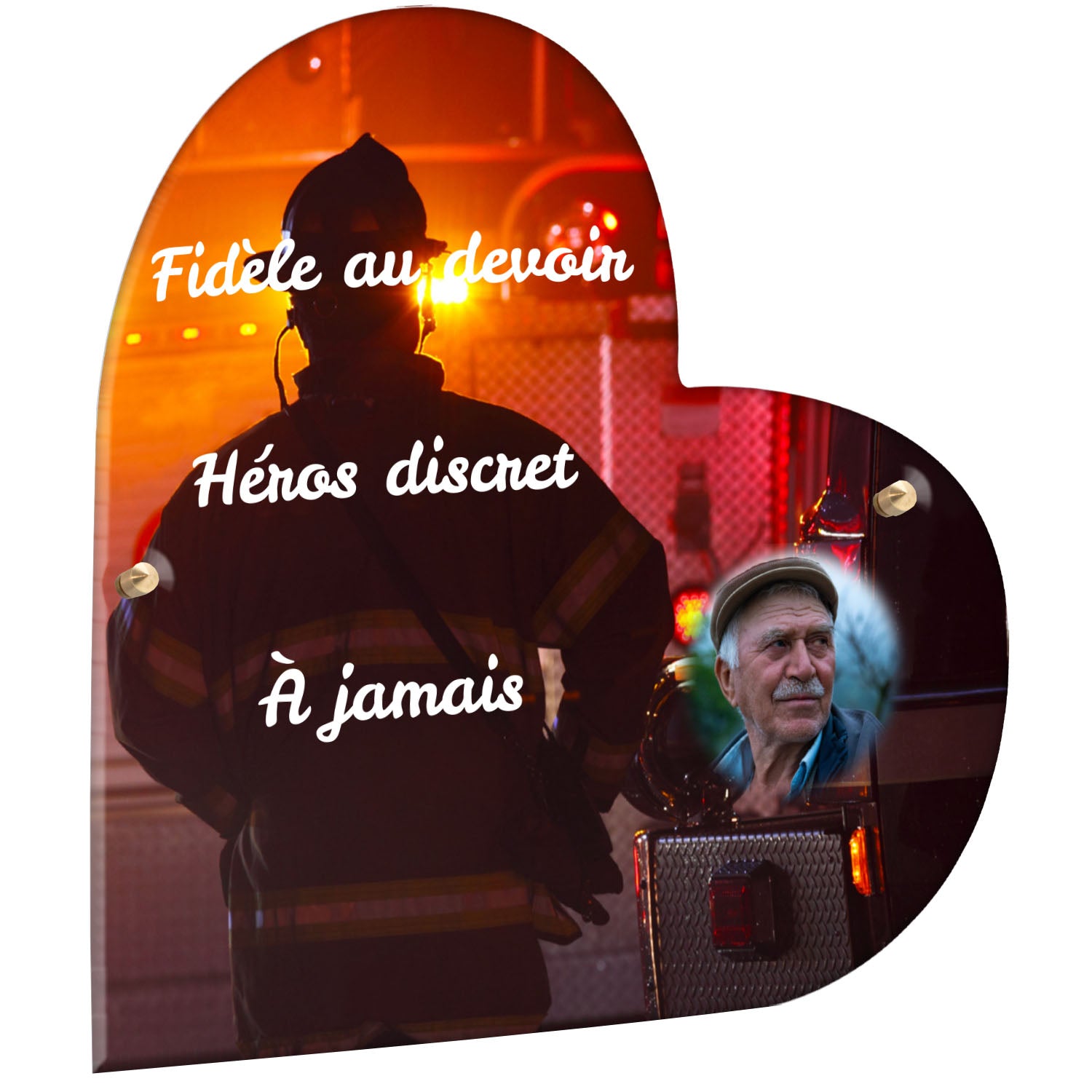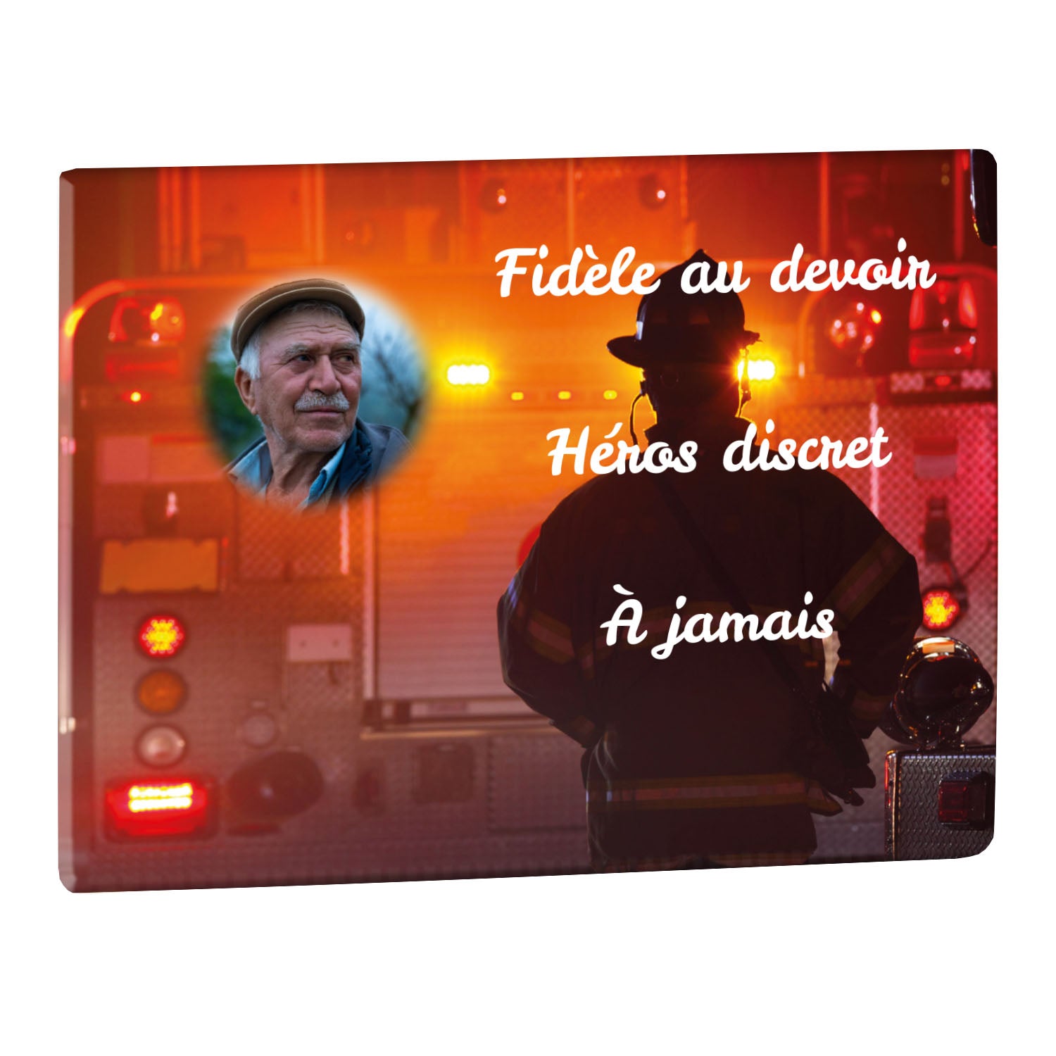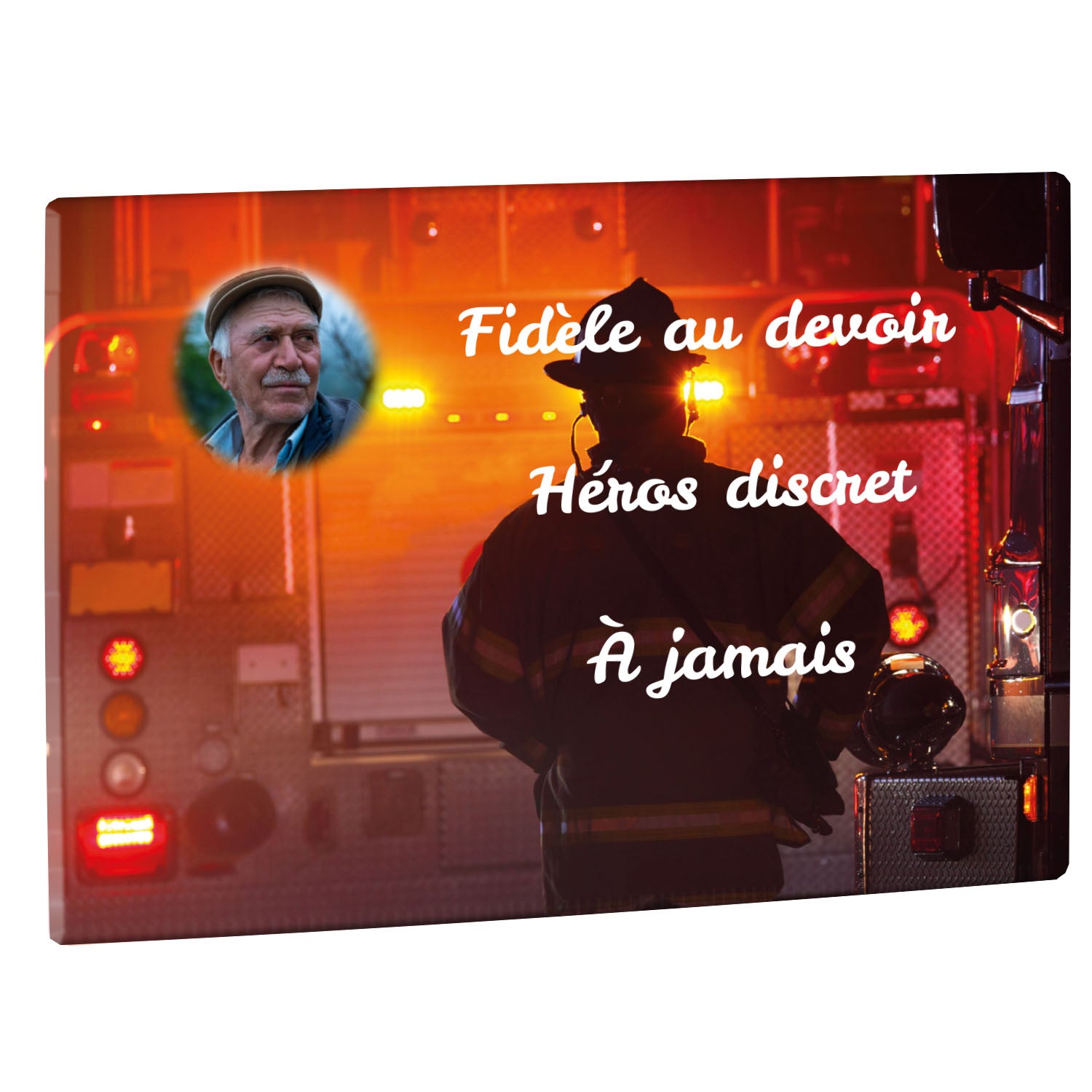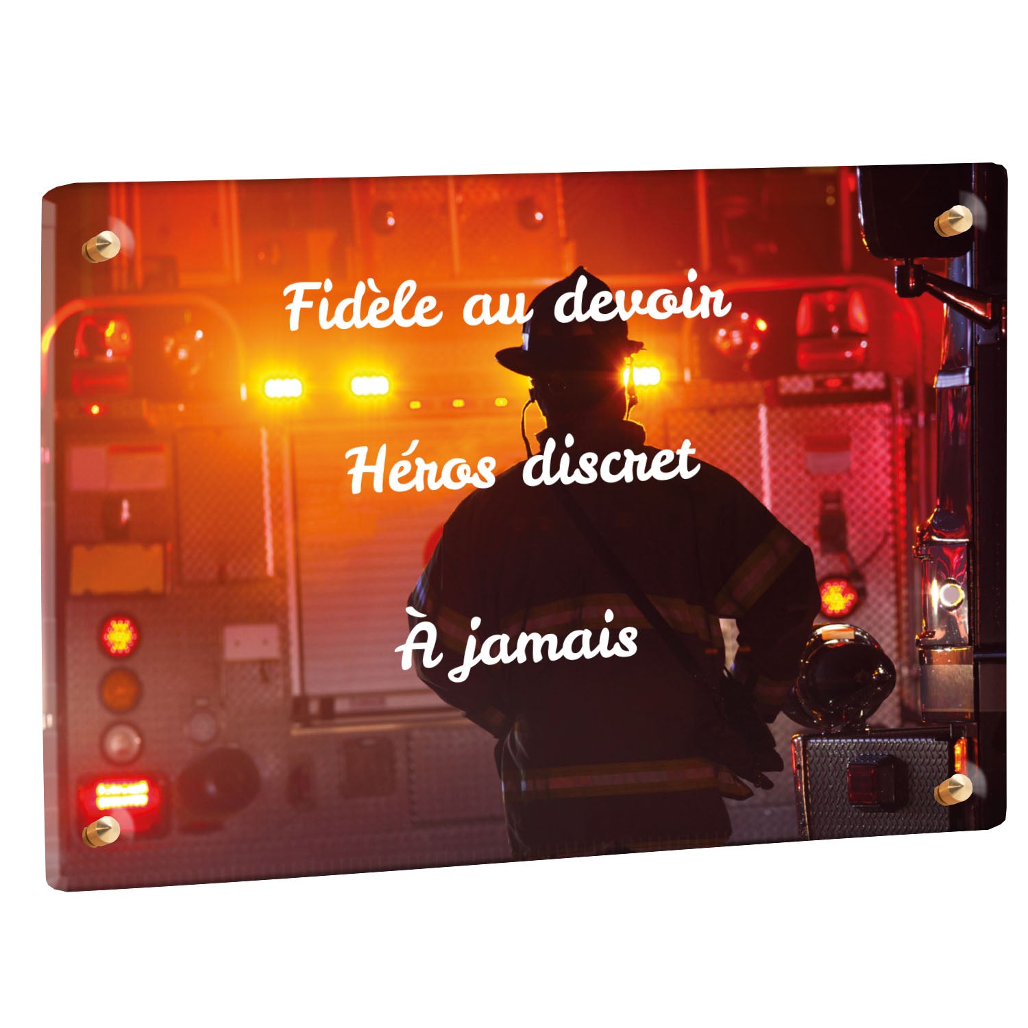 Cette plaque funéraire personnalisée rend hommage aux pompiers avec un design sobre et élégant. Réalisée en plexiglas, elle présente un visuel gravé représentant un casque de pompier et une lance d'incendie, symboles forts du courage et du dévouement. Ce modèle combine à la fois la modernité et le respect, faisant de cette plaque mortuaire un choix parfait pour une commémoration durable.