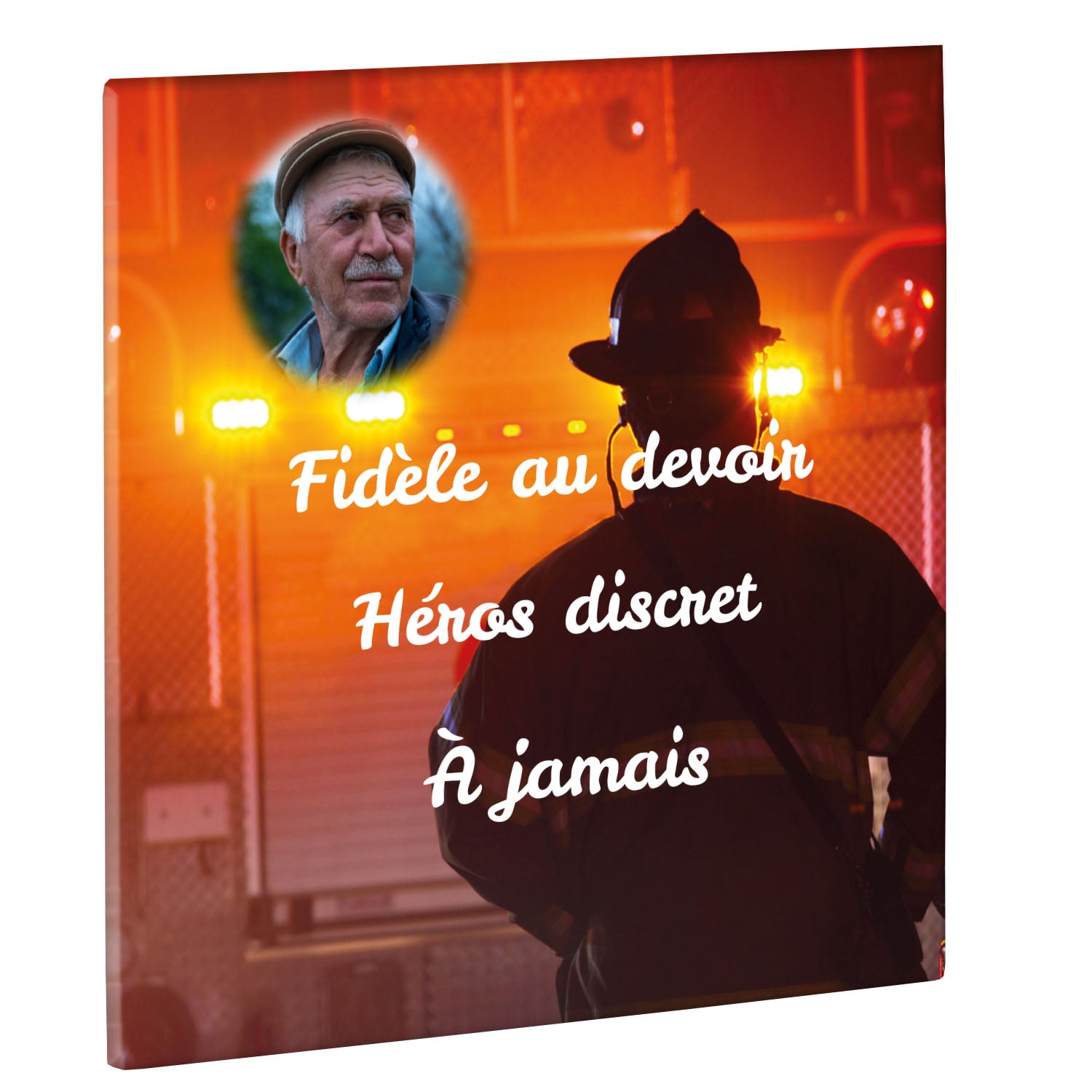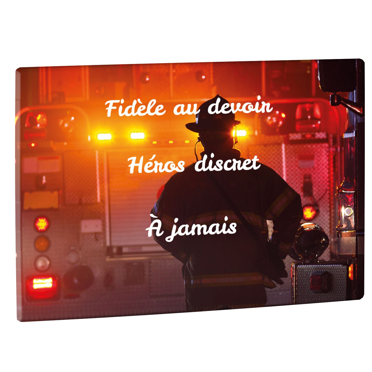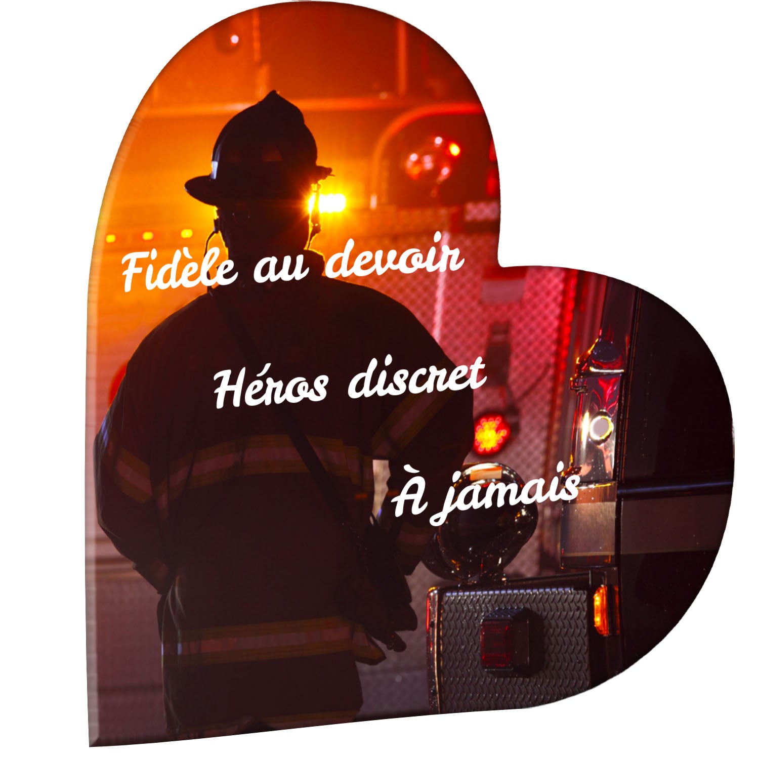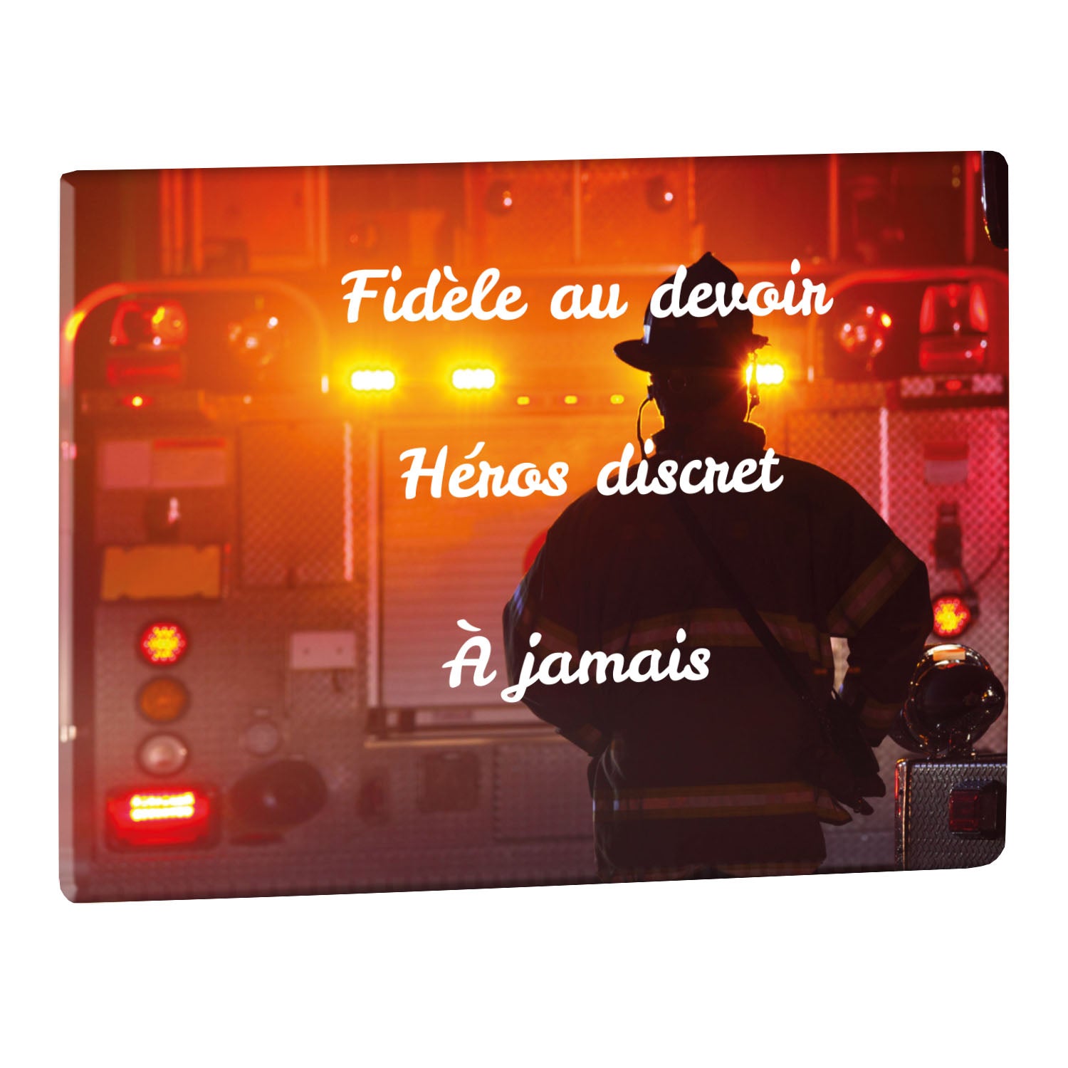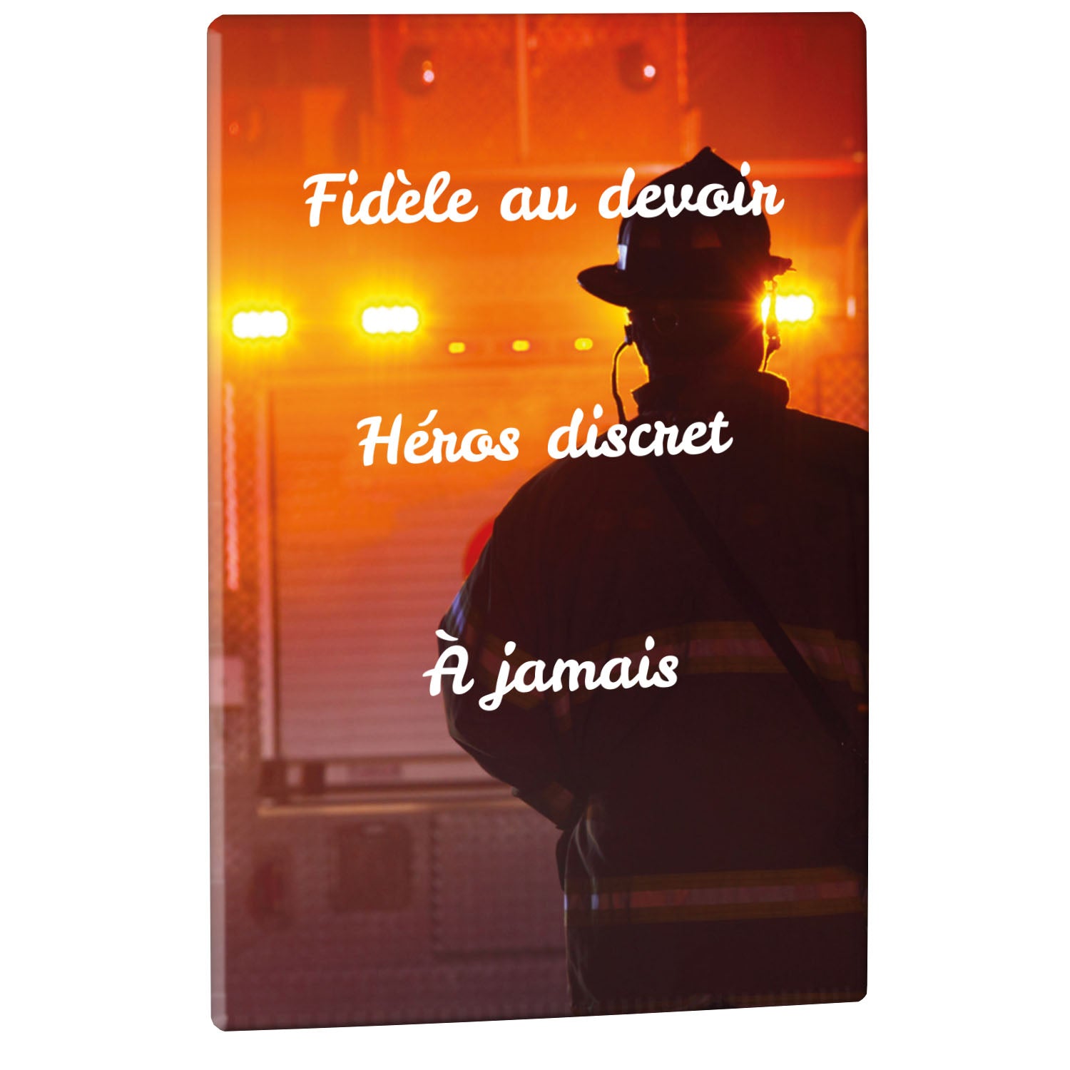 Cette plaque funéraire personnalisée rend hommage aux pompiers avec un design sobre et élégant. Réalisée en plexiglas, elle présente un visuel gravé représentant un casque de pompier et une lance d'incendie, symboles forts du courage et du dévouement. Ce modèle combine à la fois la modernité et le respect, faisant de cette plaque mortuaire un choix parfait pour une commémoration durable.