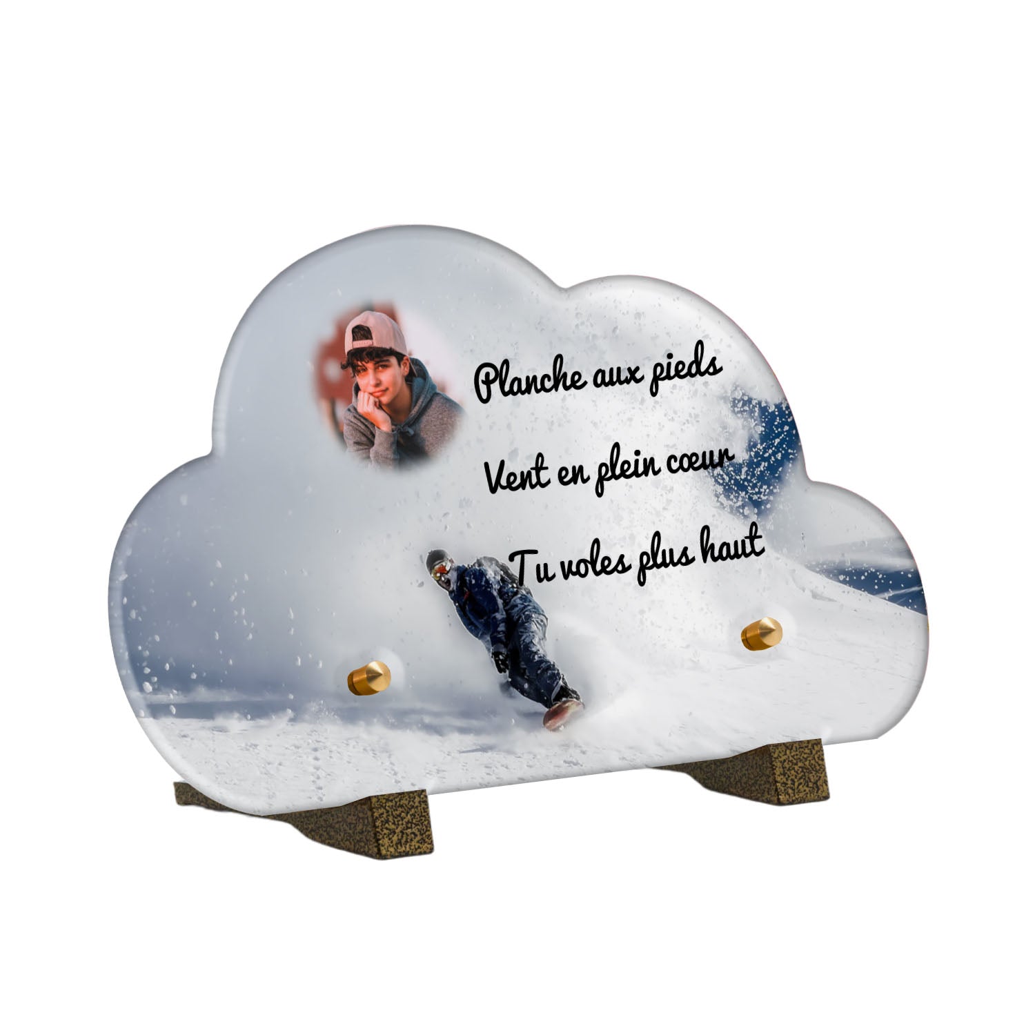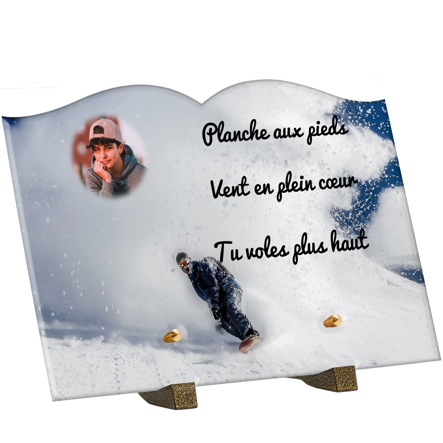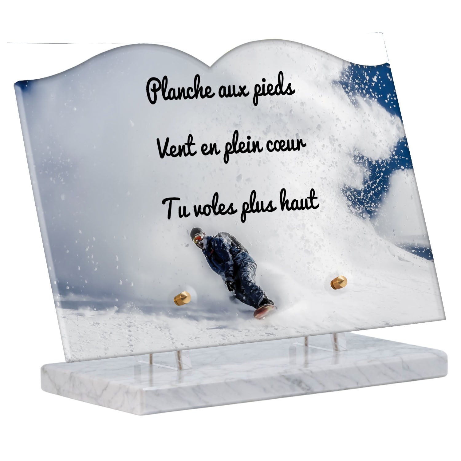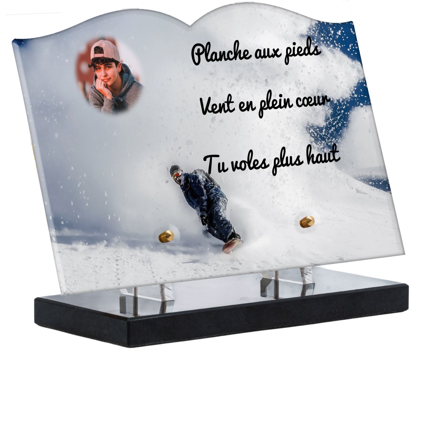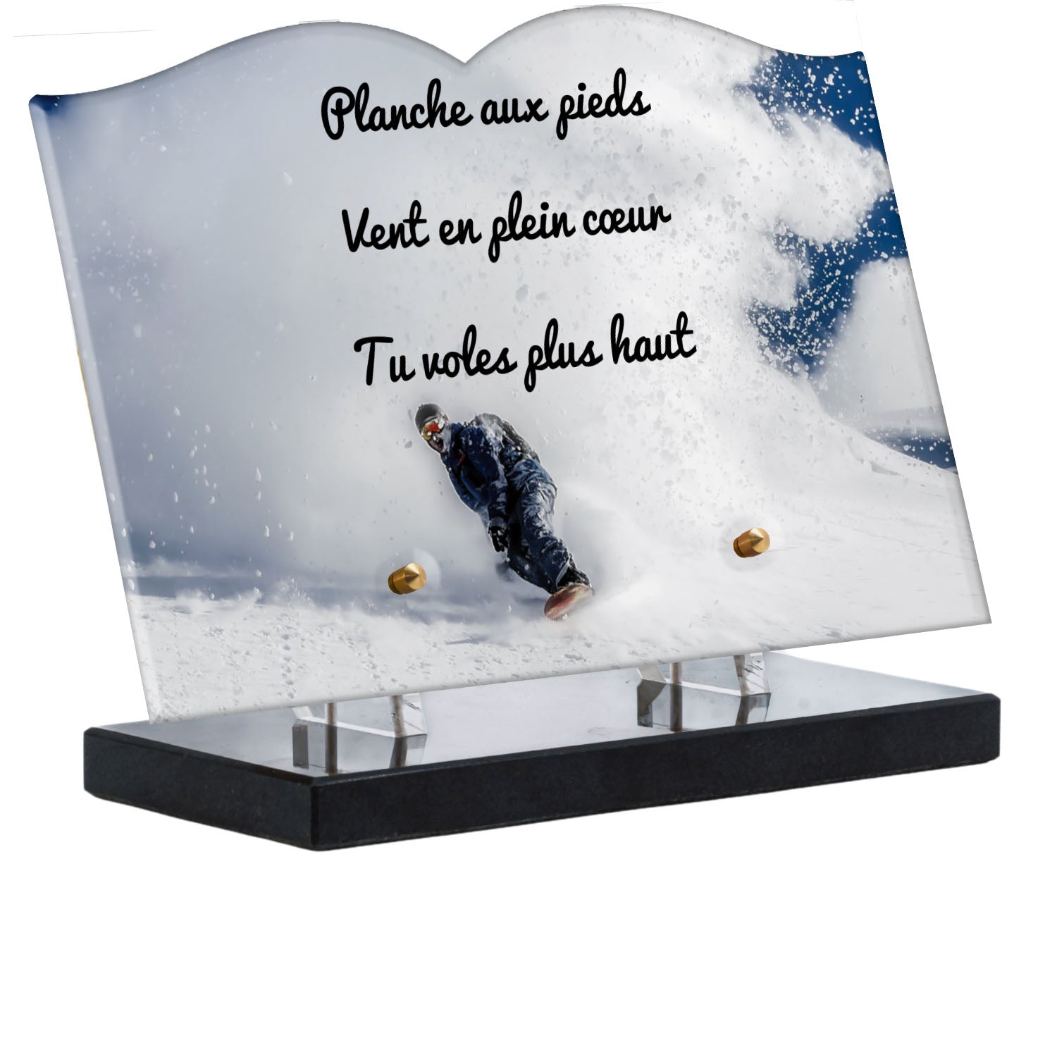 Offrez un hommage unique avec cette plaque funéraire personnalisée représentant un snowboarder, parfaite pour rendre hommage à un passionné de sports d’hiver. Cette plaque mortuaire allie design moderne et matériaux de qualité, intégrant une plaque funéraire plexiglas qui apporte élégance et résistance aux intempéries. Son style contemporain en fait une pièce remarquable parmi les plaques funéraires modernes.