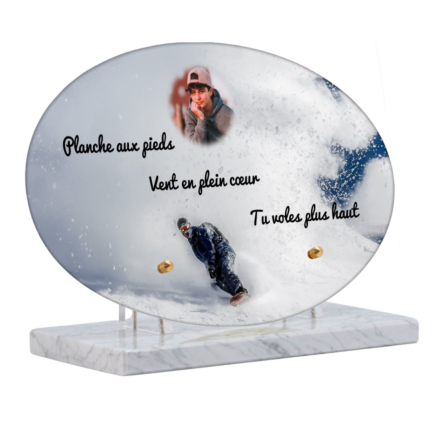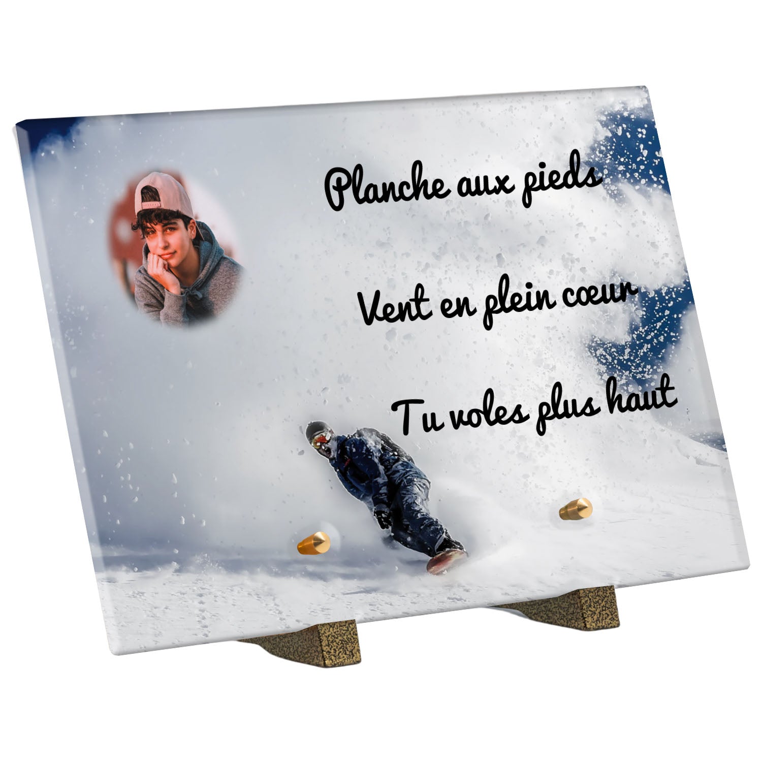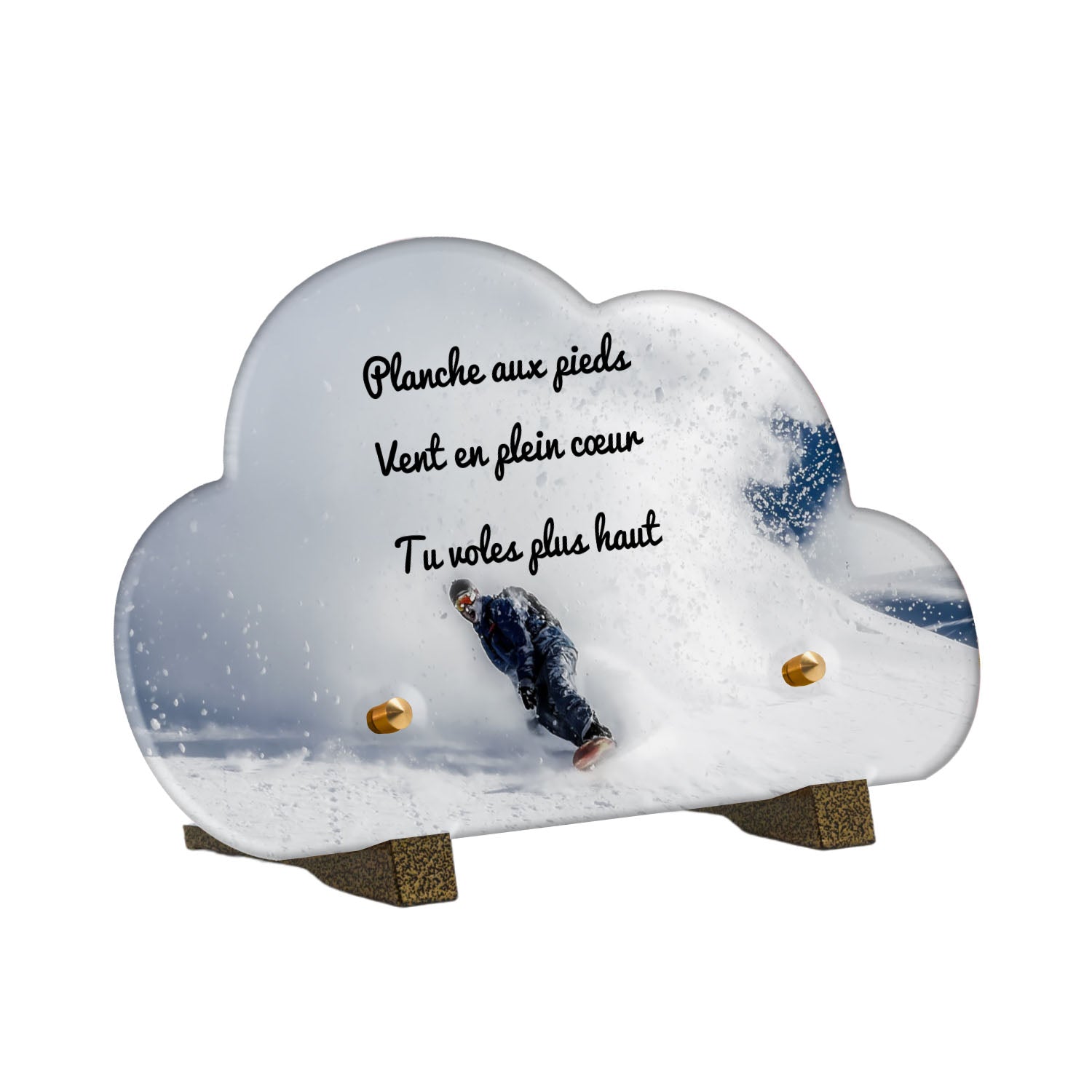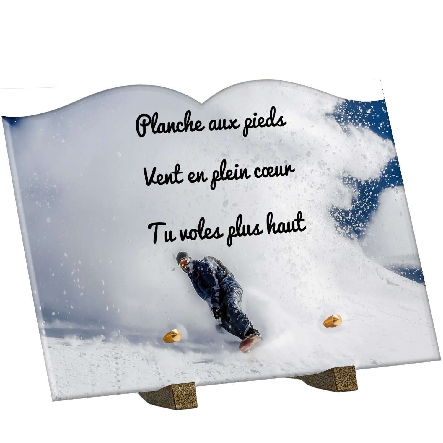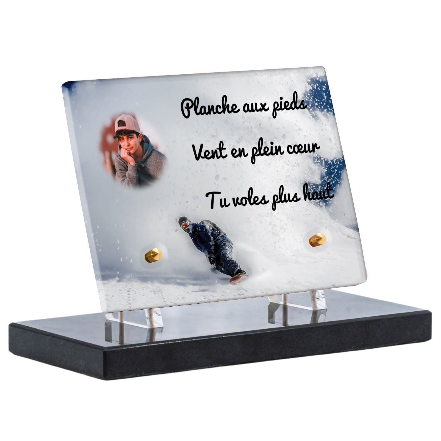 Offrez un hommage unique avec cette plaque funéraire personnalisée représentant un snowboarder, parfaite pour rendre hommage à un passionné de sports d’hiver. Cette plaque mortuaire allie design moderne et matériaux de qualité, intégrant une plaque funéraire plexiglas qui apporte élégance et résistance aux intempéries. Son style contemporain en fait une pièce remarquable parmi les plaques funéraires modernes.