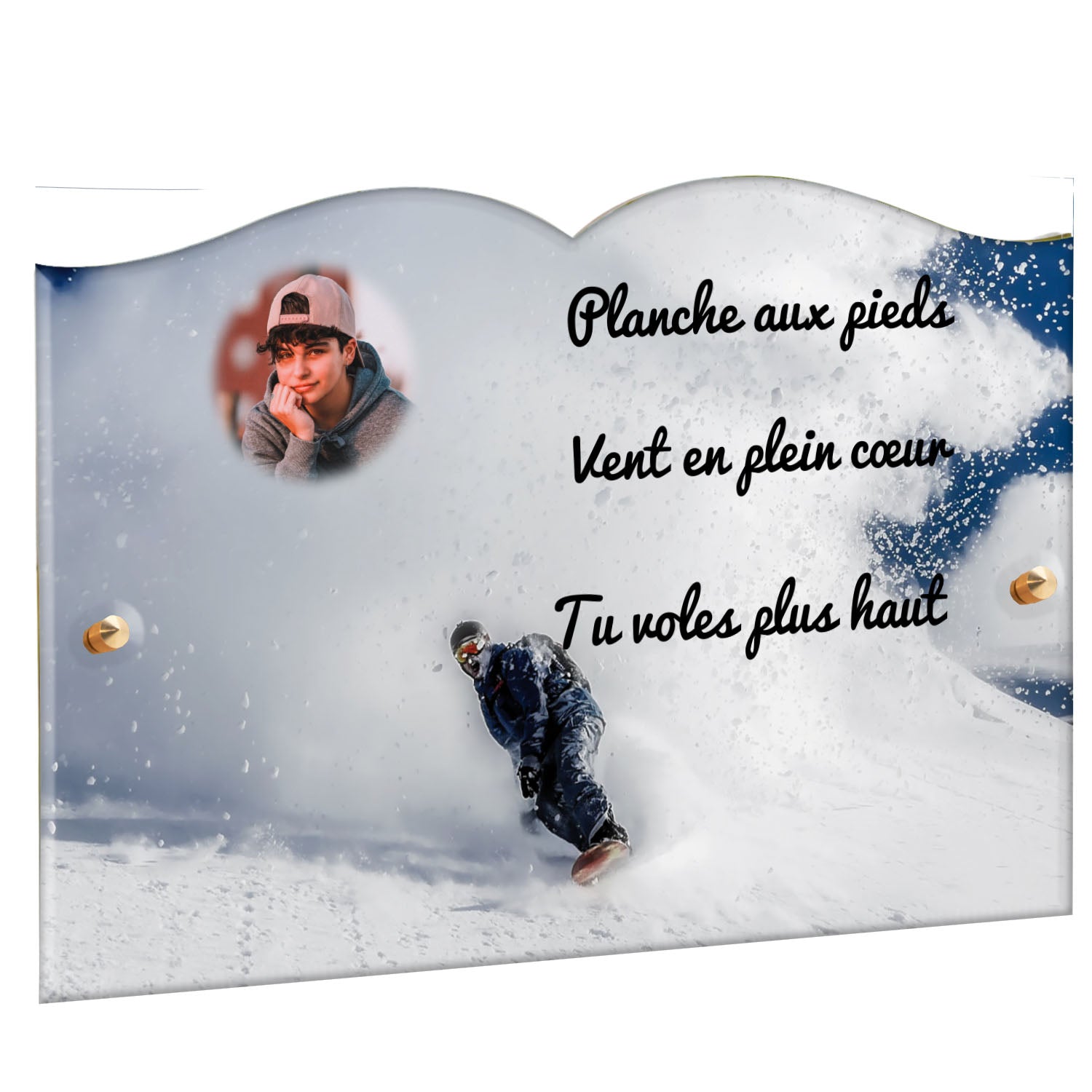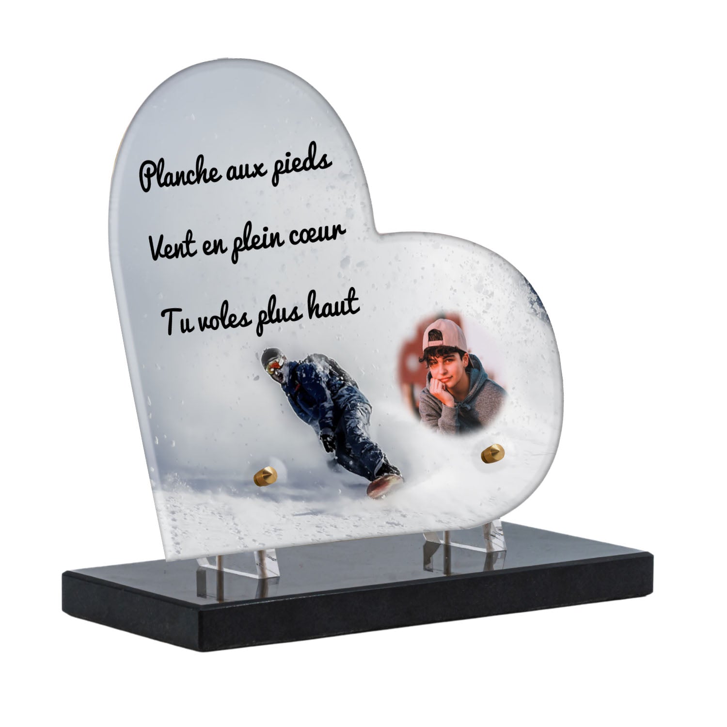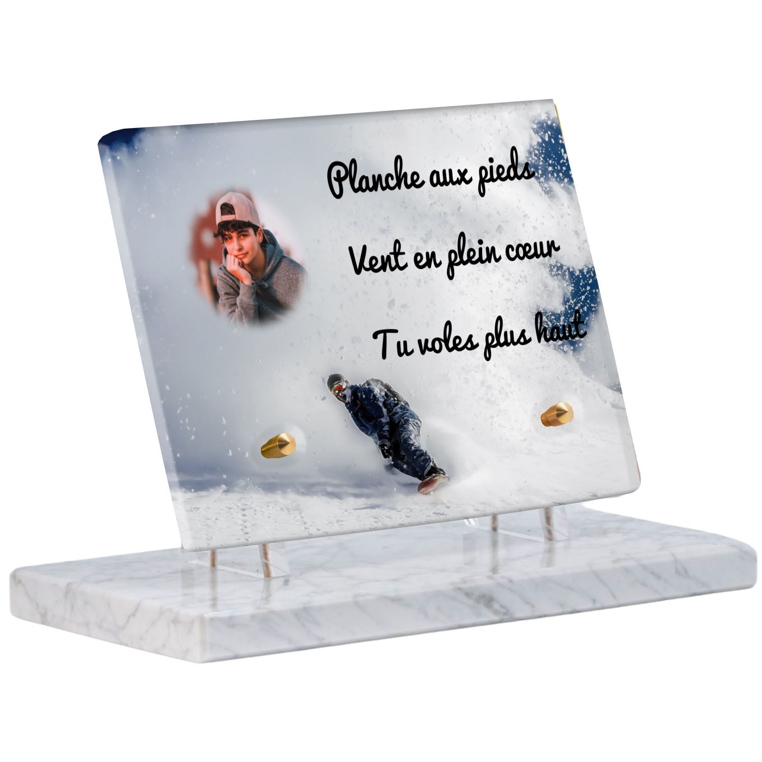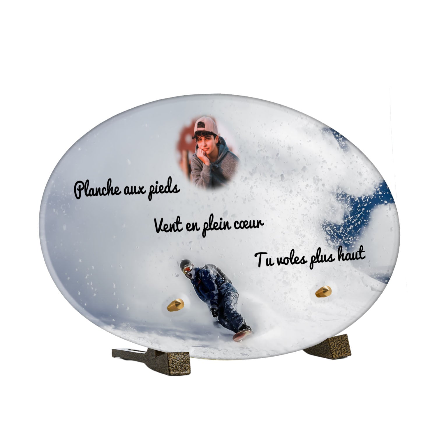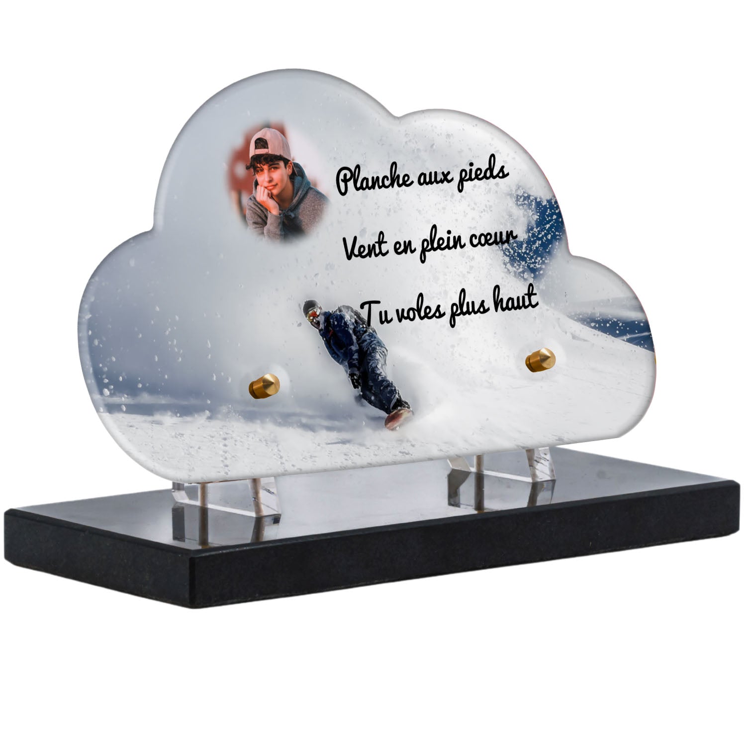 Offrez un hommage unique avec cette plaque funéraire personnalisée représentant un snowboarder, parfaite pour rendre hommage à un passionné de sports d’hiver. Cette plaque mortuaire allie design moderne et matériaux de qualité, intégrant une plaque funéraire plexiglas qui apporte élégance et résistance aux intempéries. Son style contemporain en fait une pièce remarquable parmi les plaques funéraires modernes.