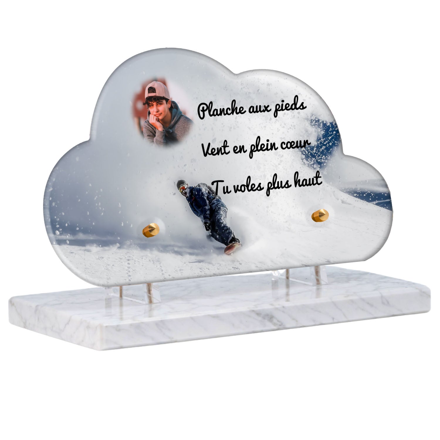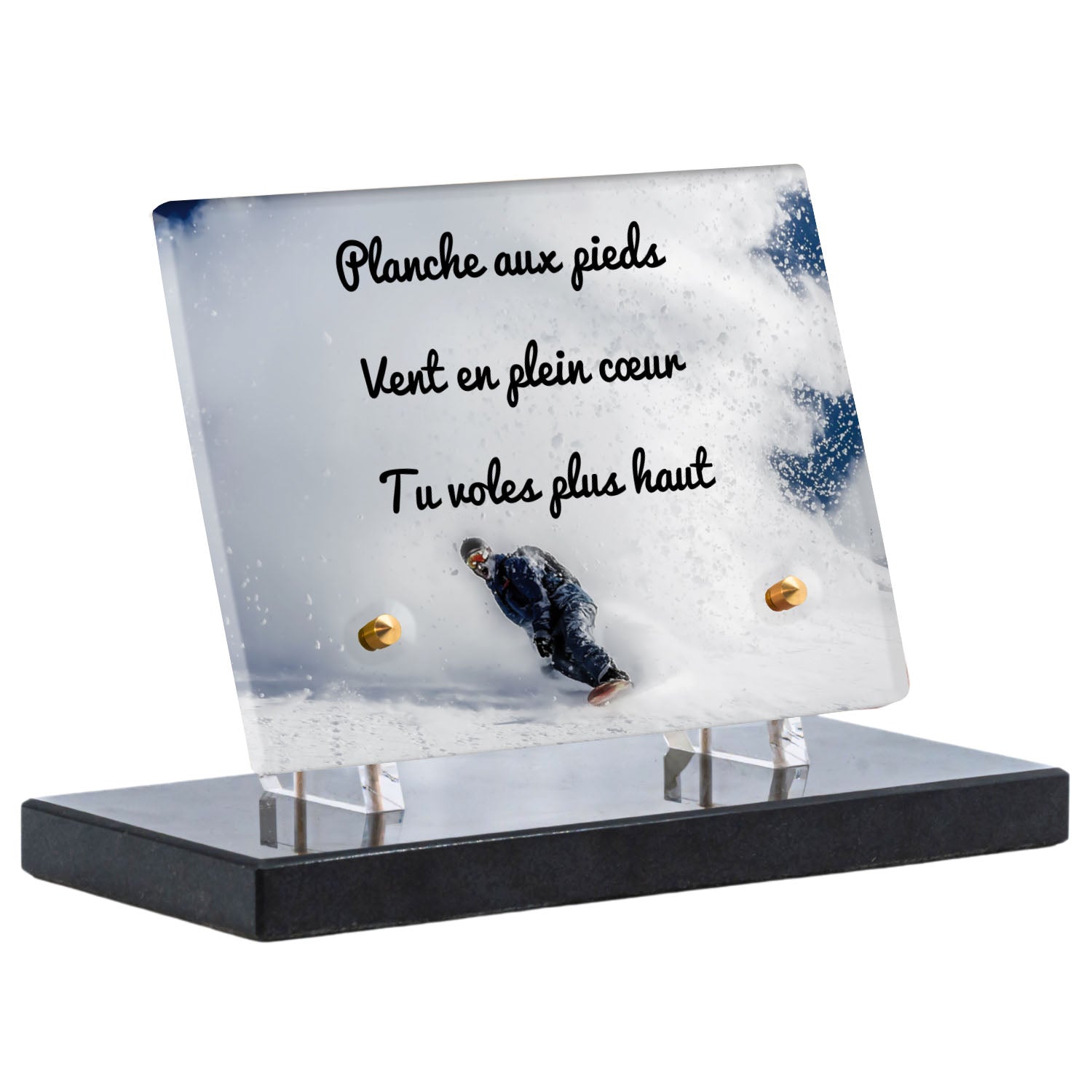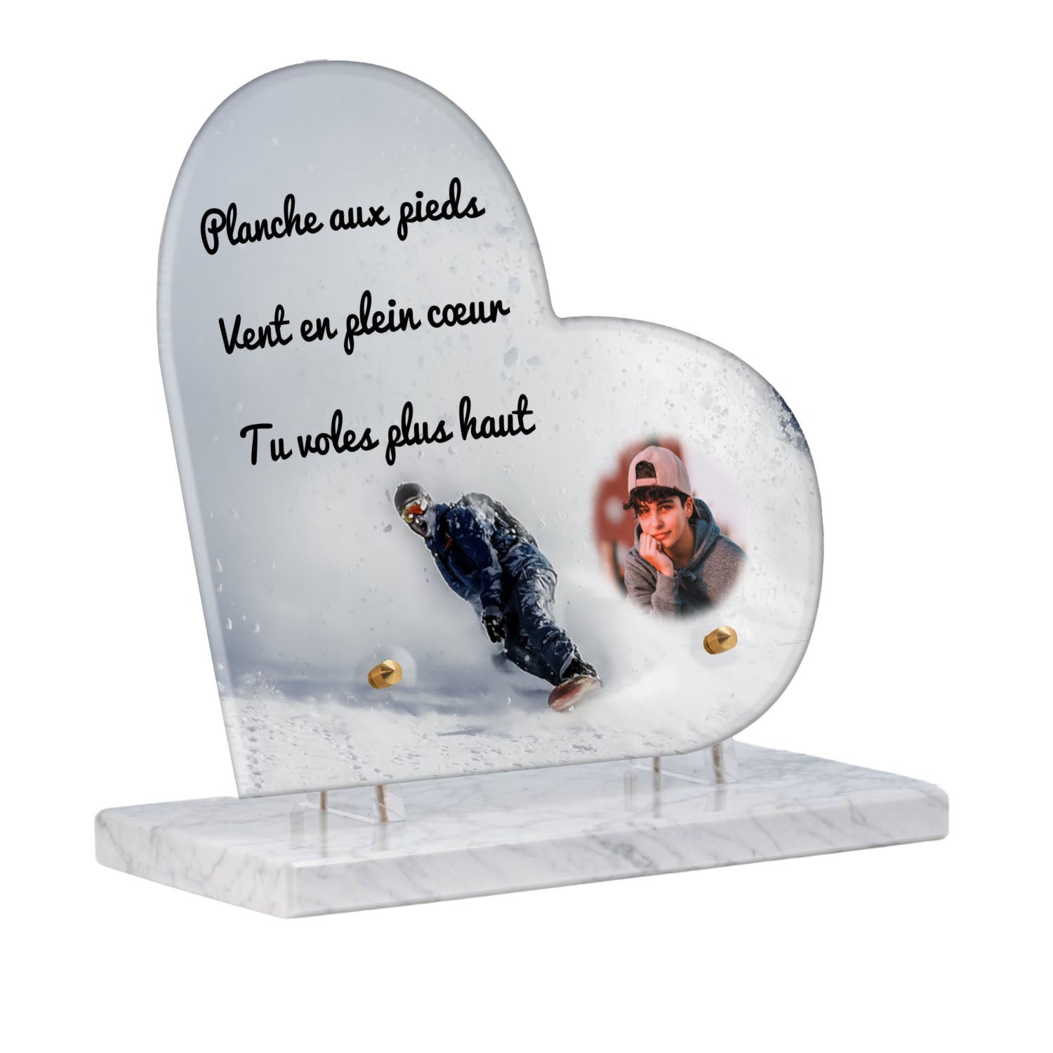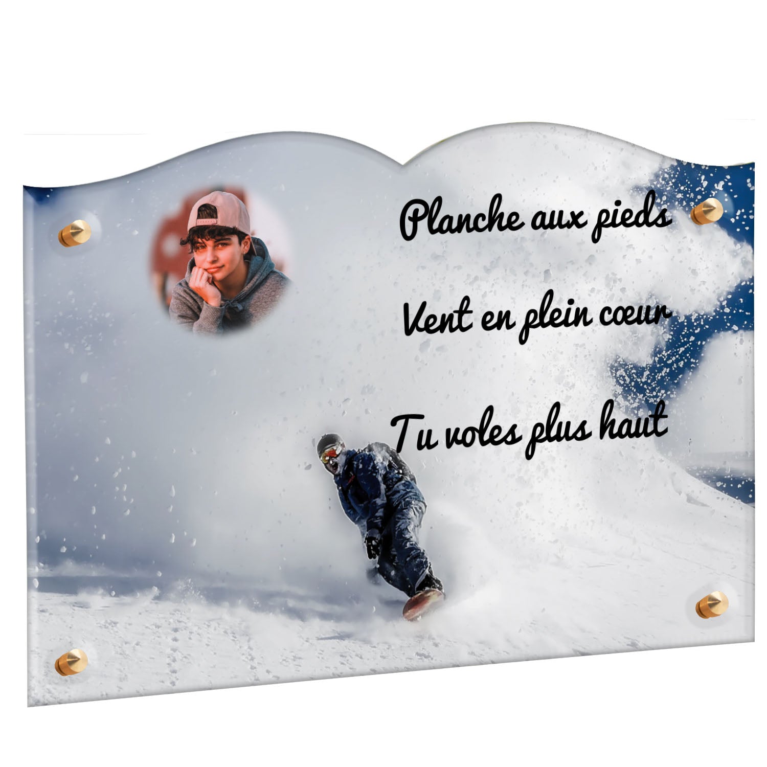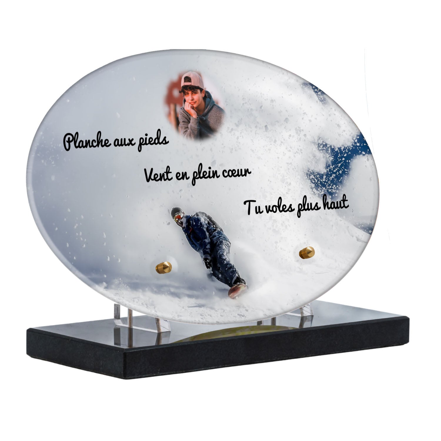 Offrez un hommage unique avec cette plaque funéraire personnalisée représentant un snowboarder, parfaite pour rendre hommage à un passionné de sports d’hiver. Cette plaque mortuaire allie design moderne et matériaux de qualité, intégrant une plaque funéraire plexiglas qui apporte élégance et résistance aux intempéries. Son style contemporain en fait une pièce remarquable parmi les plaques funéraires modernes.