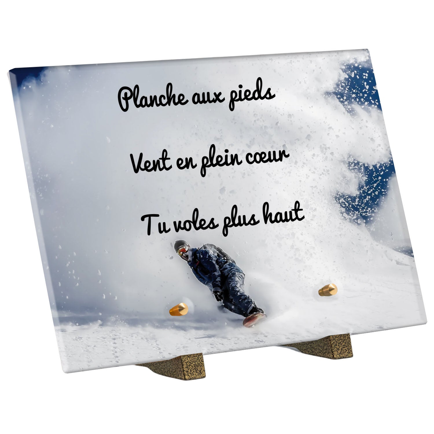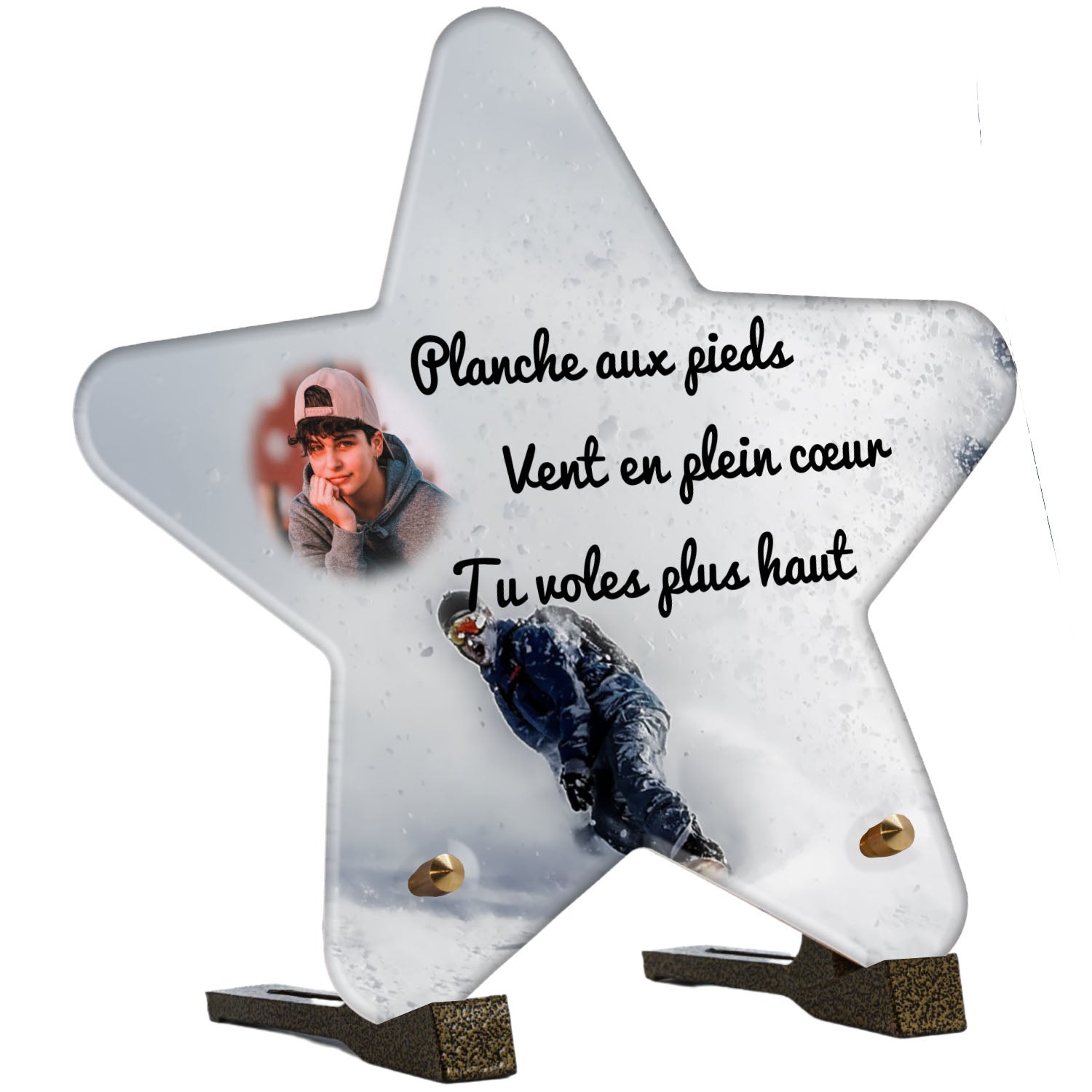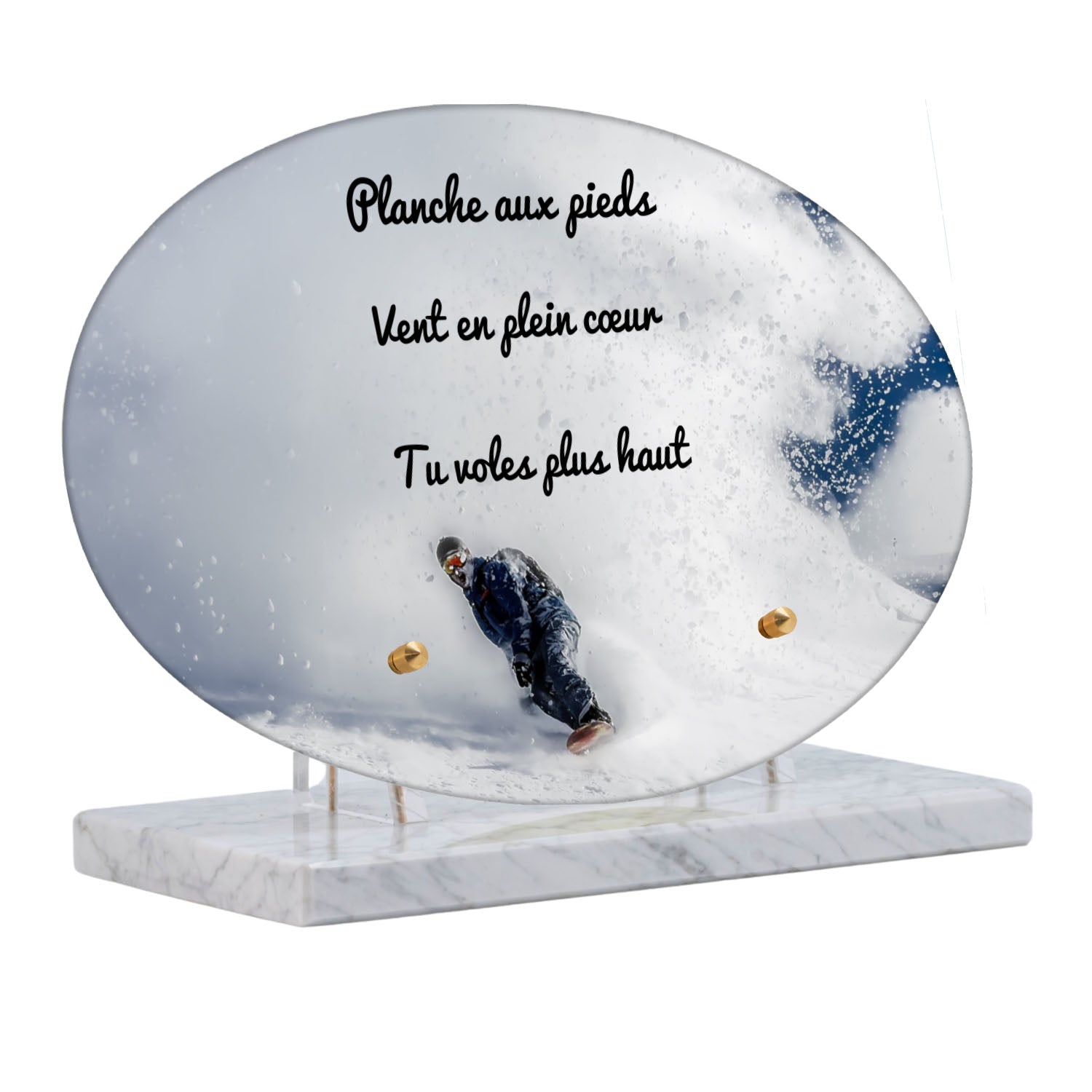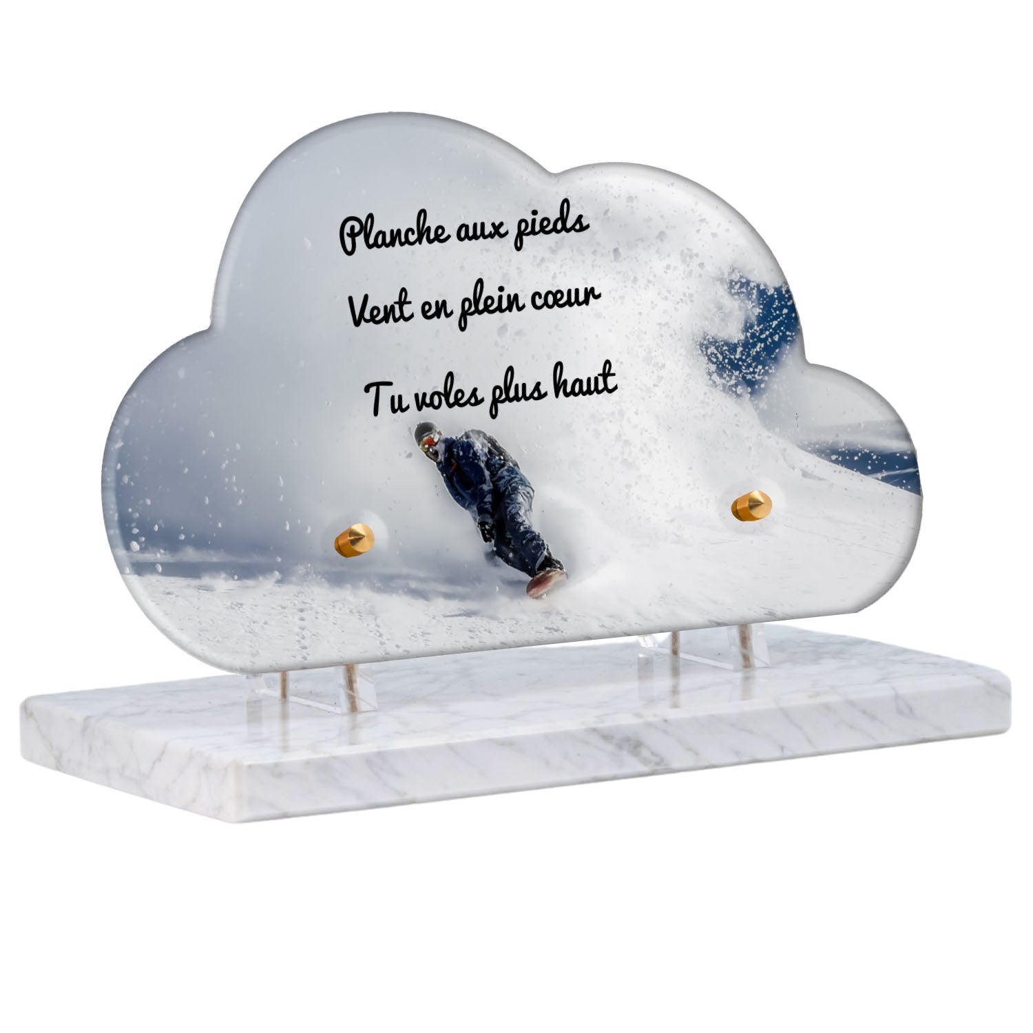 Offrez un hommage unique avec cette plaque funéraire personnalisée représentant un snowboarder, parfaite pour rendre hommage à un passionné de sports d’hiver. Cette plaque mortuaire allie design moderne et matériaux de qualité, intégrant une plaque funéraire plexiglas qui apporte élégance et résistance aux intempéries. Son style contemporain en fait une pièce remarquable parmi les plaques funéraires modernes.