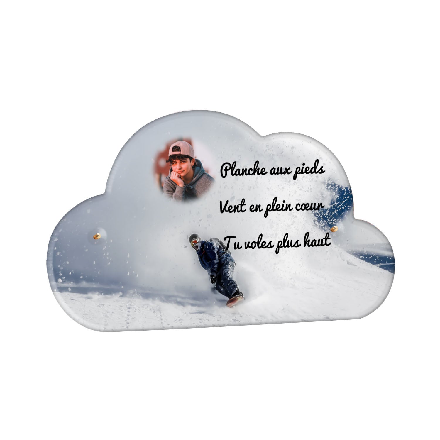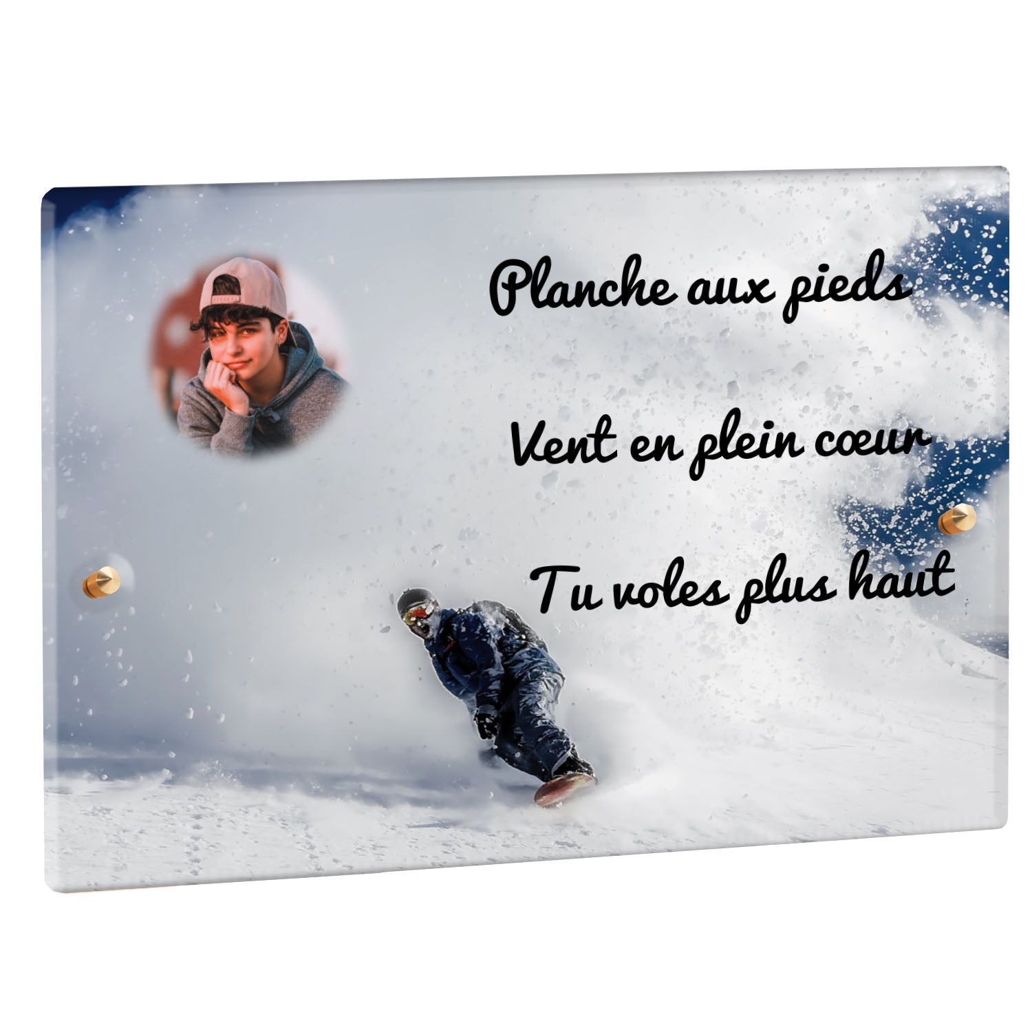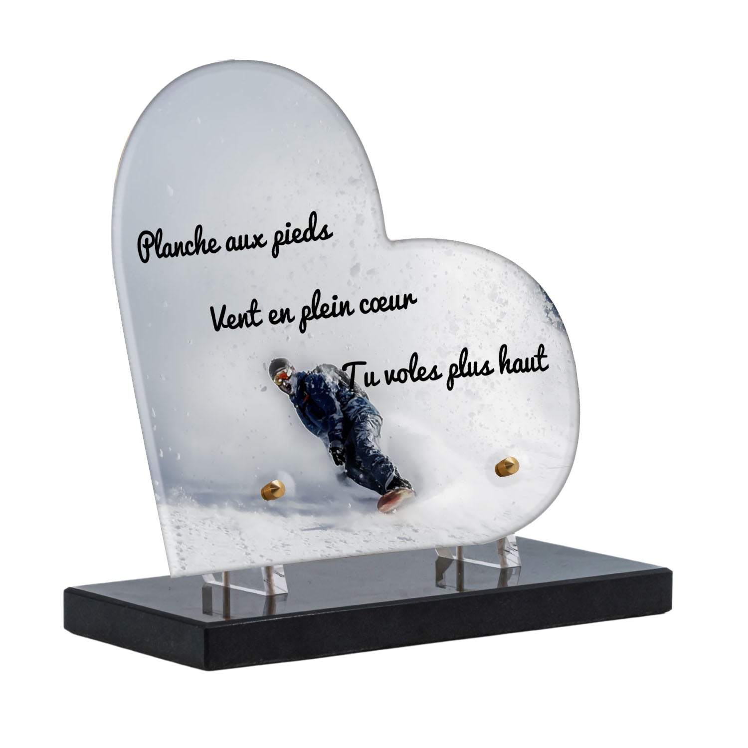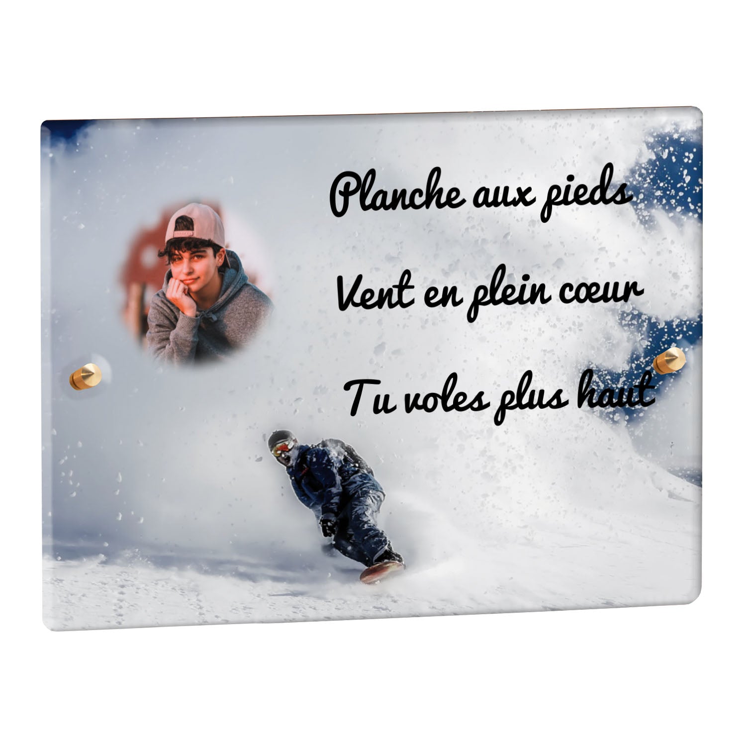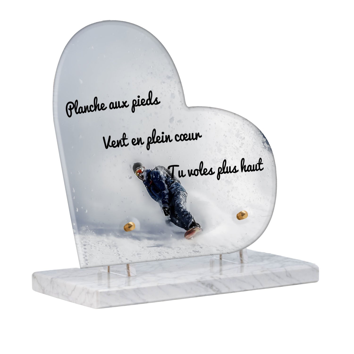 Offrez un hommage unique avec cette plaque funéraire personnalisée représentant un snowboarder, parfaite pour rendre hommage à un passionné de sports d’hiver. Cette plaque mortuaire allie design moderne et matériaux de qualité, intégrant une plaque funéraire plexiglas qui apporte élégance et résistance aux intempéries. Son style contemporain en fait une pièce remarquable parmi les plaques funéraires modernes.