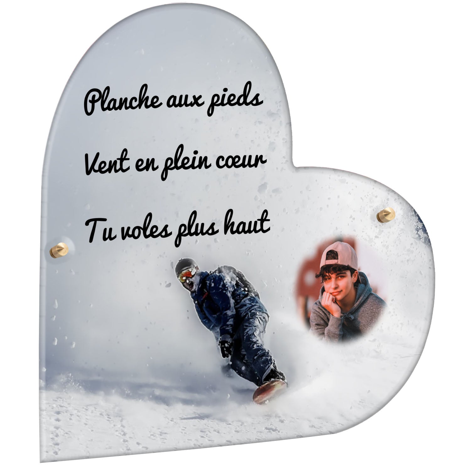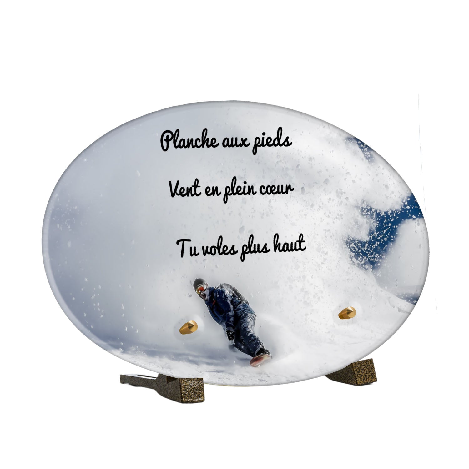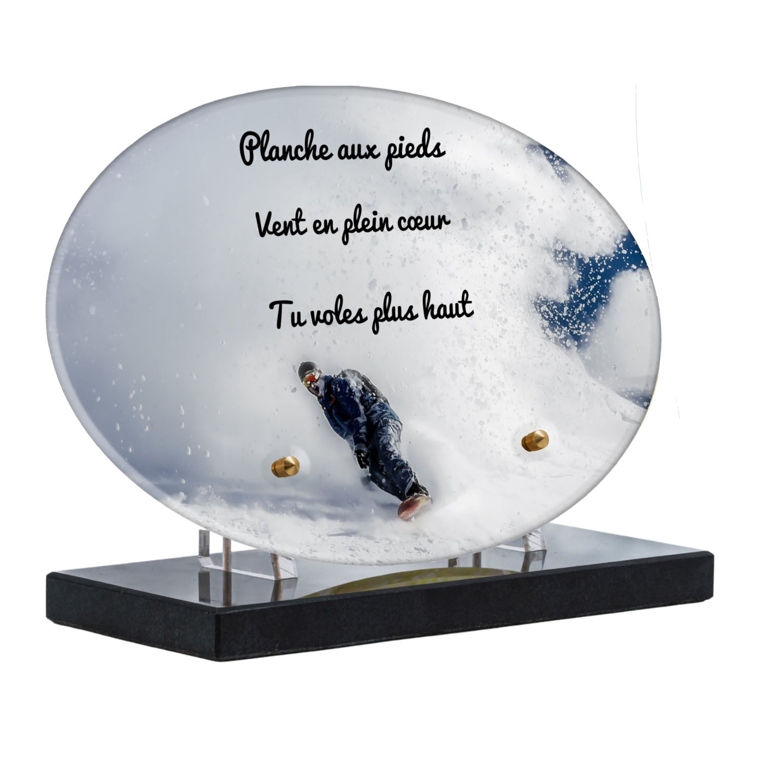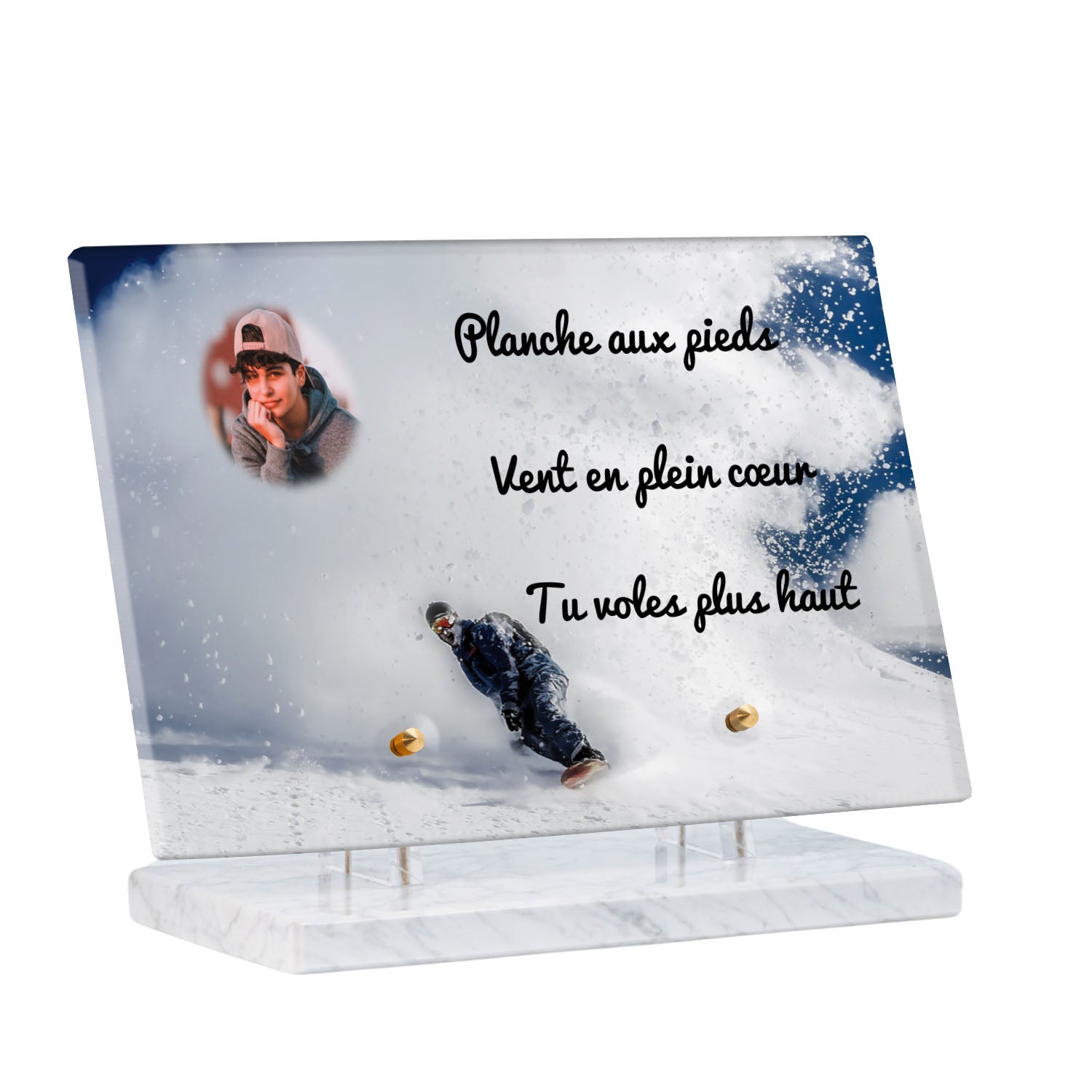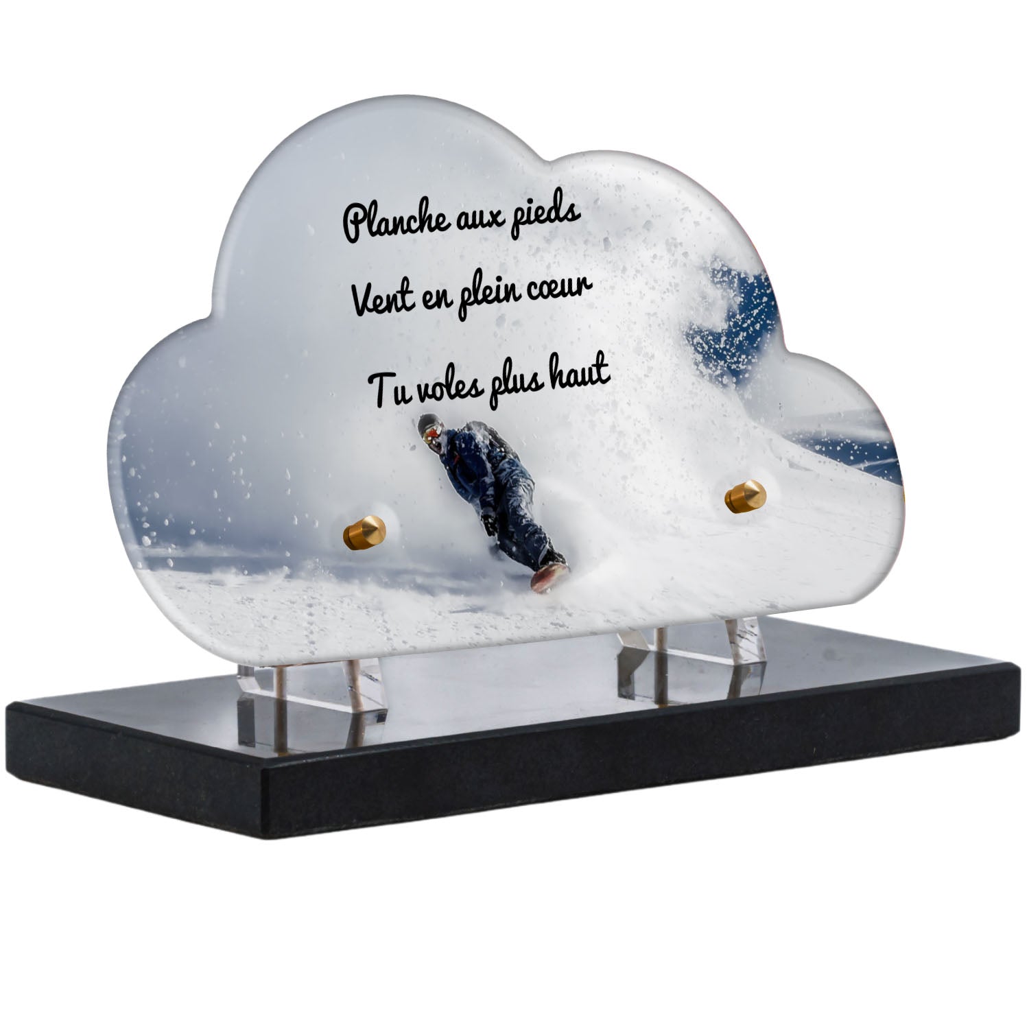 Offrez un hommage unique avec cette plaque funéraire personnalisée représentant un snowboarder, parfaite pour rendre hommage à un passionné de sports d’hiver. Cette plaque mortuaire allie design moderne et matériaux de qualité, intégrant une plaque funéraire plexiglas qui apporte élégance et résistance aux intempéries. Son style contemporain en fait une pièce remarquable parmi les plaques funéraires modernes.
